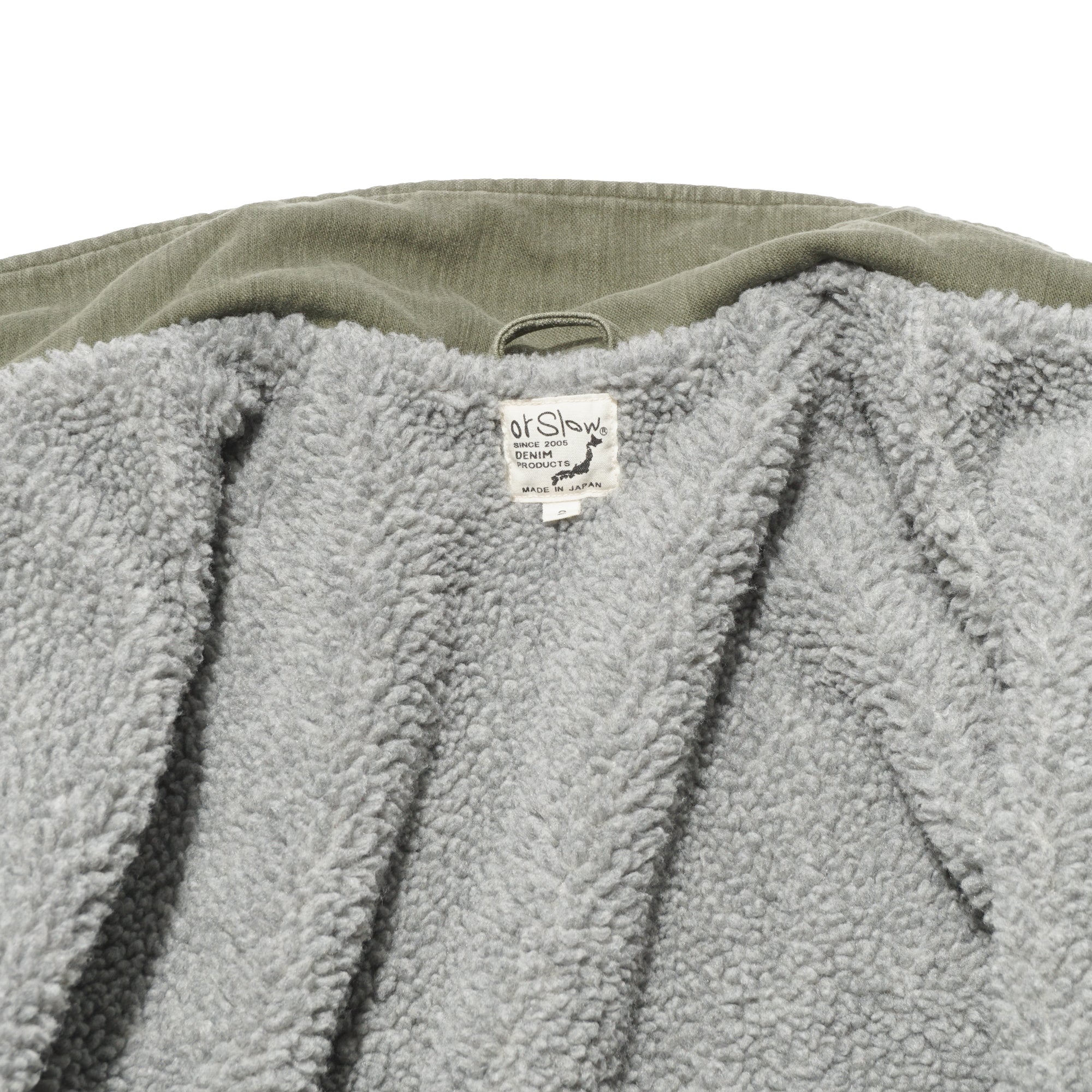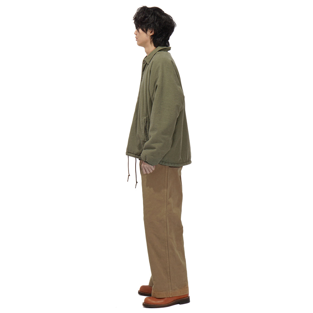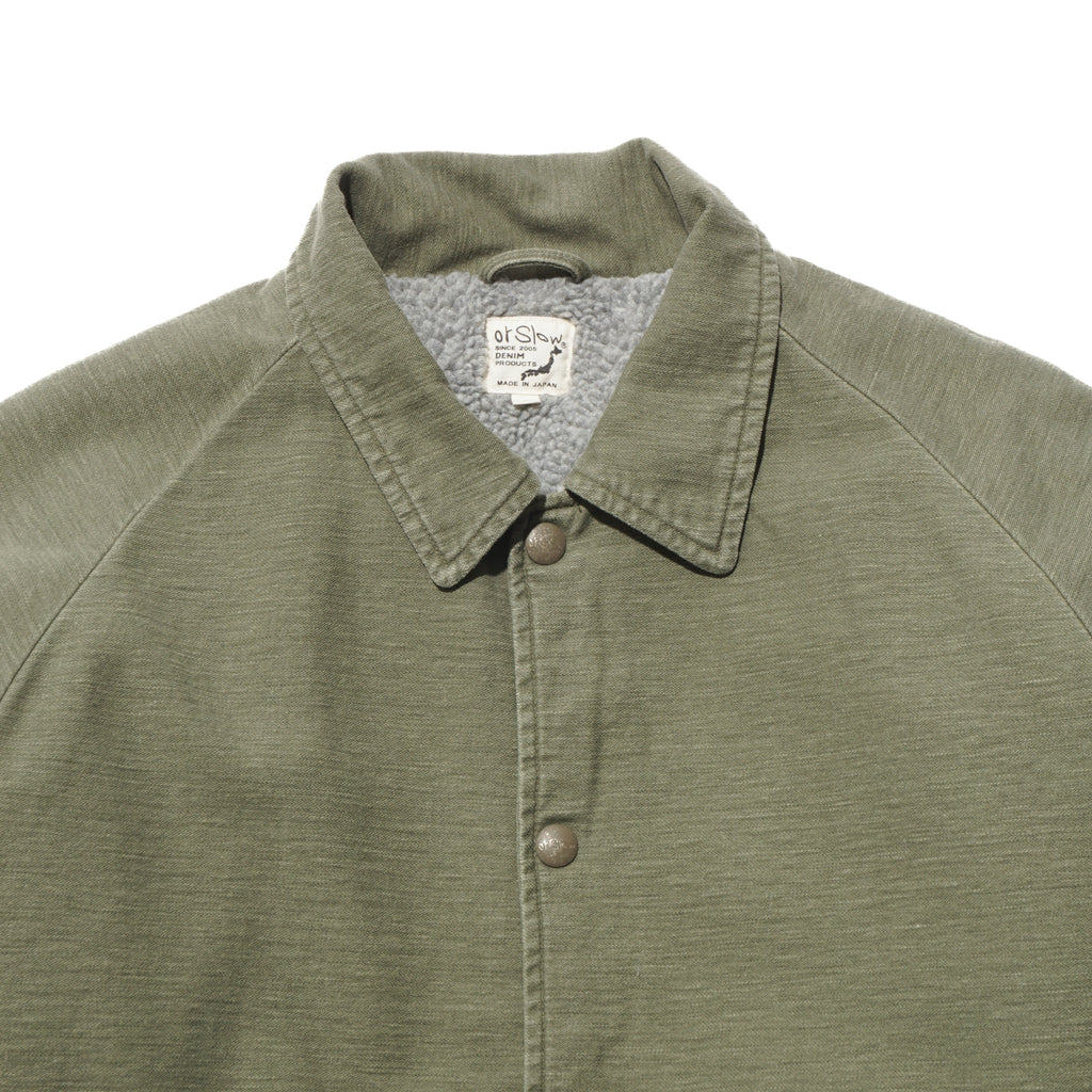 - A Japanese-made, workwear-inspired jacket that combines a classic coach silhouette with modern comfort. The exterior features a vintage-washed cotton for a worn-in, textured look, while the interior fleece lining provides warmth and softness. Designed with a relaxed fit, the jacket includes functional details such as front snap closures and side pockets making it practical for everyday wear. Its timeless style, durable construction, and cozy lining make it a versatile piece that bridges heritage workwear aesthetics with casual appeal.