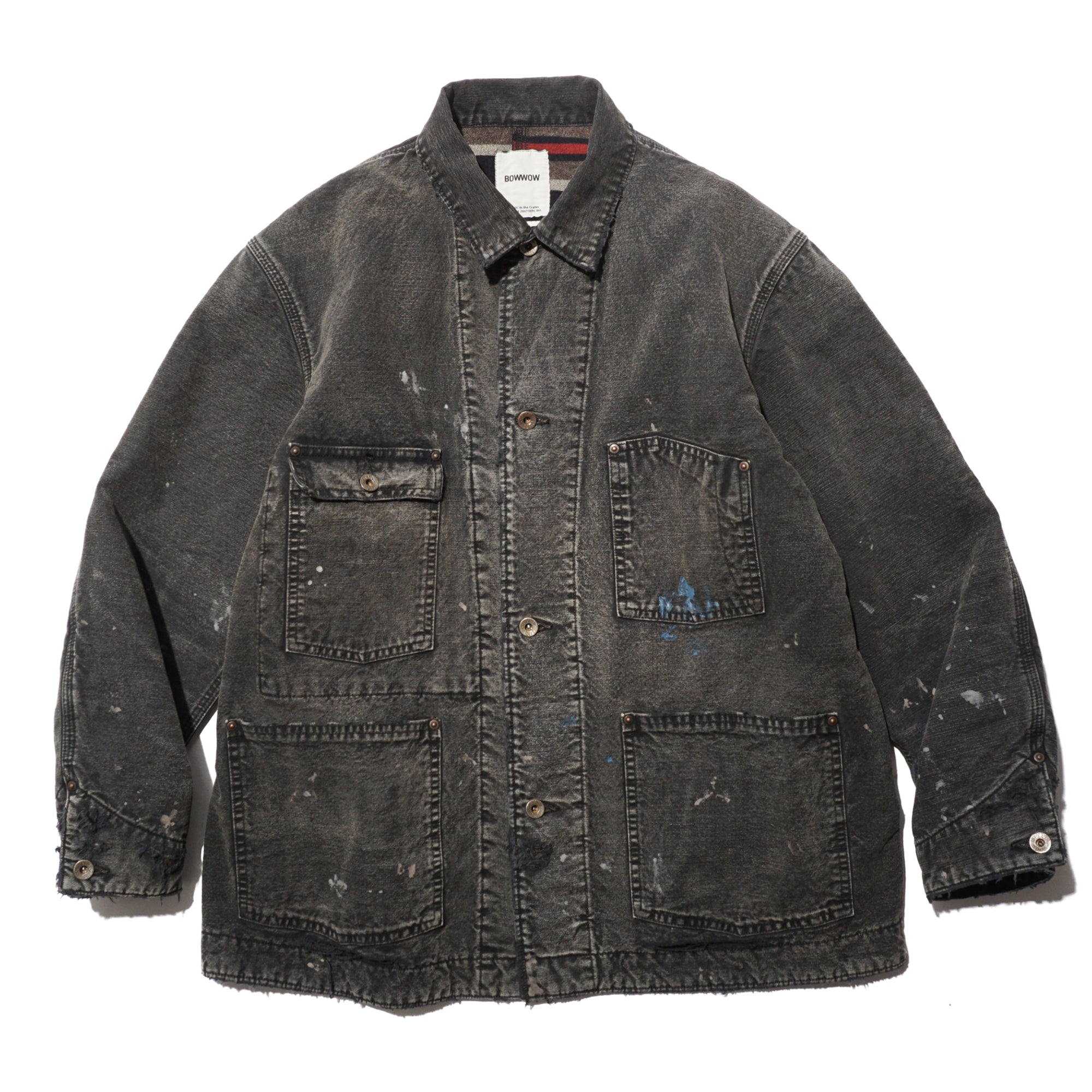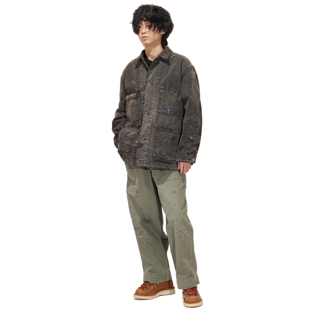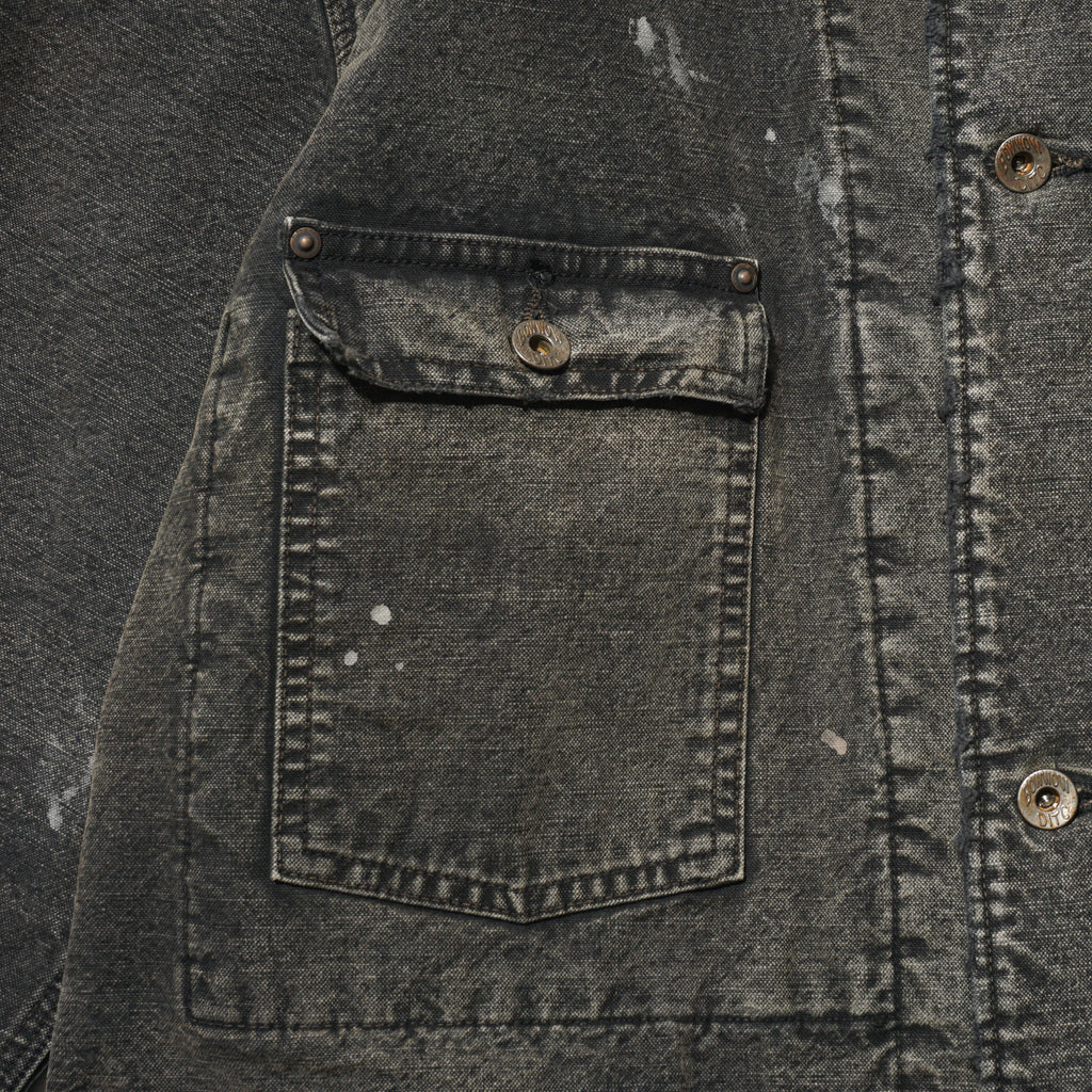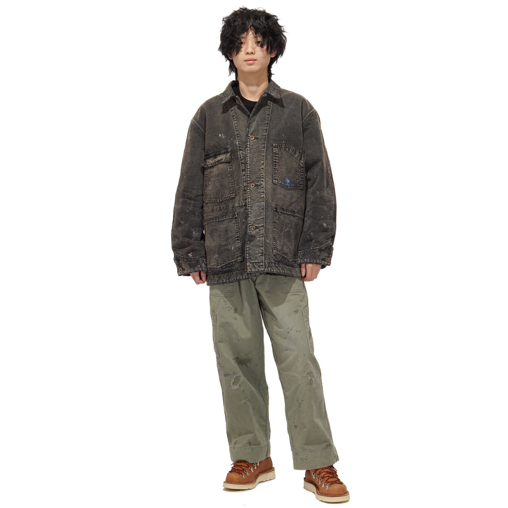 This piece channels that atmosphere—reviving the essence of refined workwear for the modern day. The body is constructed from heavy-ounce duck fabric, paired with a warm blanket lining. The garment is treated to faithfully reproduce the paint splatters, scuffs, and distinctive wear accumulated through daily labor.