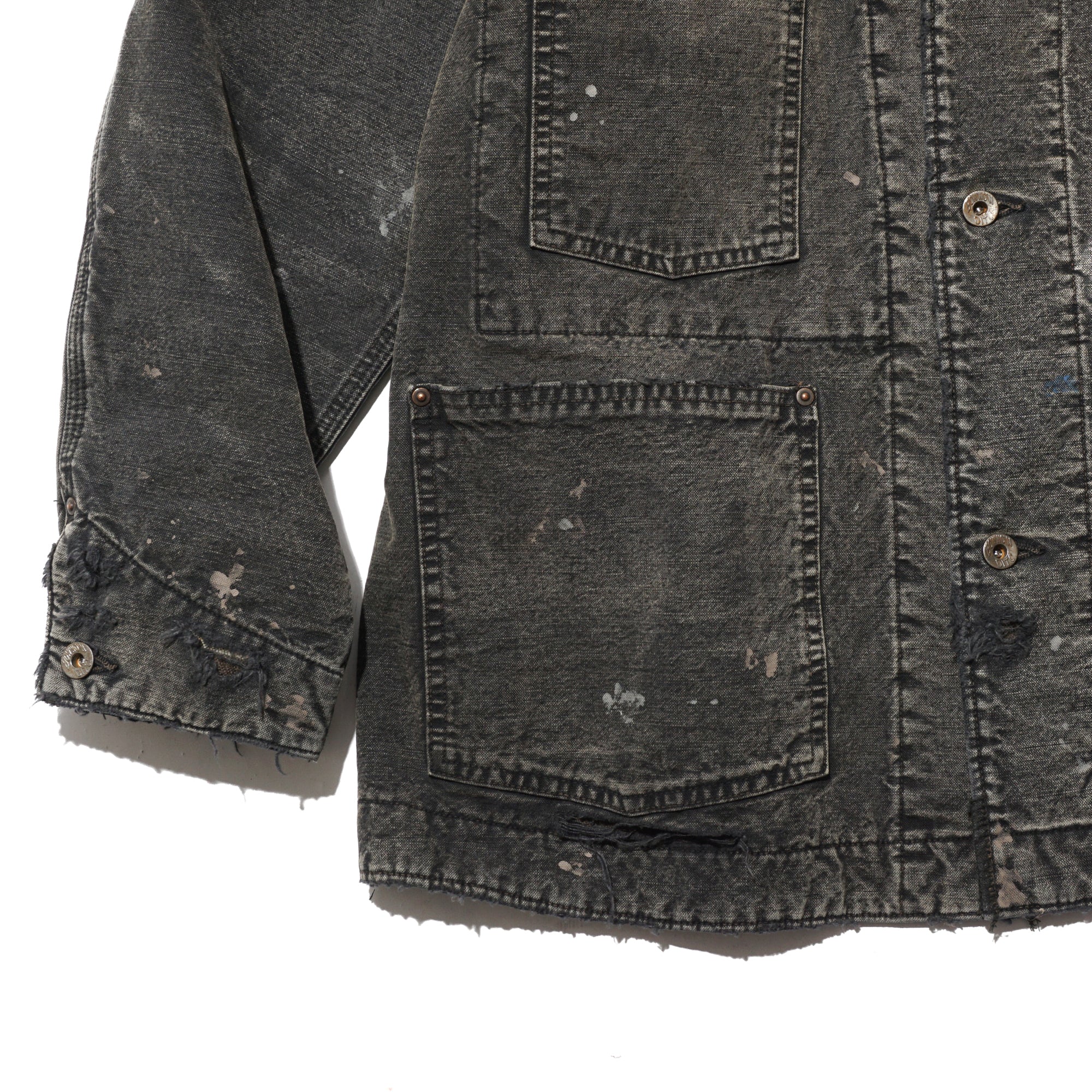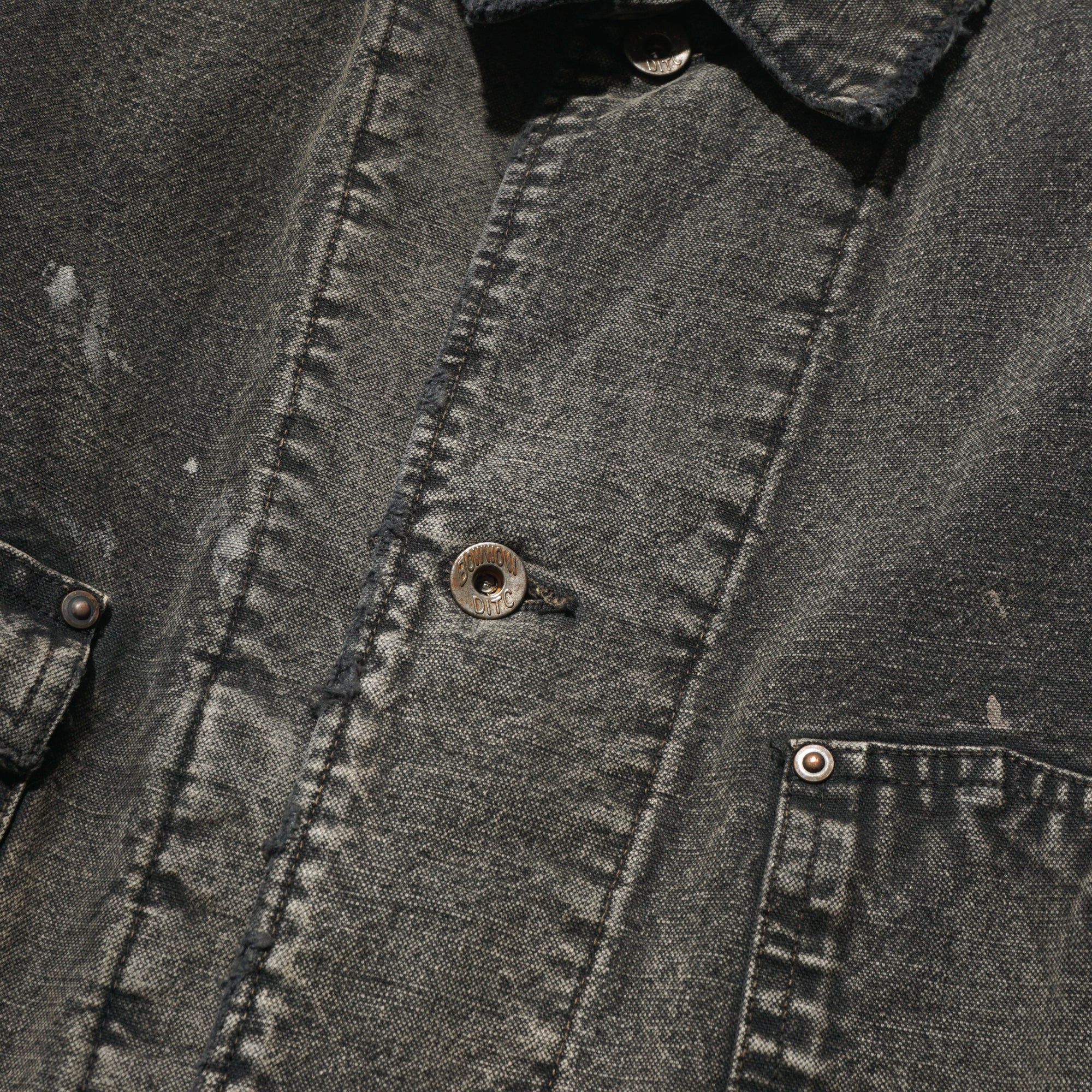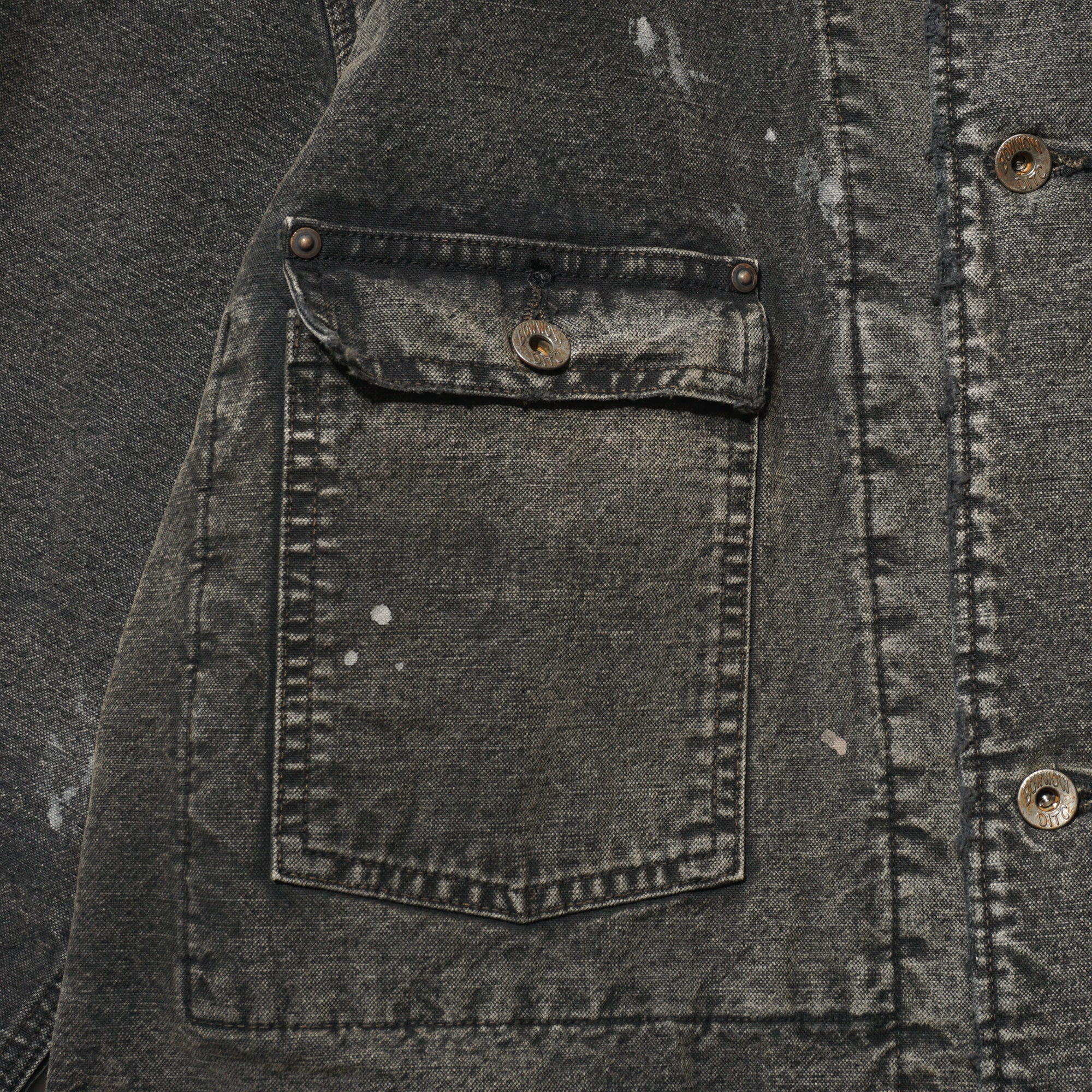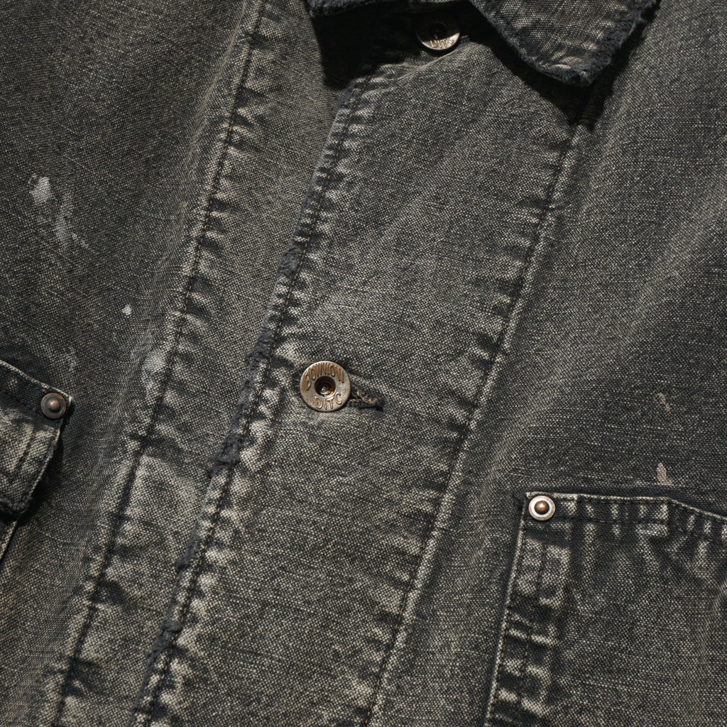 - A substantial coverall jacket made of black duck canvas, finished with a washed, distressed treatment, reinforced stitching, and paint splatter accents. It’s lined with blanket material and designed with a relaxed fit. It carries the DNA of functionality and toughness cultivated by the brand since the 1880s, while offering a presence that fits seamlessly into the contemporary city. A product crafted with true dedication.
