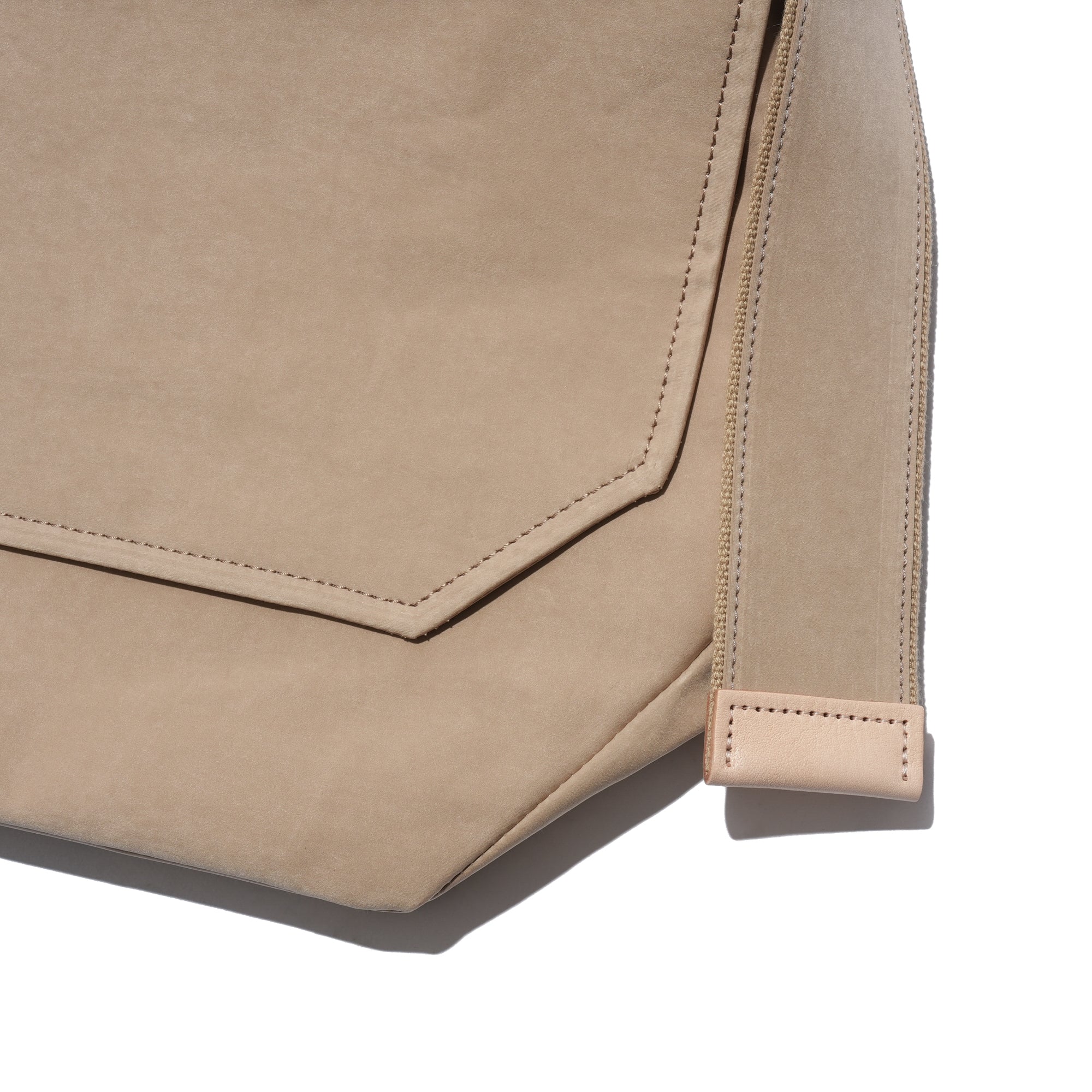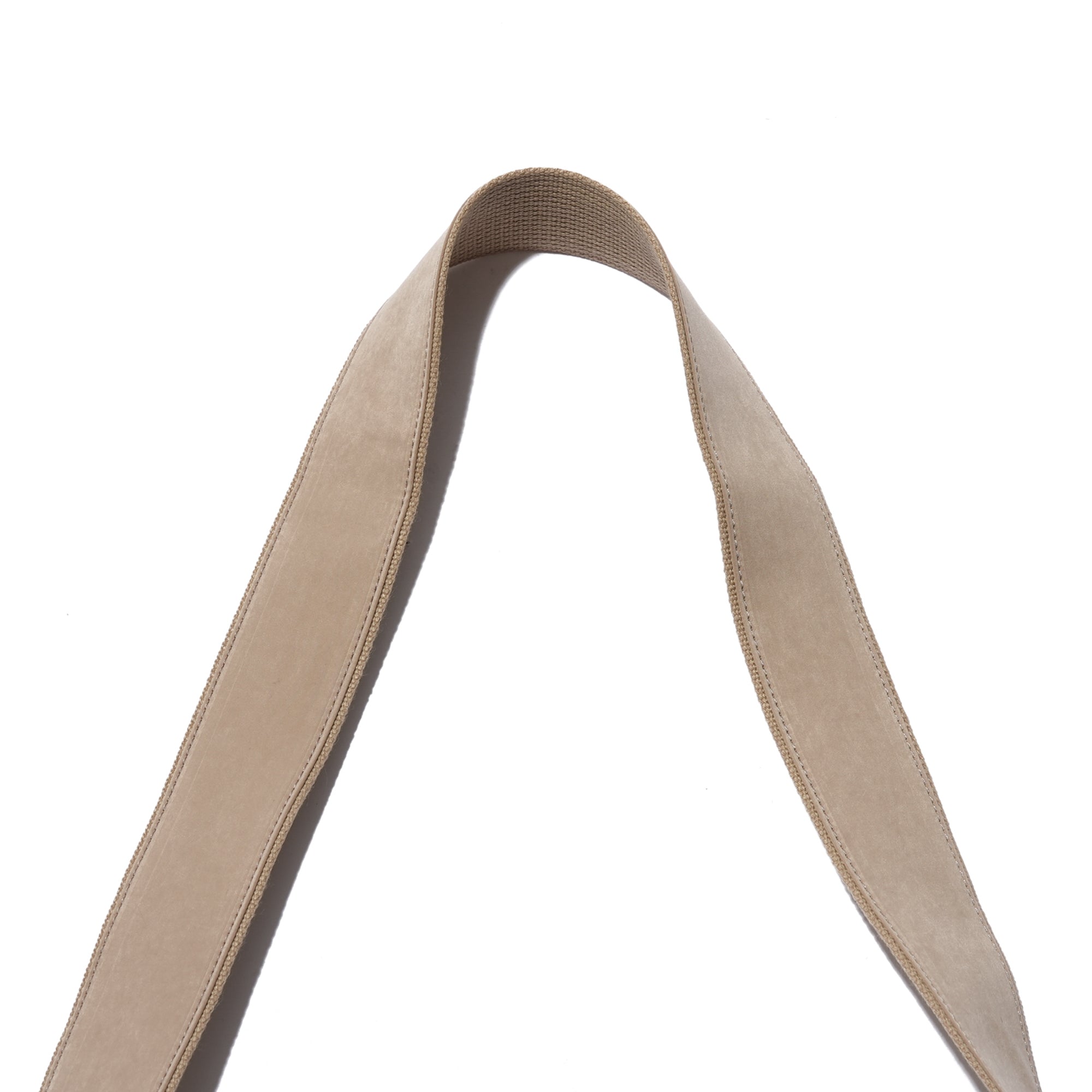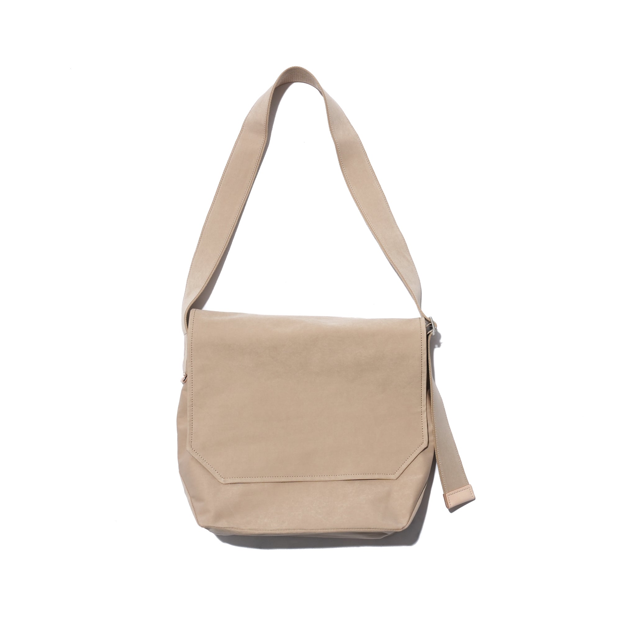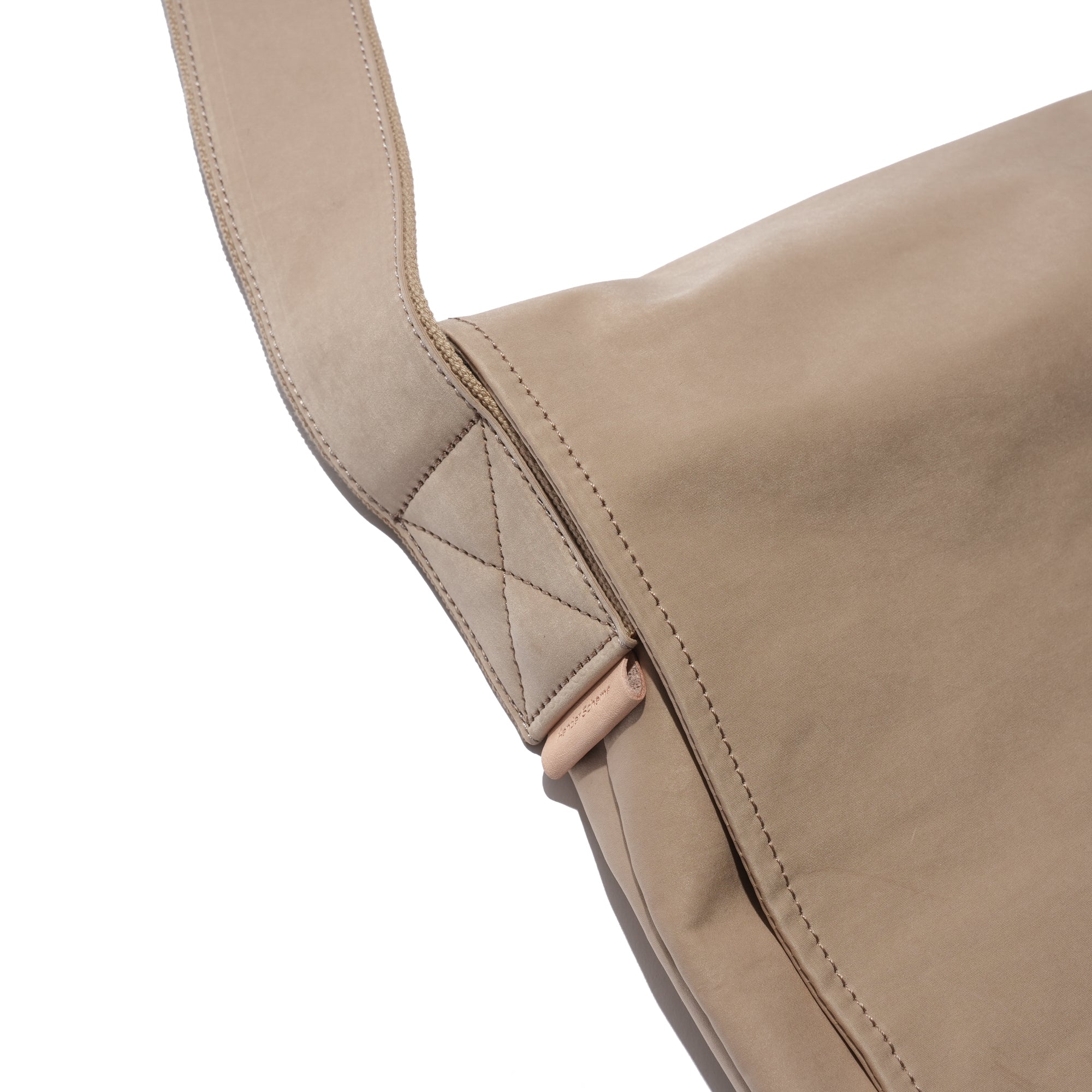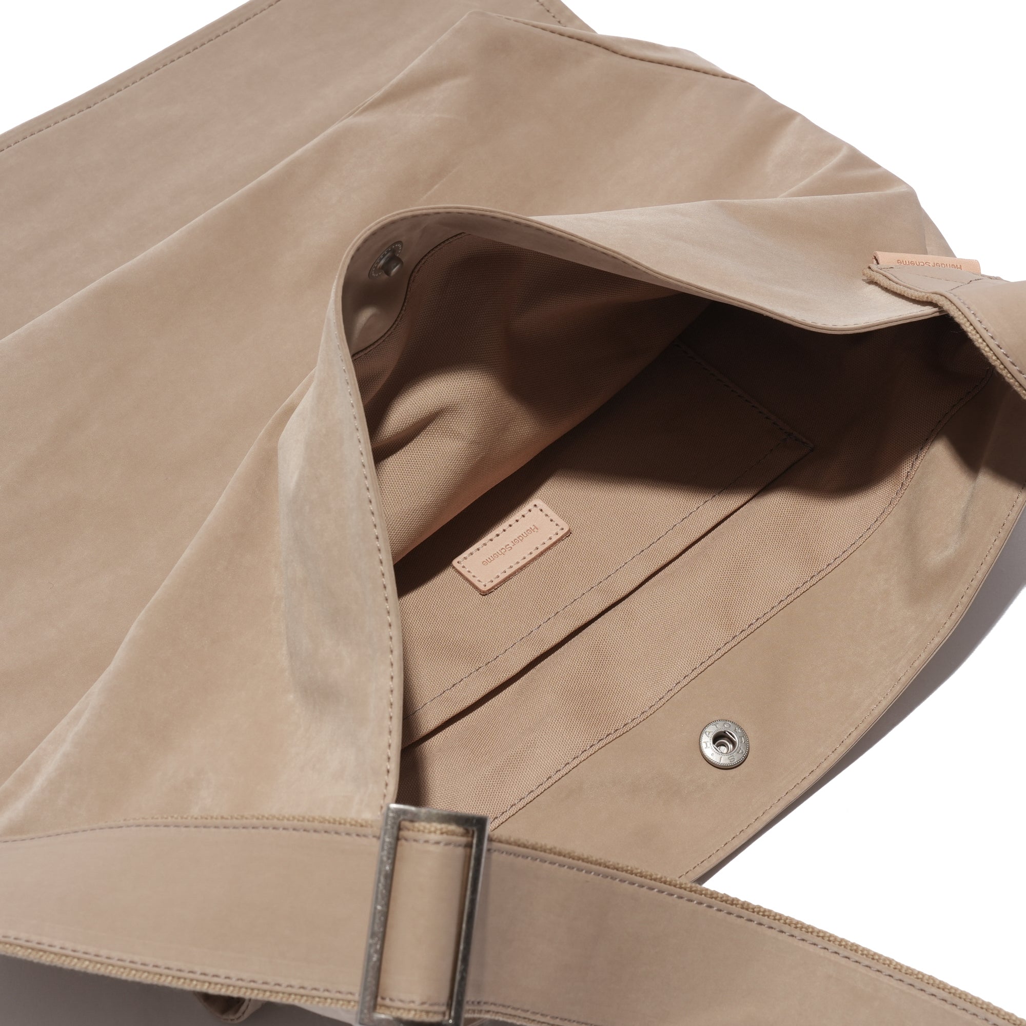 - A minimalist flap bag crafted from premium materials with a refined texture. Made from a high-density cotton-nylon blend jersey, it features a suede-like texture and water-repellent properties. Both the bag and strap are double-faced, with a snap button closure and leather trim accents on the strap and interior.