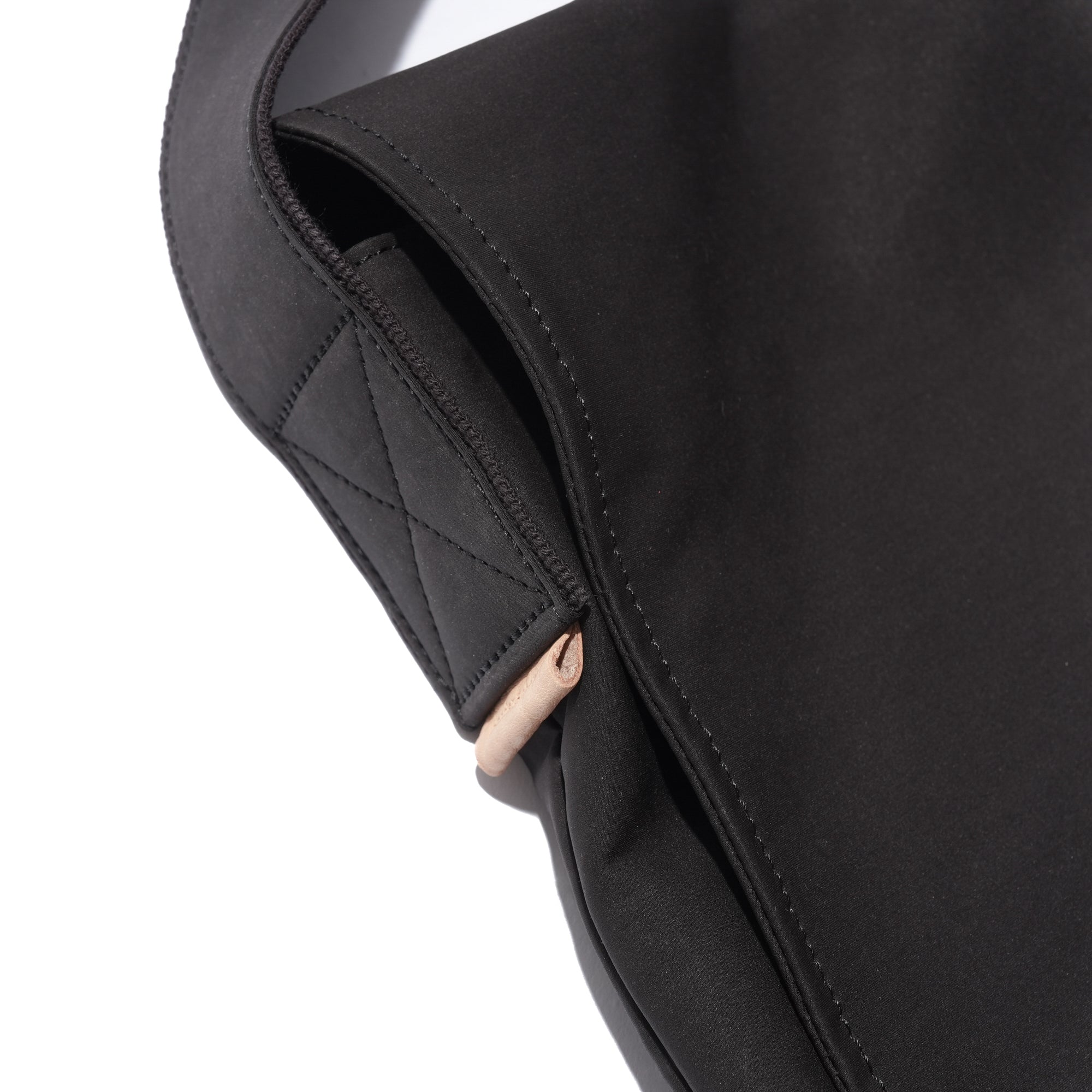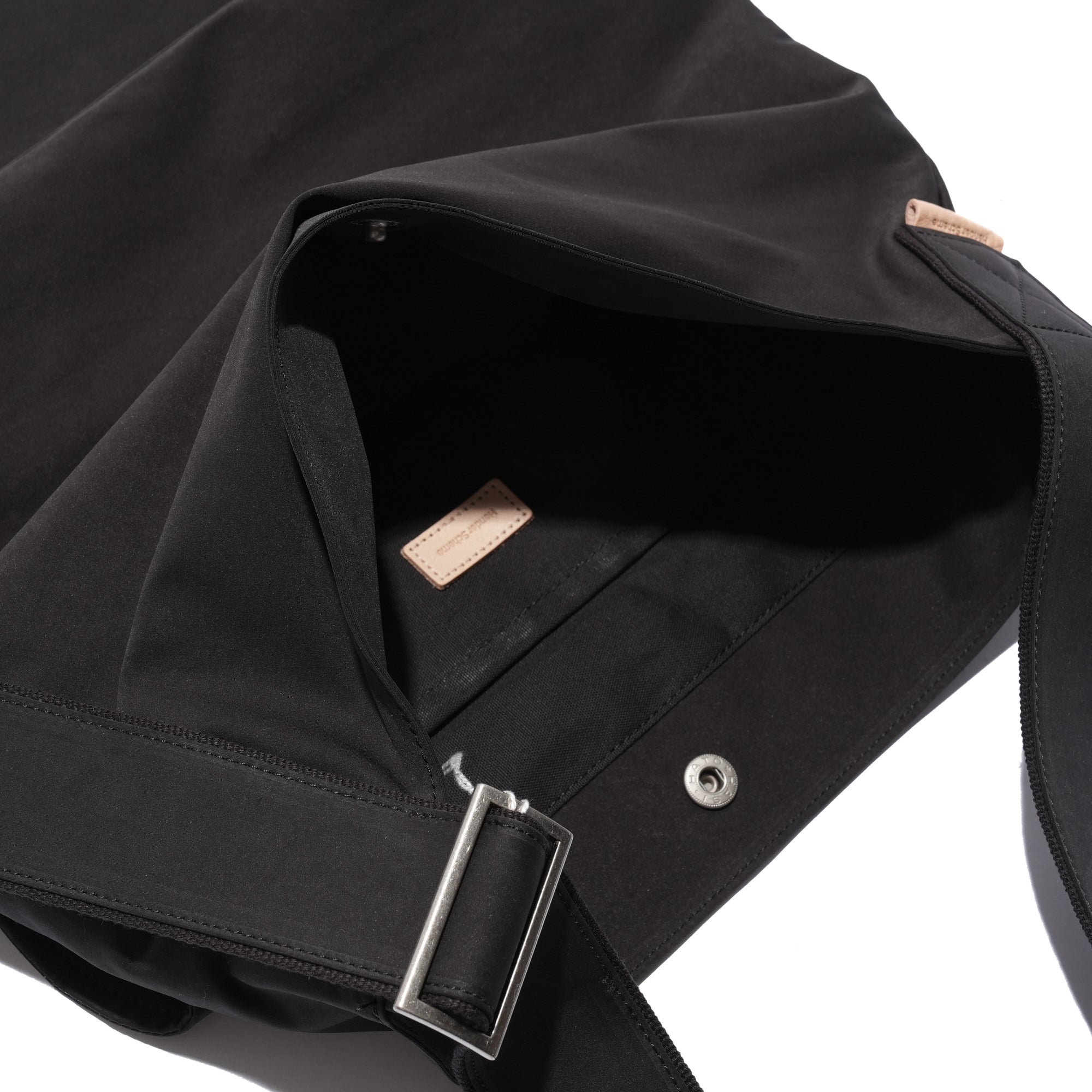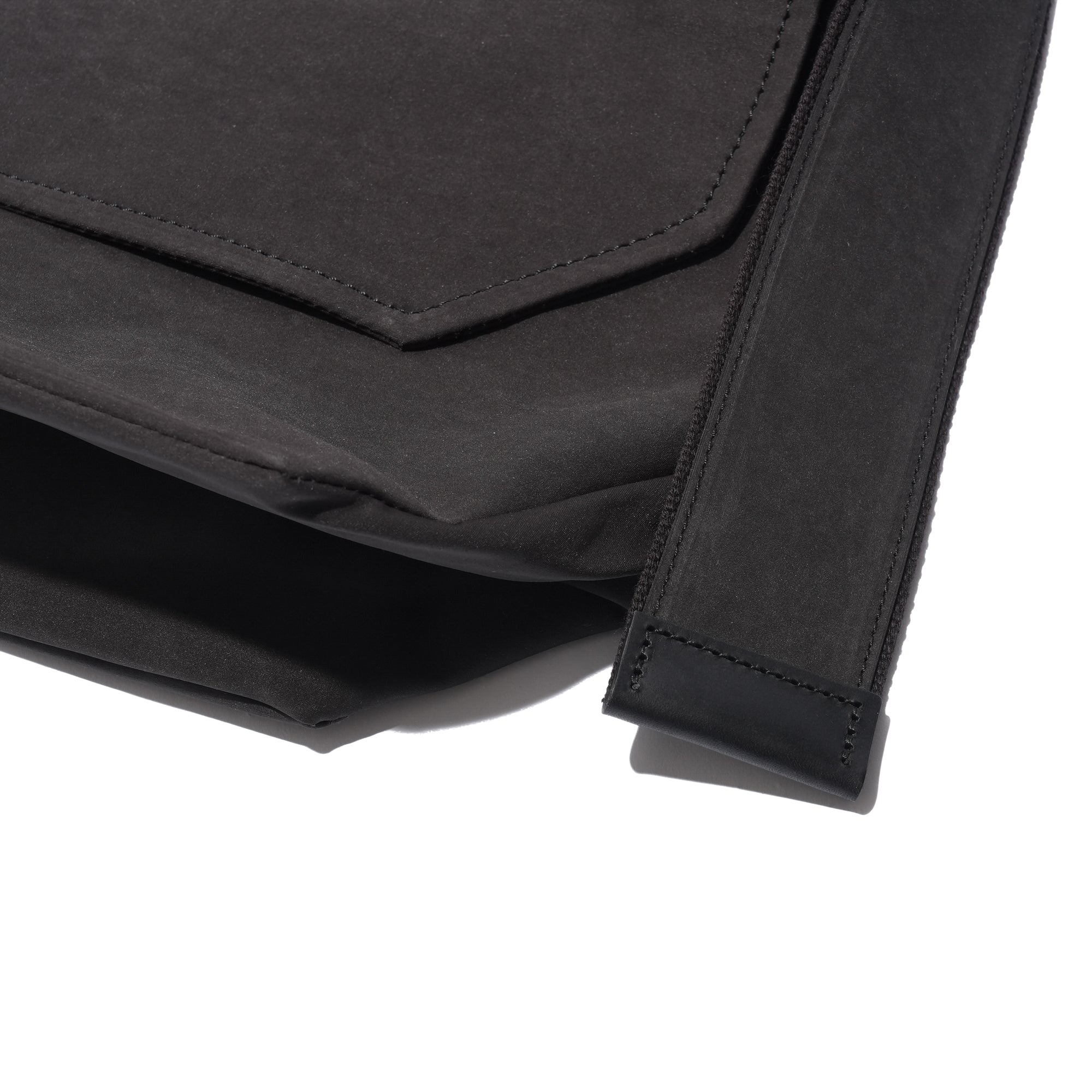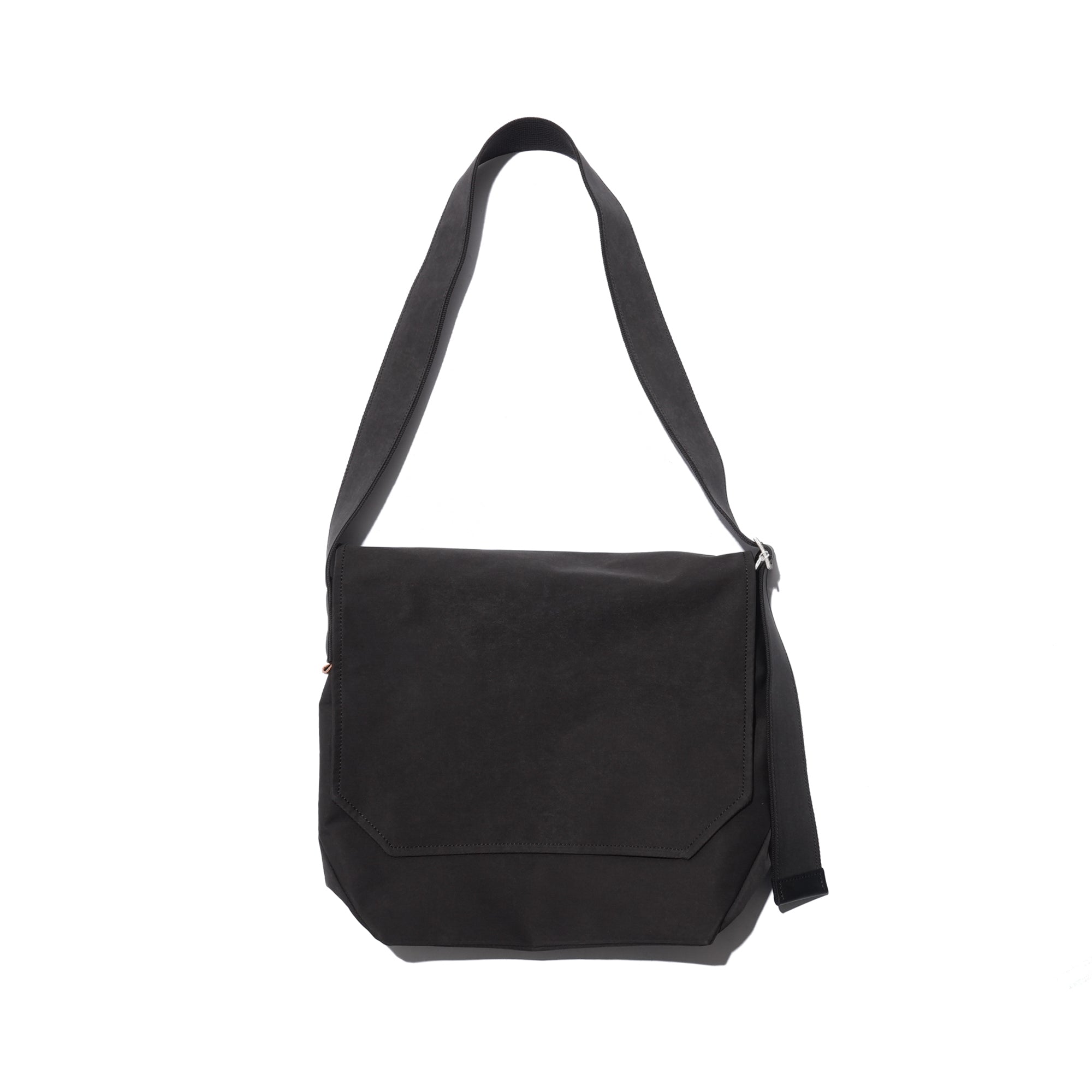 - A minimalist flap bag crafted from premium materials with a refined texture. Made from a high-density cotton-nylon blend jersey, it features a suede-like texture and water-repellent properties. Both the bag and strap are double-faced, with a snap button closure and leather trim accents on the strap and interior.