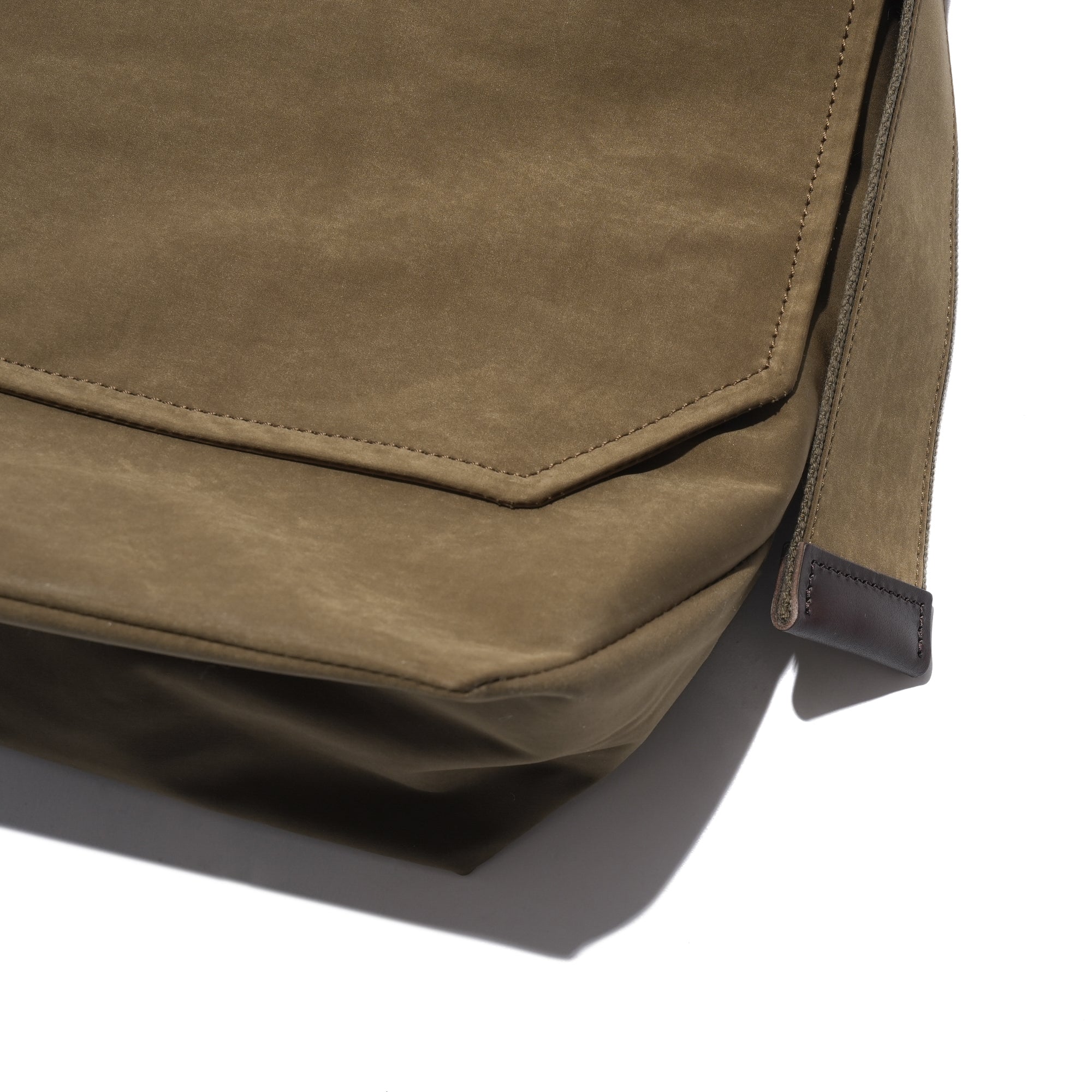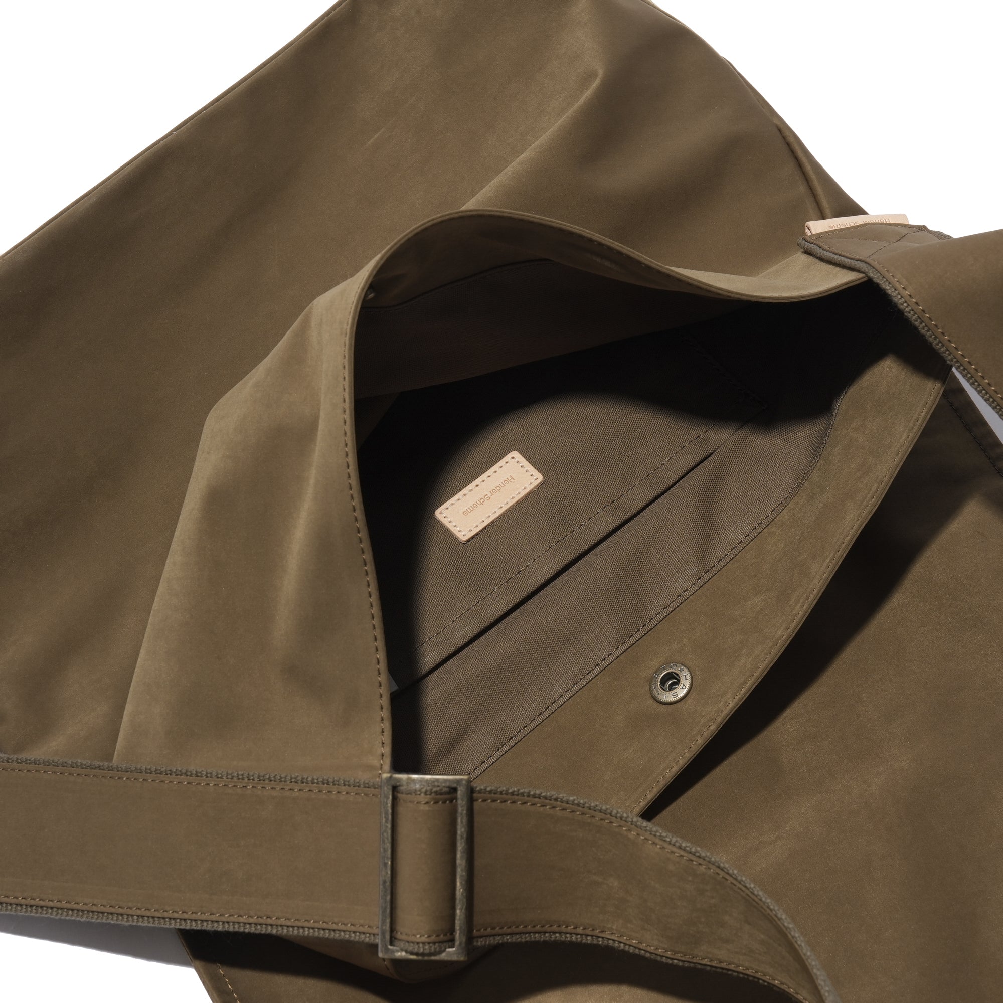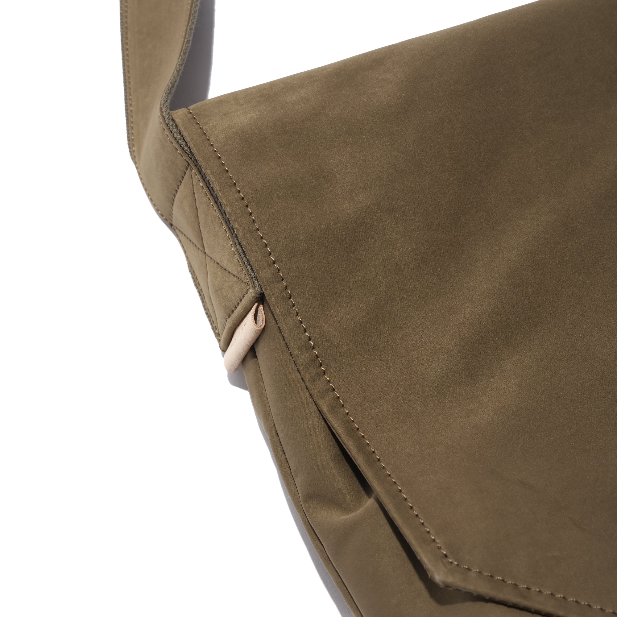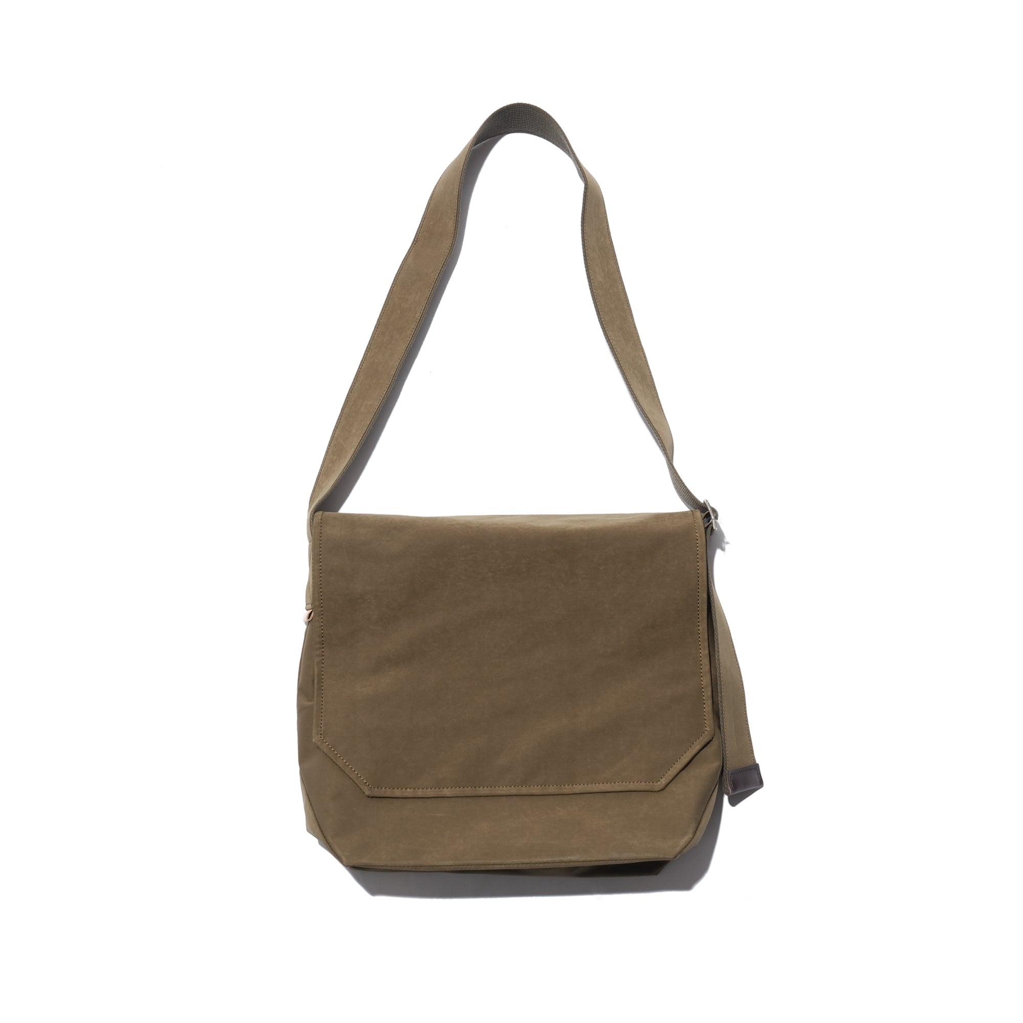 - A minimalist flap bag crafted from premium materials with a refined texture. Made from a high-density cotton-nylon blend jersey, it features a suede-like texture and water-repellent properties. Both the bag and strap are double-faced, with a snap button closure and leather trim accents on the strap and interior.