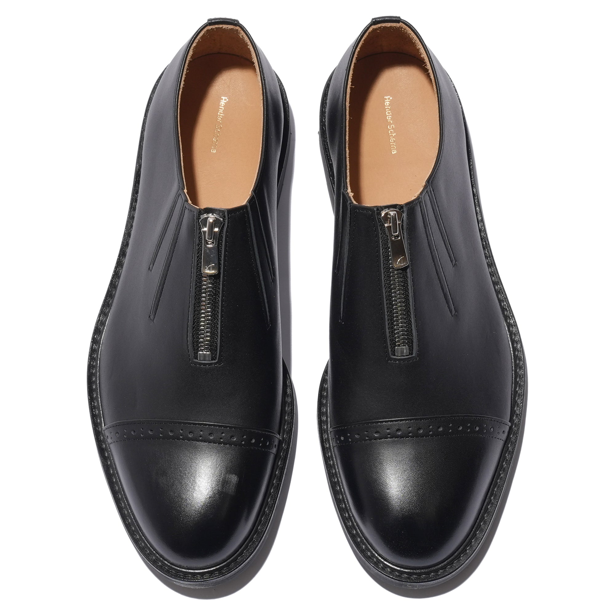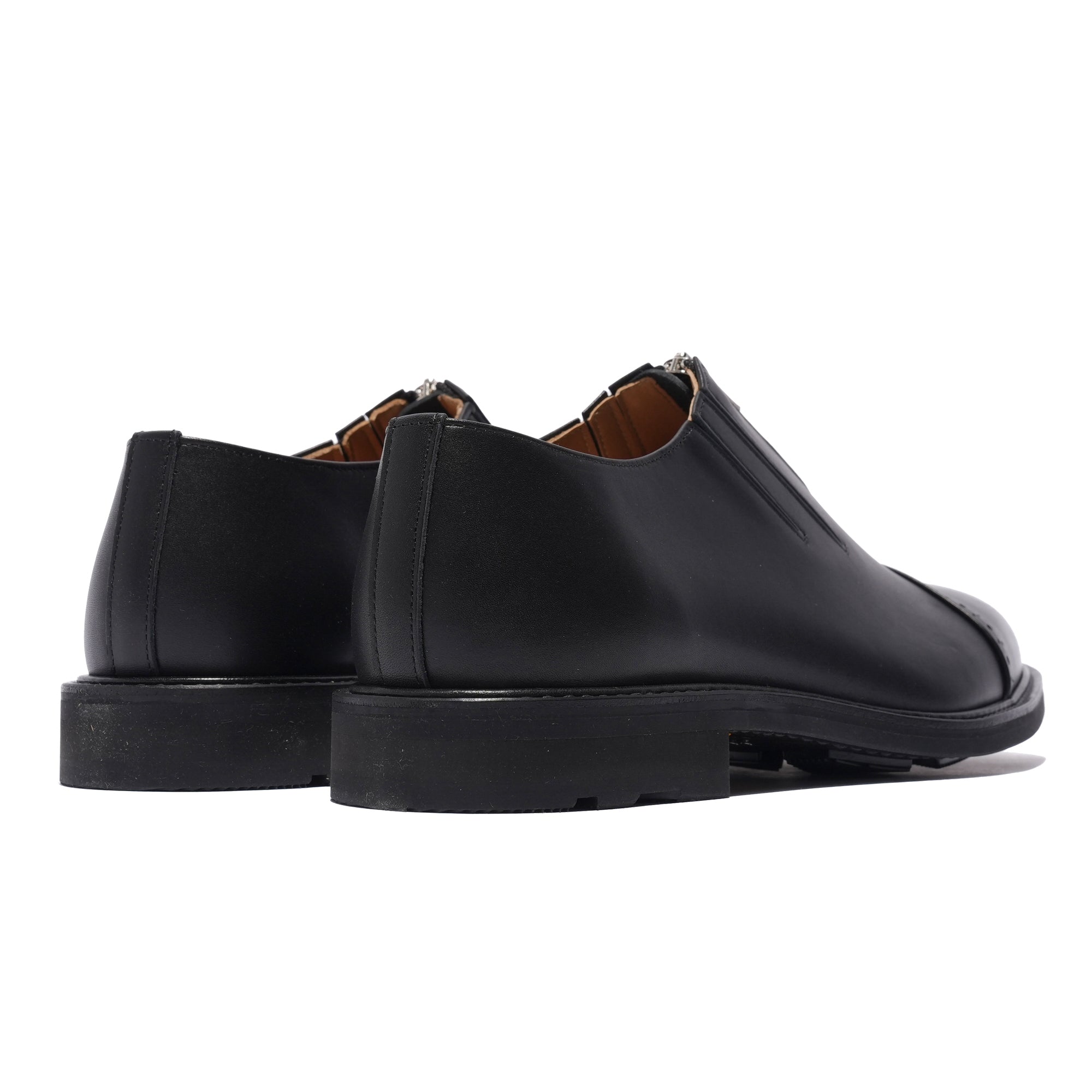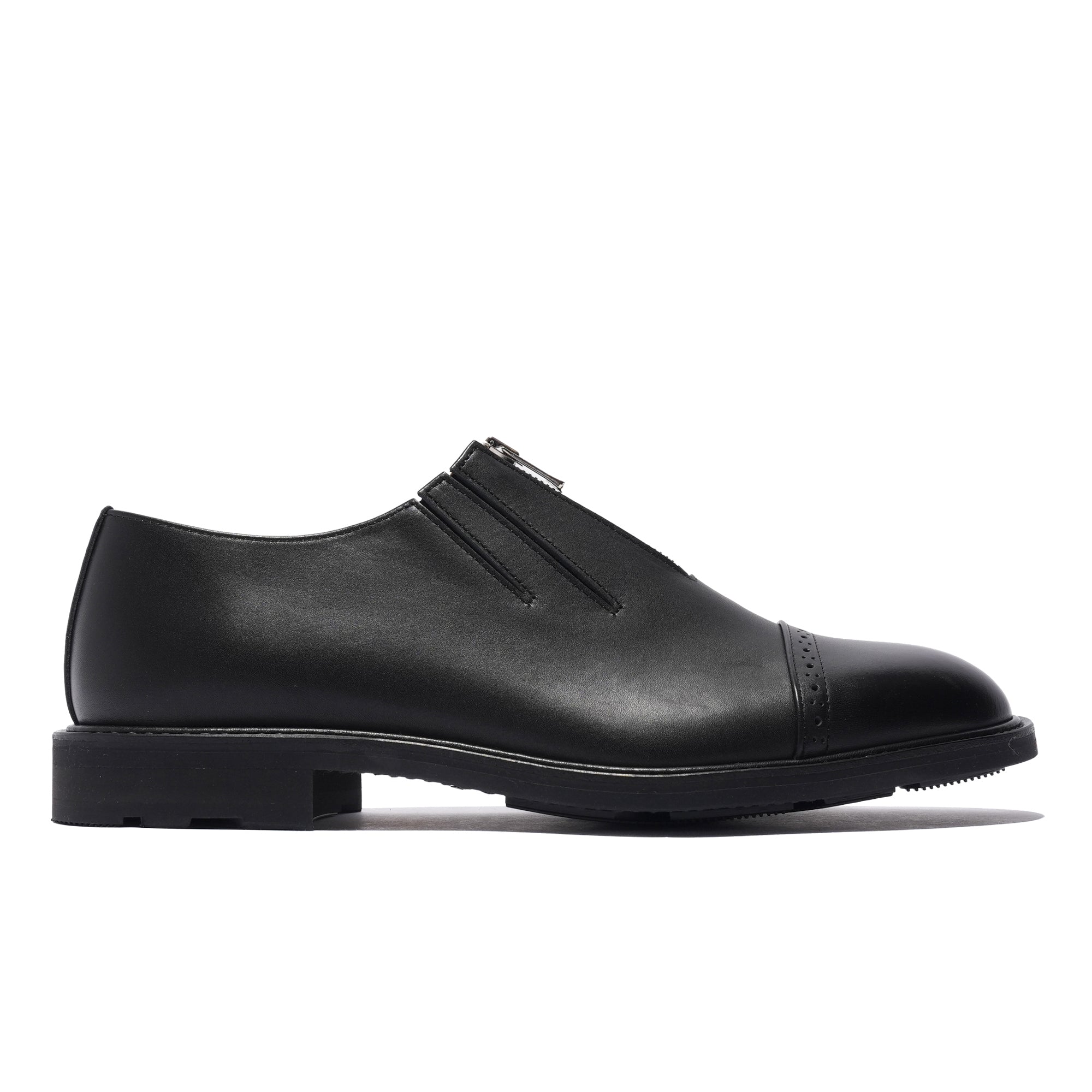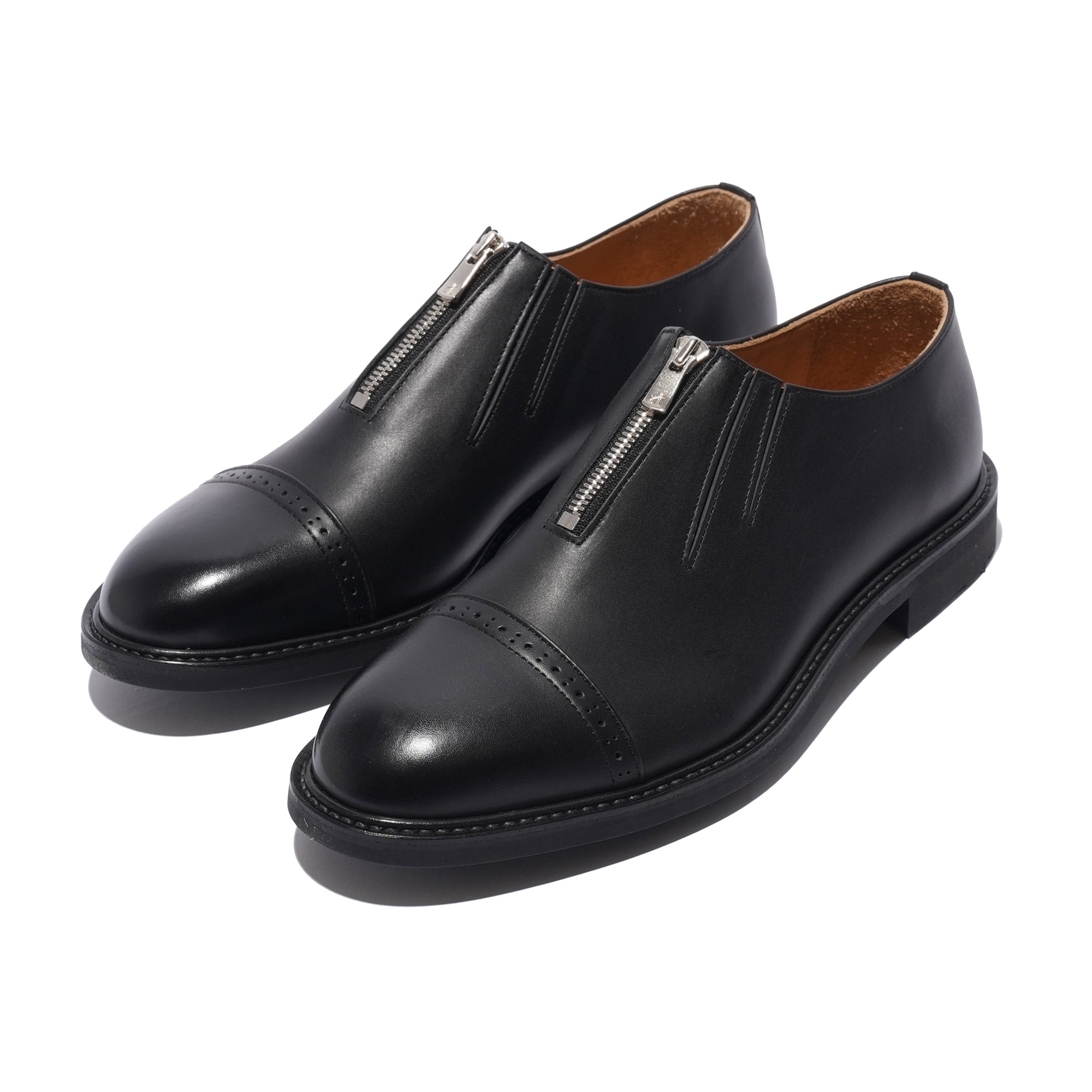 - A playful reinterpretation of classic derby toe-cap shoes, featuring a Riri zipper closure and spandex inserts on the leather panels for easy on and off. Crafted from cowhide leather for both upper and lining, with a rough-out finish on the heel to prevent slipping. This design combines elegance and functionality, offering a thoughtful and fun update to the traditional leather shoe.