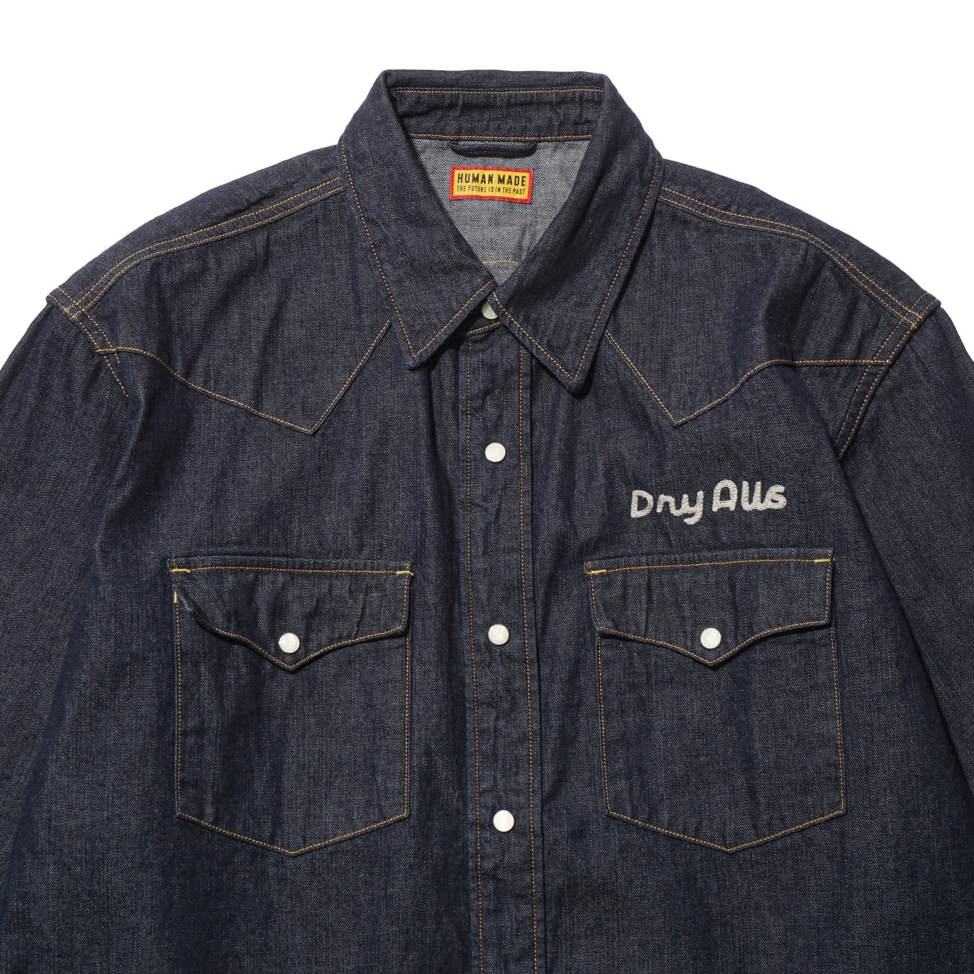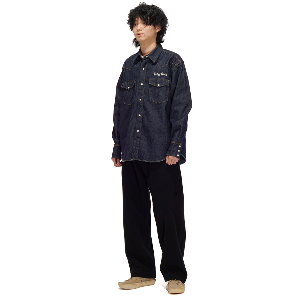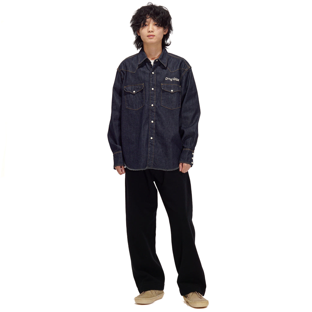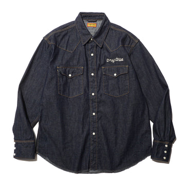 -This denim western shirt comes in a regular fit, crafted from lightweight denim that naturally develops variations and creases over time. It’s detailed with chain-stitched graphics and “DRY ALLS” embroidery above the left chest pocket, while the chest features classic western-style flap pockets. Pearl dot buttons with the brand’s logo run down the front, and the cuffs are finished with a three-button design for an authentic touch.