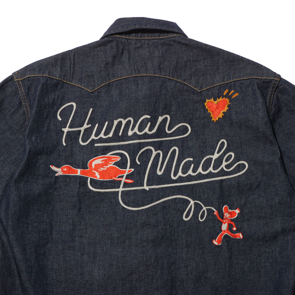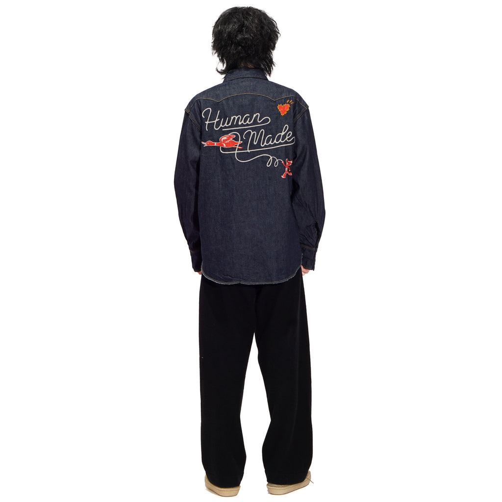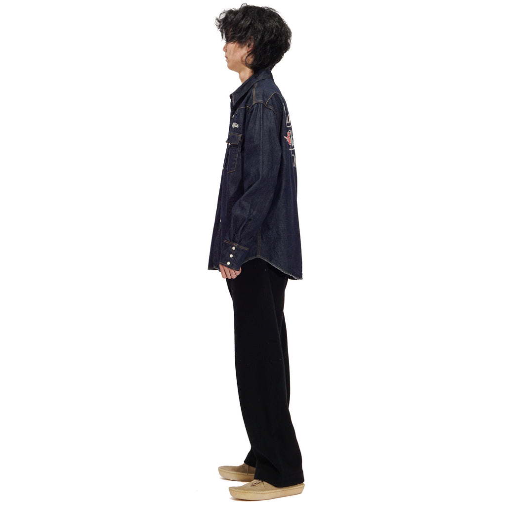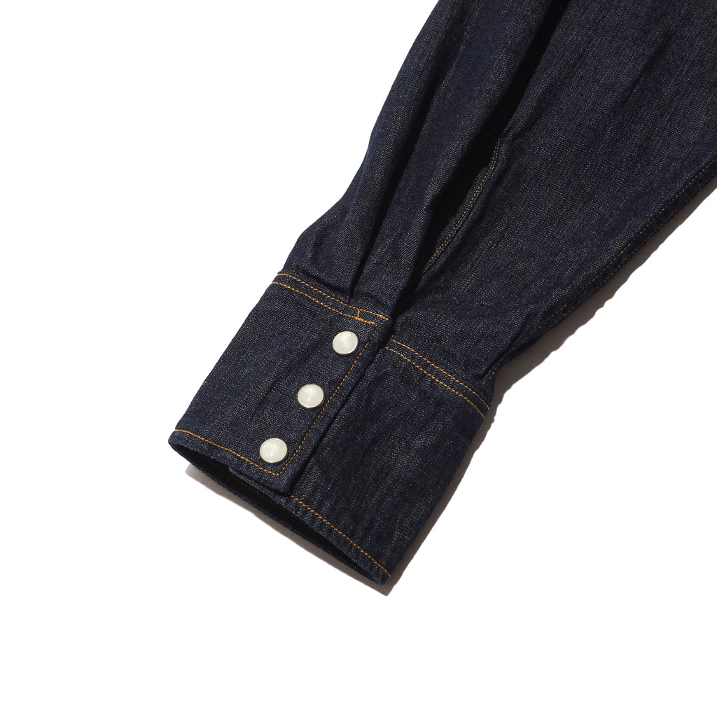 -This denim western shirt comes in a regular fit, crafted from lightweight denim that naturally develops variations and creases over time. It’s detailed with chain-stitched graphics and “DRY ALLS” embroidery above the left chest pocket, while the chest features classic western-style flap pockets. Pearl dot buttons with the brand’s logo run down the front, and the cuffs are finished with a three-button design for an authentic touch.