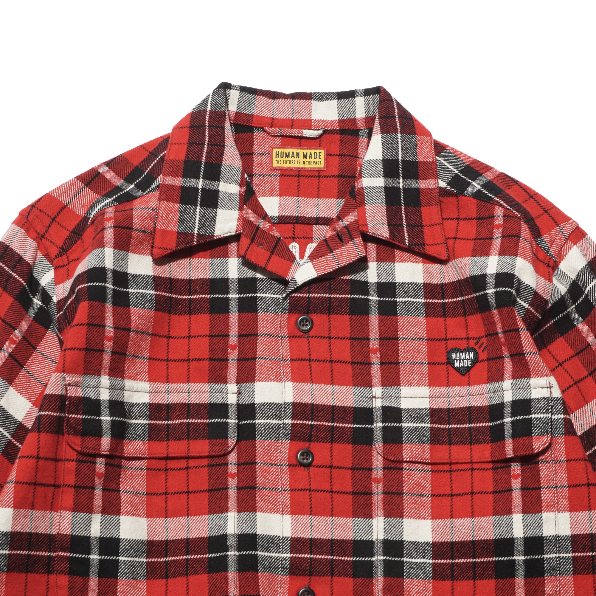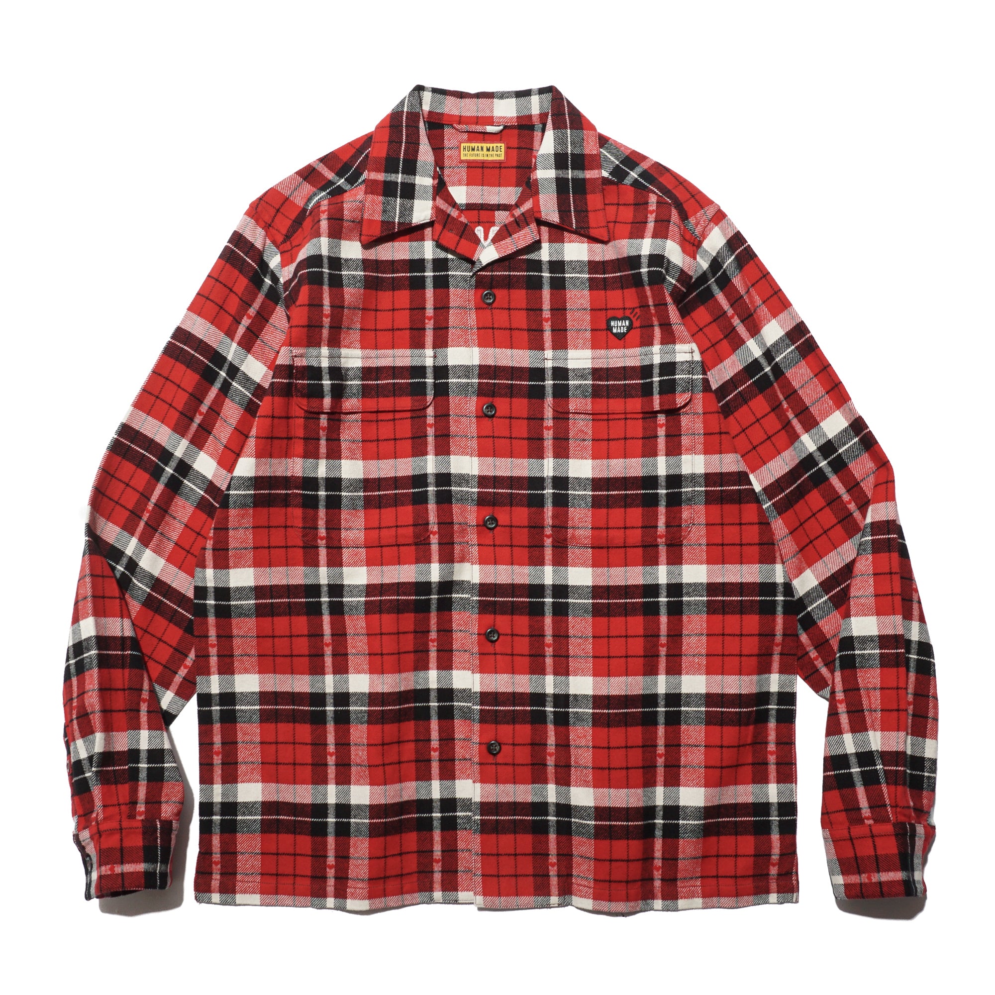 - A regular-fit open-collar flannel shirt in a jacquard check pattern woven with subtle heart motifs, finished with an embroidered logo on the back and a heart-logo patch on the chest.