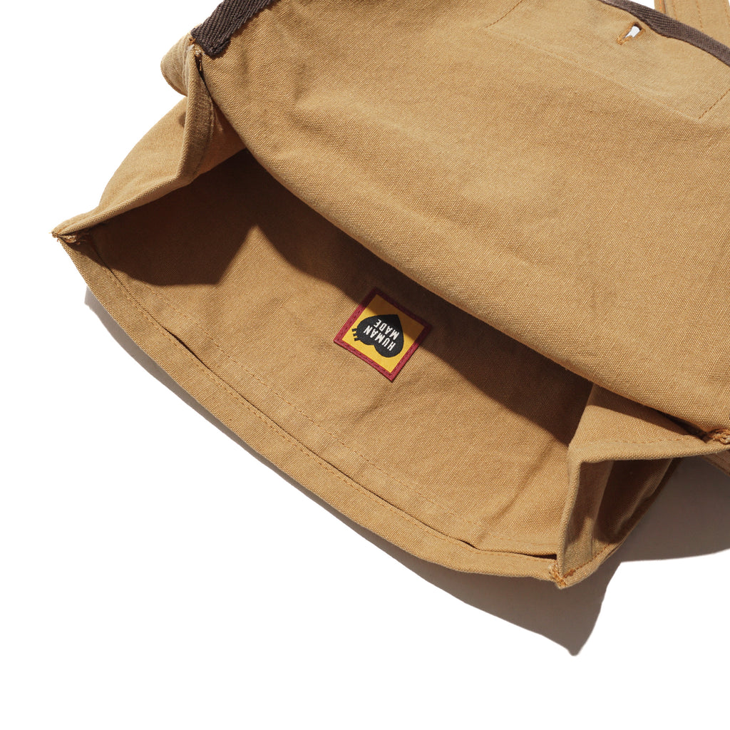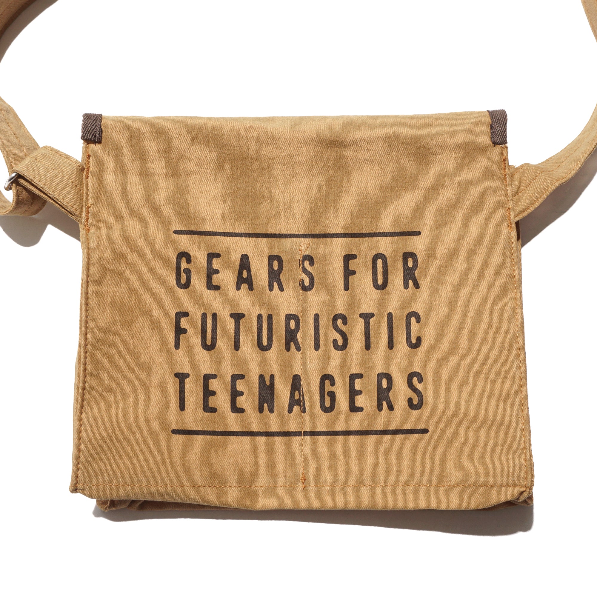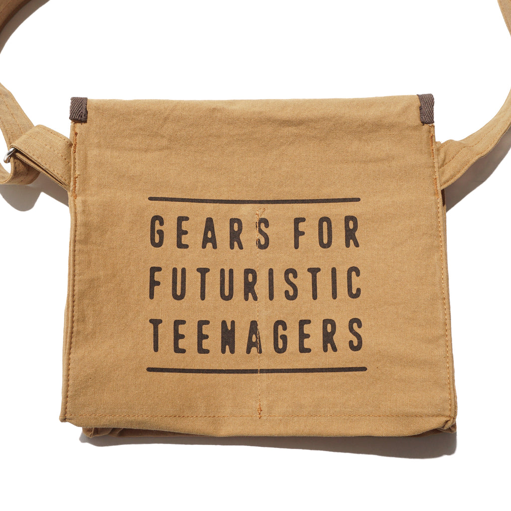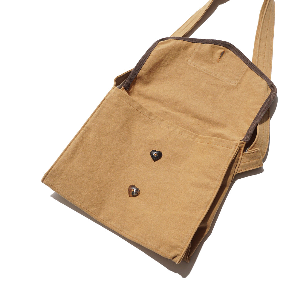 -Made from soft, lightweight cotton Oxford fabric and finished with a distressed treatment for a vintage look. It features a flap closure with two adjustable buttons, each detailed with a heart-shaped design. A dye-printed graphic decorates the back, while two interior pockets provide simple organization.