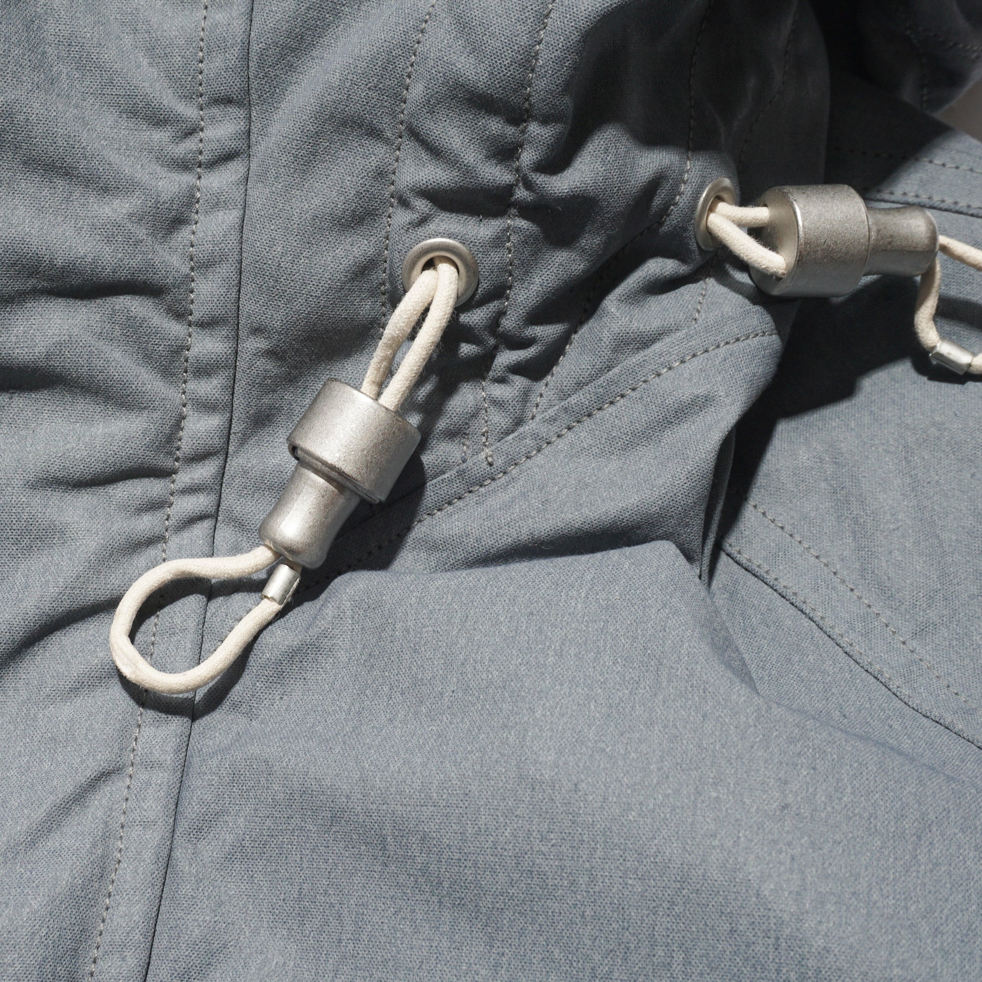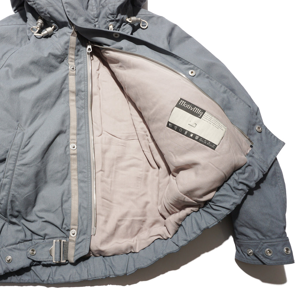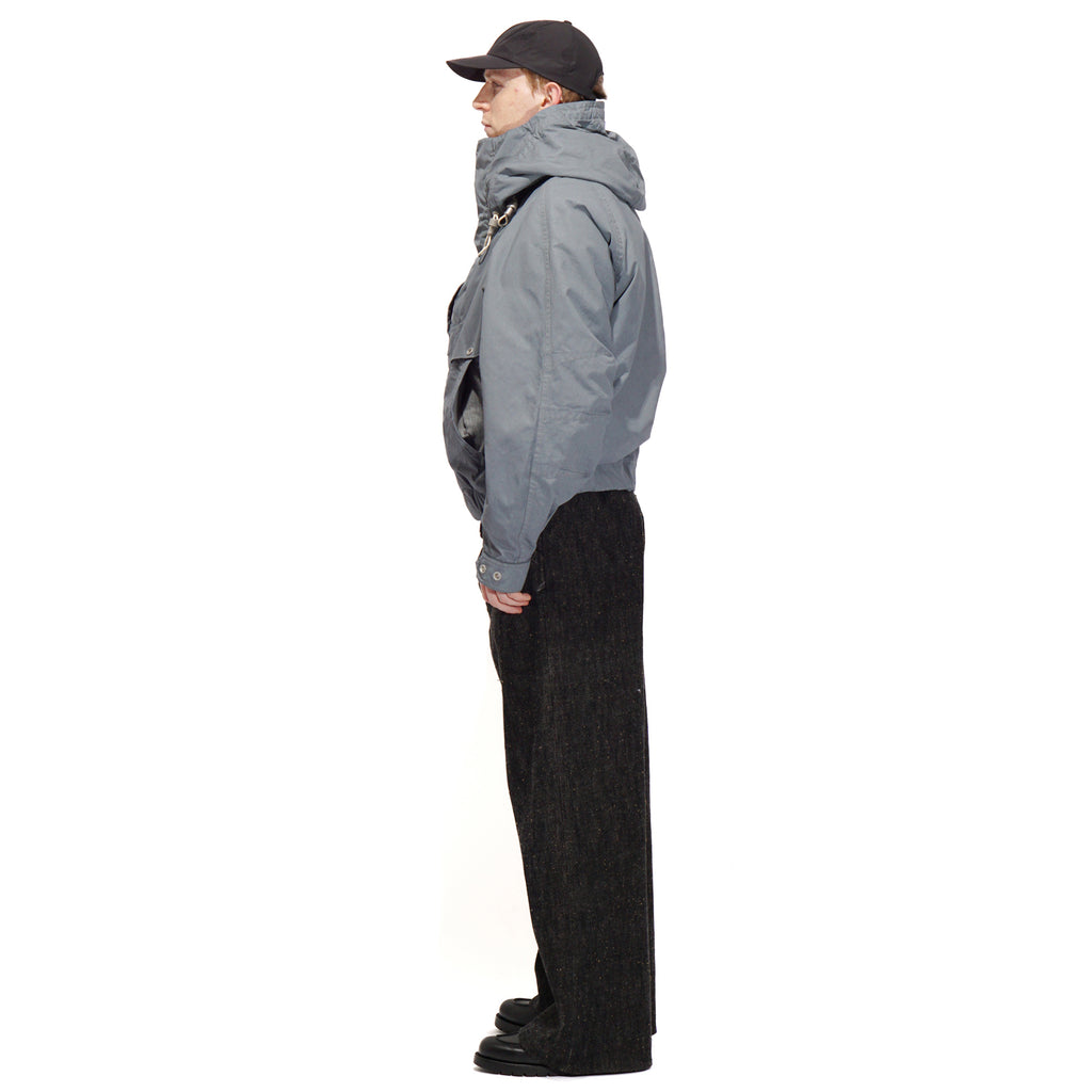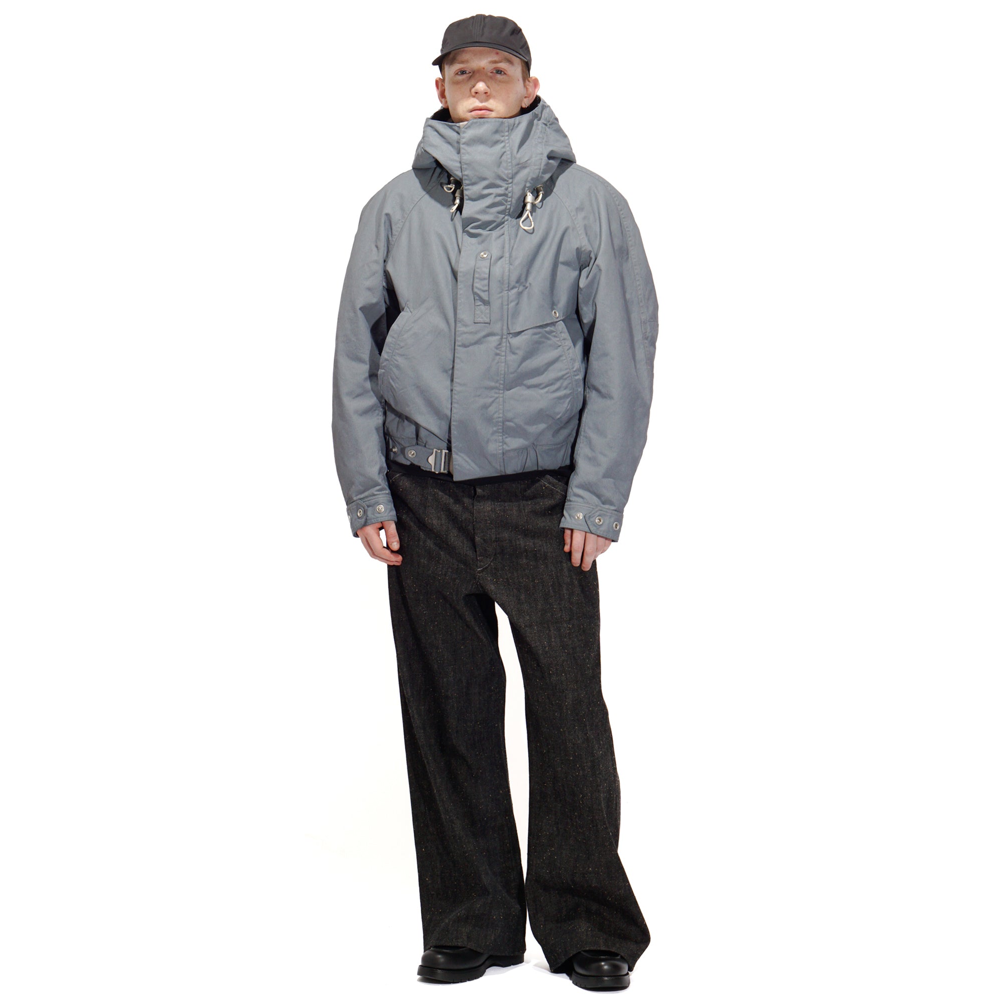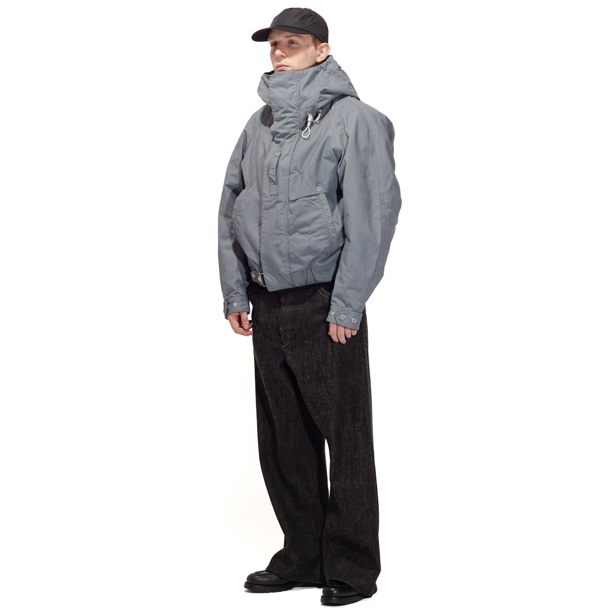 Crafted from Halley Stevensons’ military-finish waxed cotton, this jacket uses 100% cotton fabric treated with the British mill’s latest coating technique. After a simple wash, the fabric develops a vintage patina reminiscent of mid-century garments, while retaining the water-repellent qualities of traditional waxed cotton. For this season, Halley Stevensons created a new high-contrast coating exclusively for us, enhancing the worn-in, mottled effect. Inspired by Soviet tanker jackets, the cropped silhouette features an adjustable drawstring hood with Canadian military-style rope fasteners, ergonomically cut raglan sleeves, a map pocket with an additional quick-access hidden pocket on the left front, and ribbed hand-warmer pockets designed to block wind.