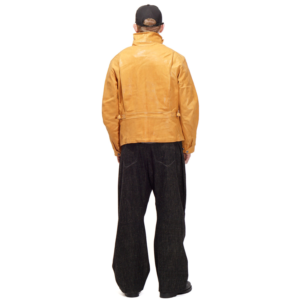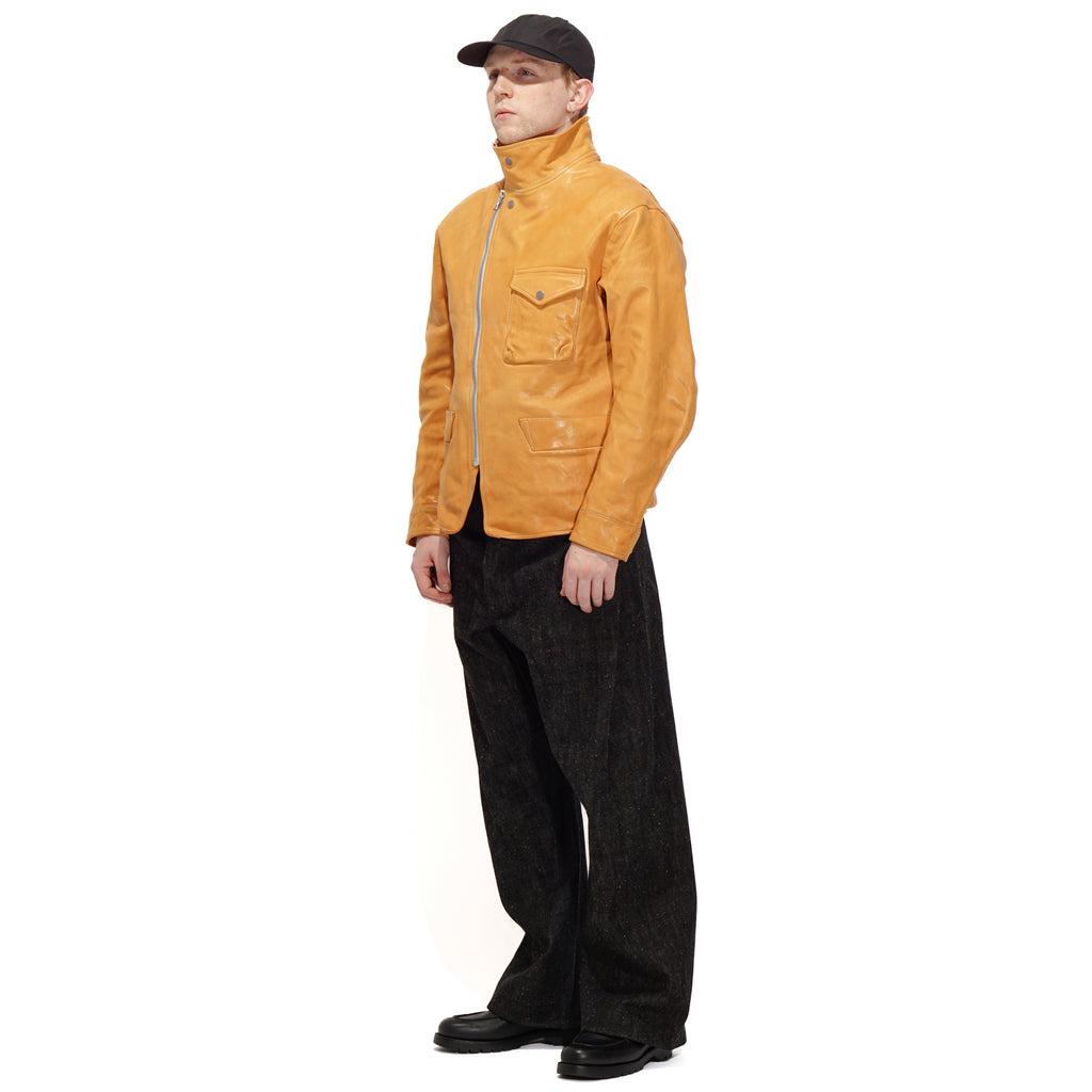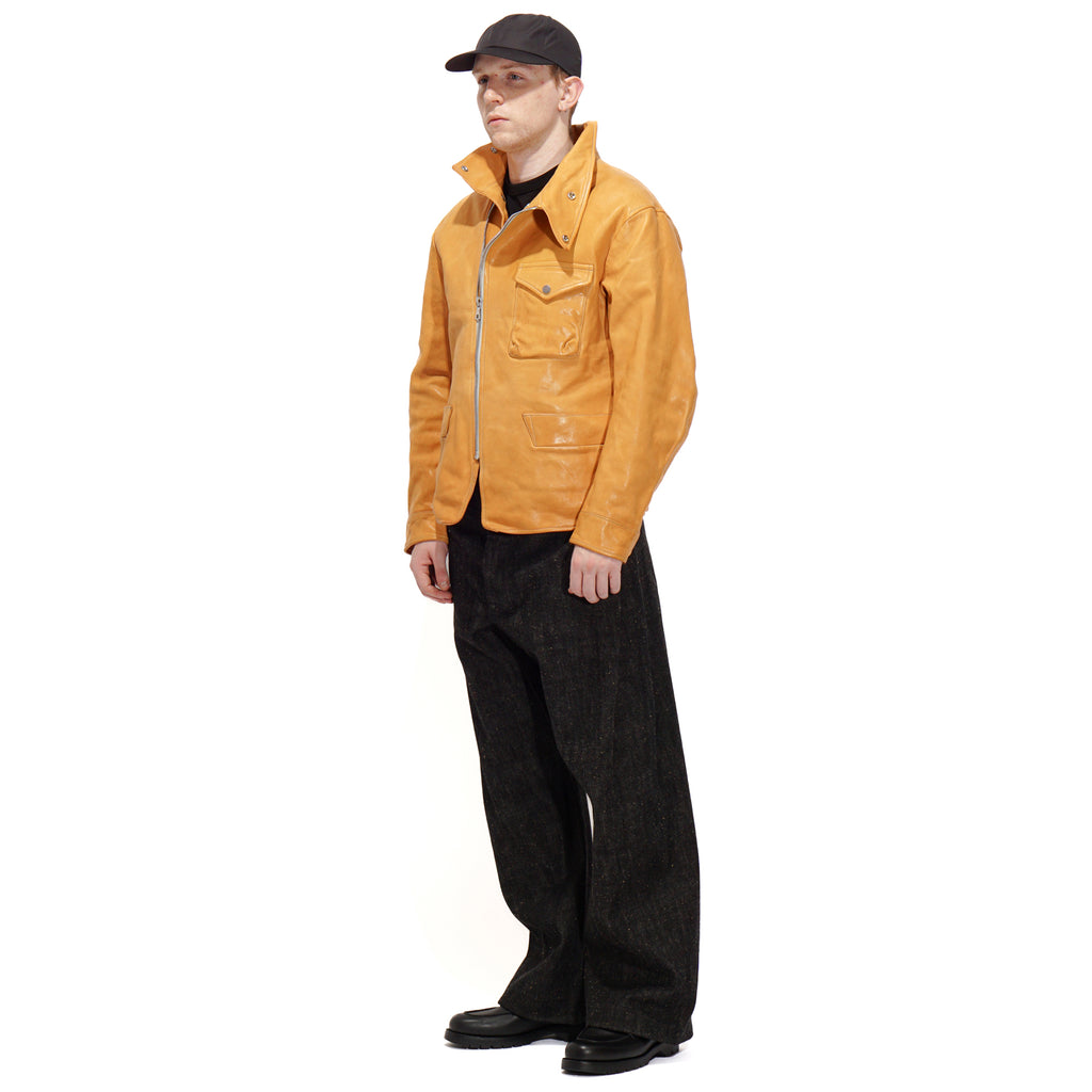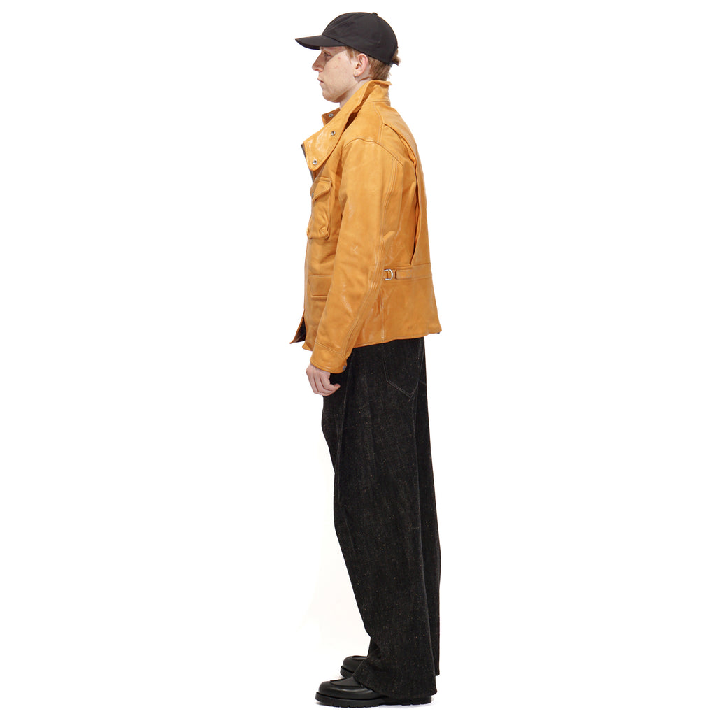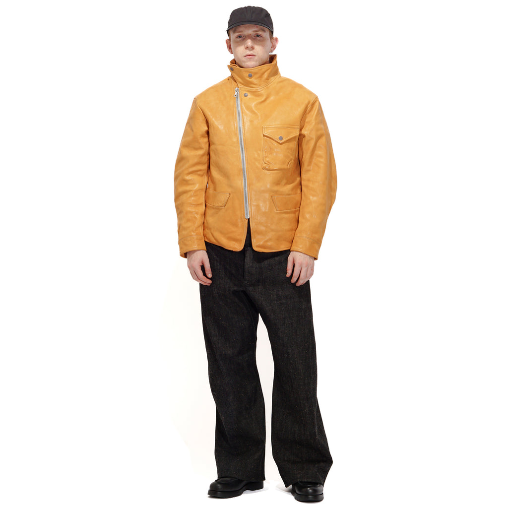 Made from washed kid horsehide in a straw-yellow tone, this jacket is crafted with leather specially developed by Highland Yak using top-grade Italian raw hides. The hides undergo deep beeswax impregnation for exceptional softness, followed by multiple washing processes to enhance natural grain, texture, and subtle aging effects. Inspired by the early Royal Air Force “Sidcot” flight suit, the design reinterprets it as a refined side-zip jacket with an asymmetrical collar that can be secured with three snap buttons or left open for a relaxed look. Functional details include two action pleats and adjustable tabs at the back, a twill wool lining in the body for warmth, quilted insulation in the sleeves, and custom snaps engraved with this season’s magnetic interference motif.