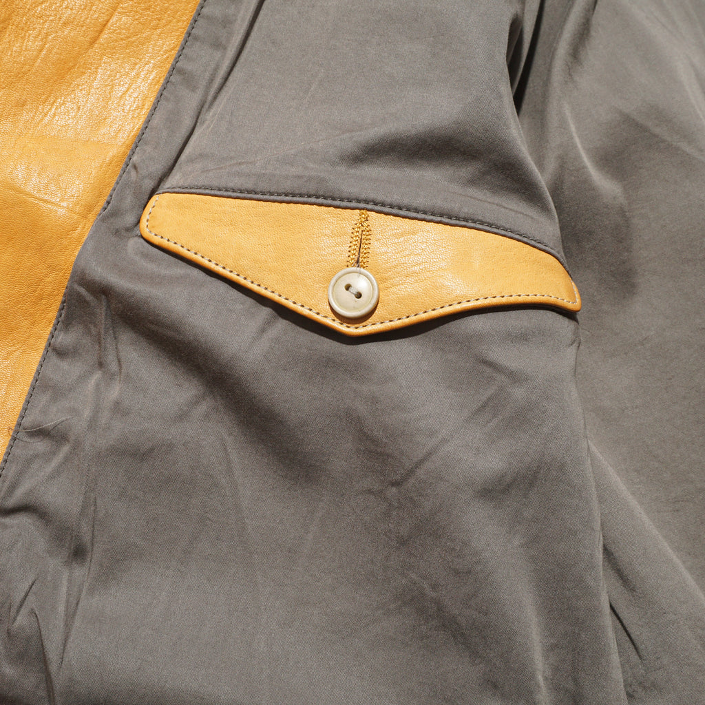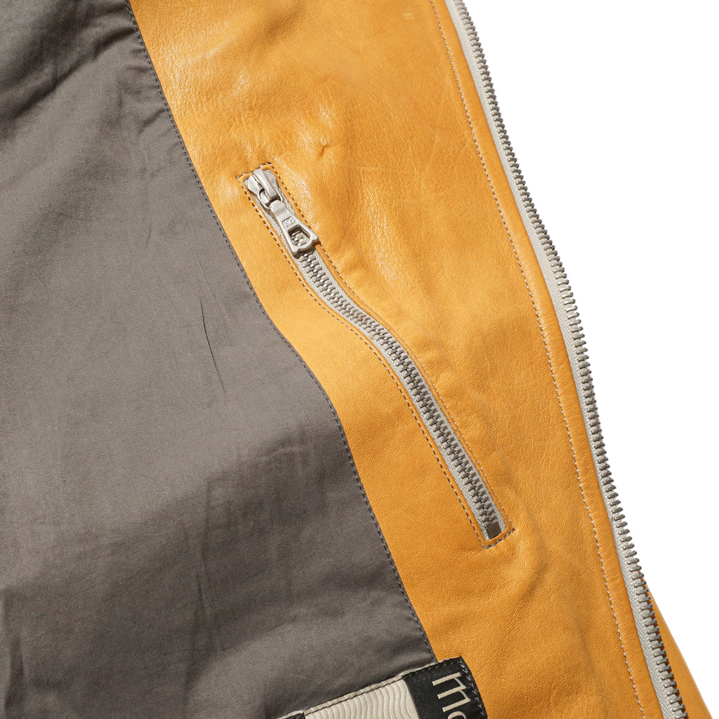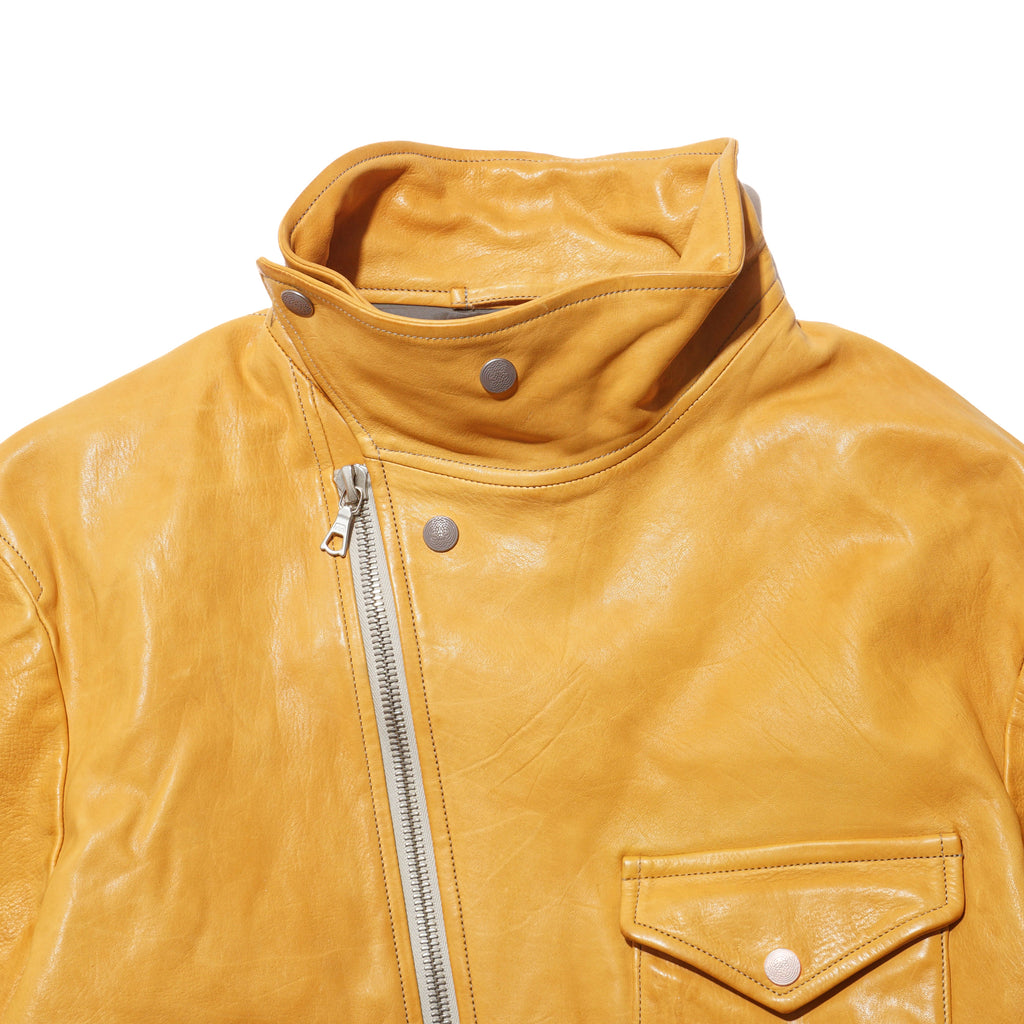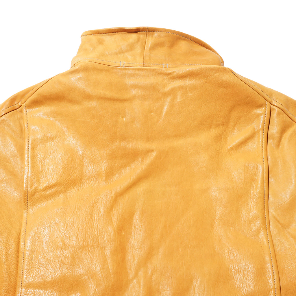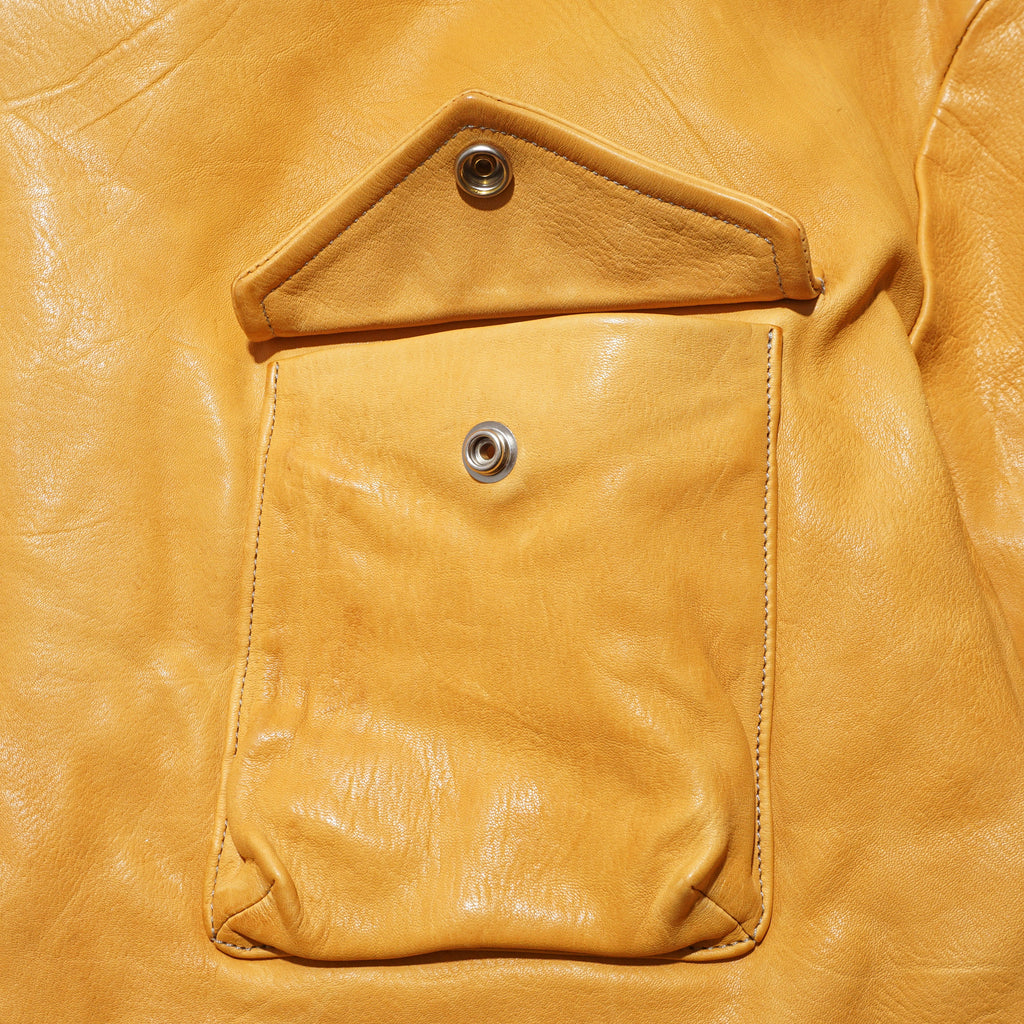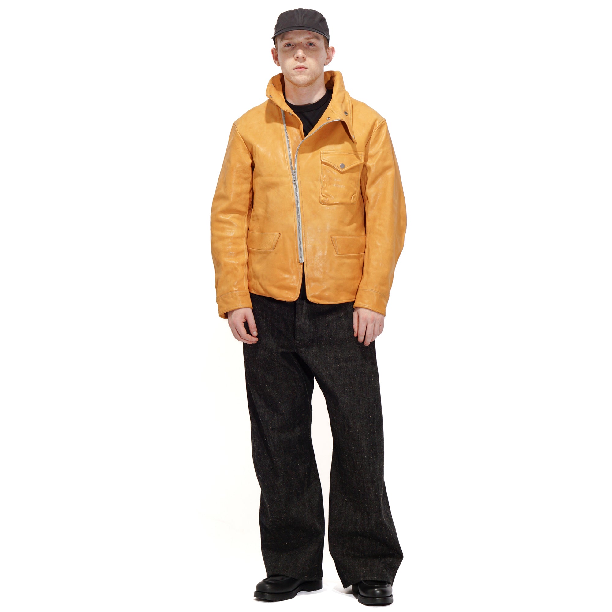 Made from washed kid horsehide in a straw-yellow tone, this jacket is crafted with leather specially developed by Highland Yak using top-grade Italian raw hides. The hides undergo deep beeswax impregnation for exceptional softness, followed by multiple washing processes to enhance natural grain, texture, and subtle aging effects. Inspired by the early Royal Air Force “Sidcot” flight suit, the design reinterprets it as a refined side-zip jacket with an asymmetrical collar that can be secured with three snap buttons or left open for a relaxed look. Functional details include two action pleats and adjustable tabs at the back, a twill wool lining in the body for warmth, quilted insulation in the sleeves, and custom snaps engraved with this season’s magnetic interference motif.