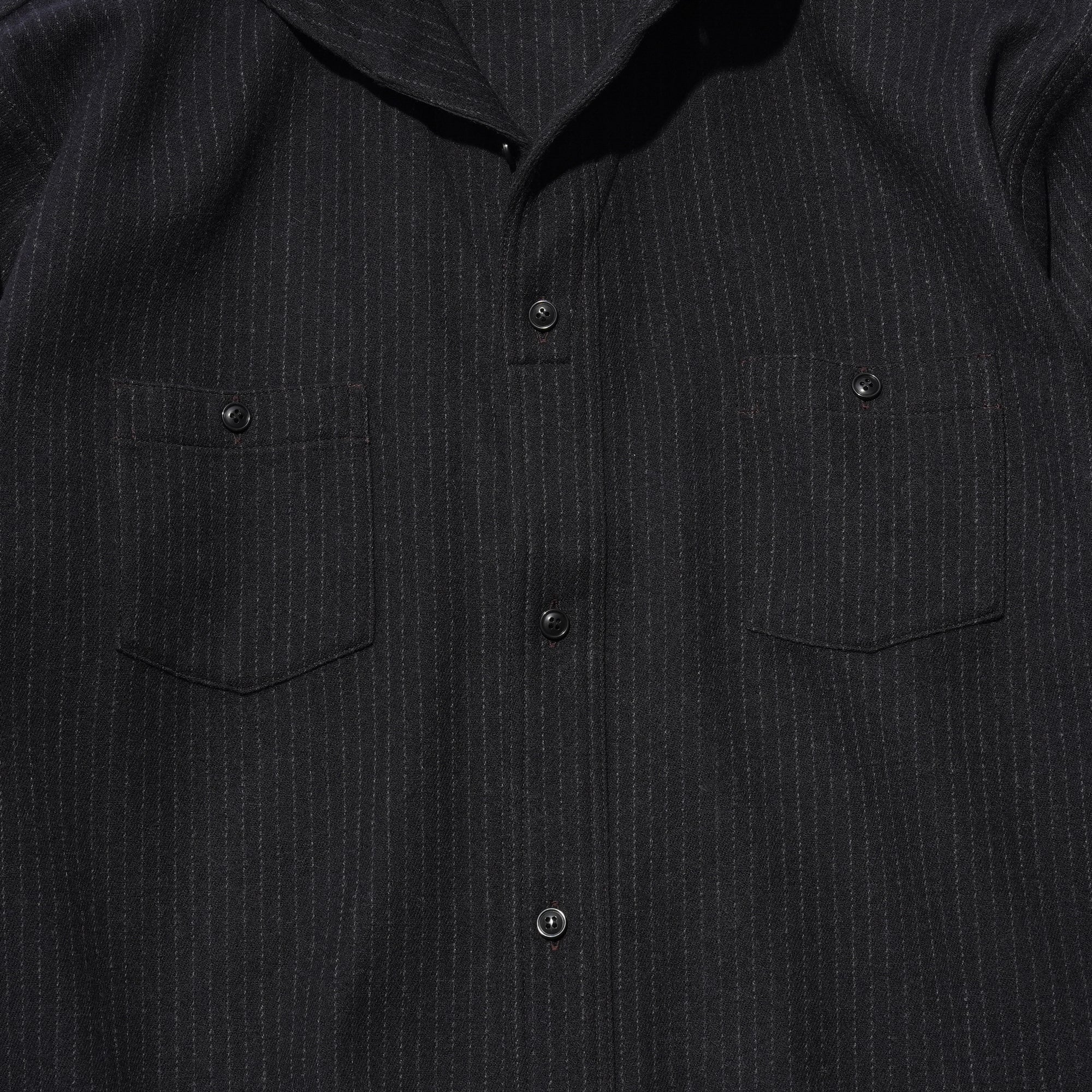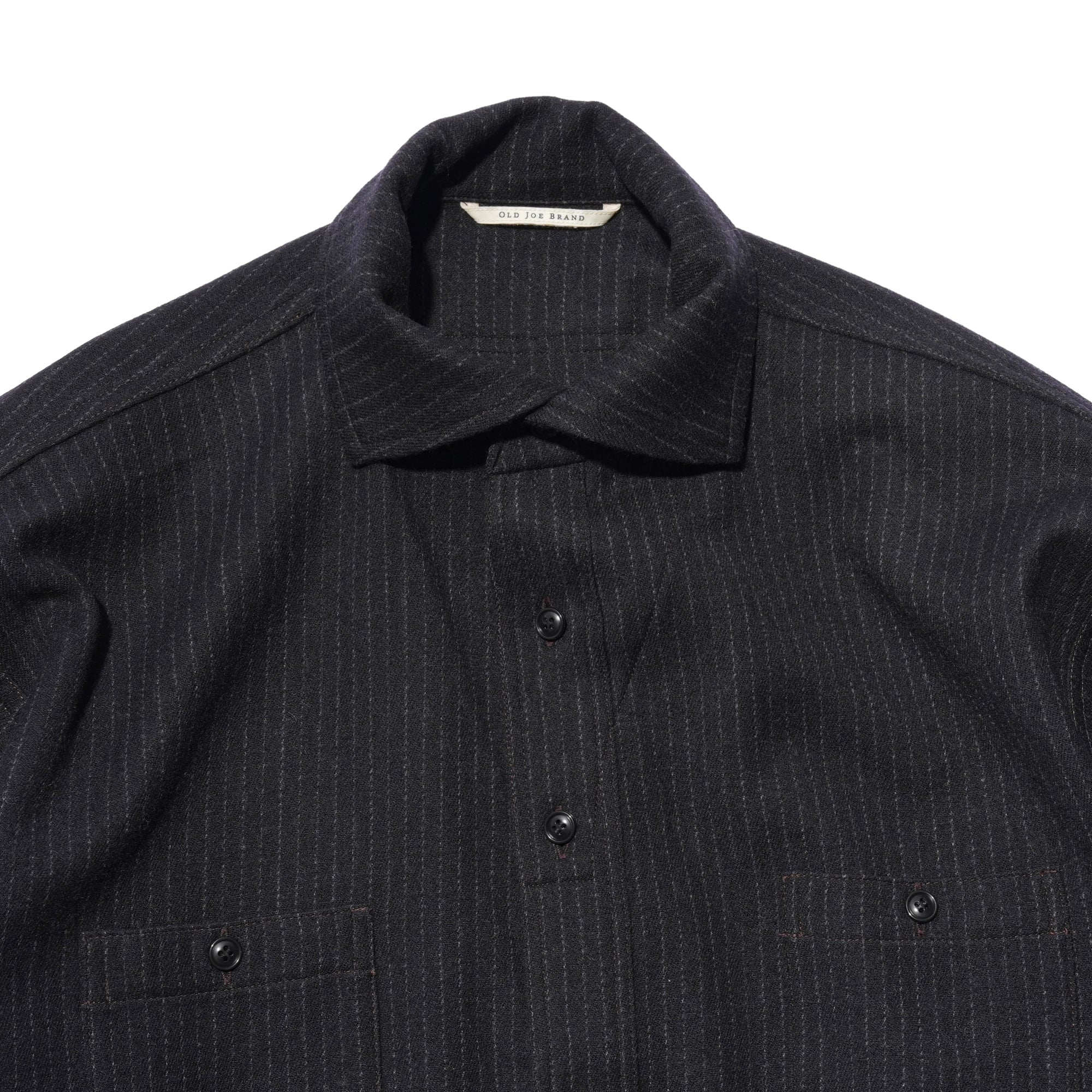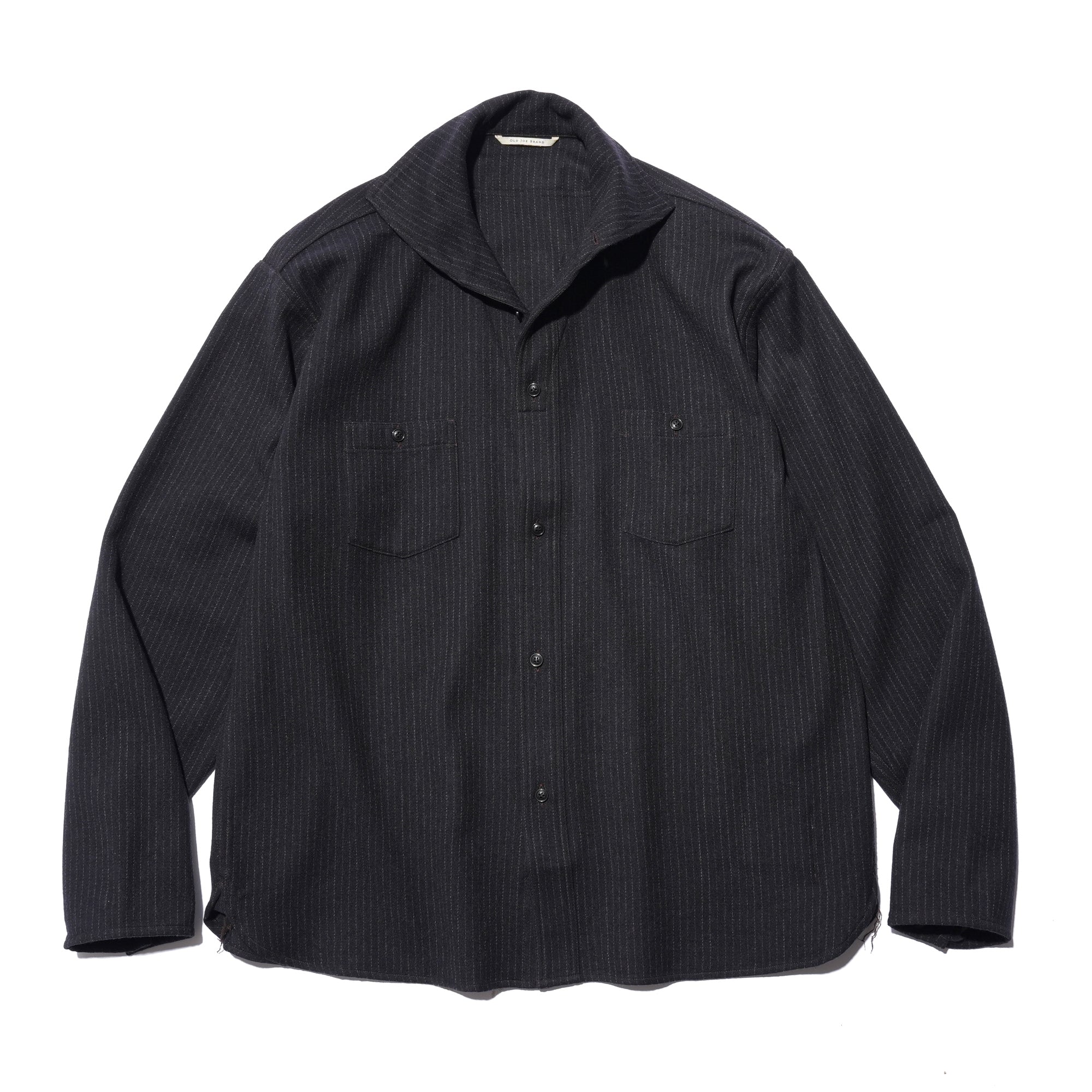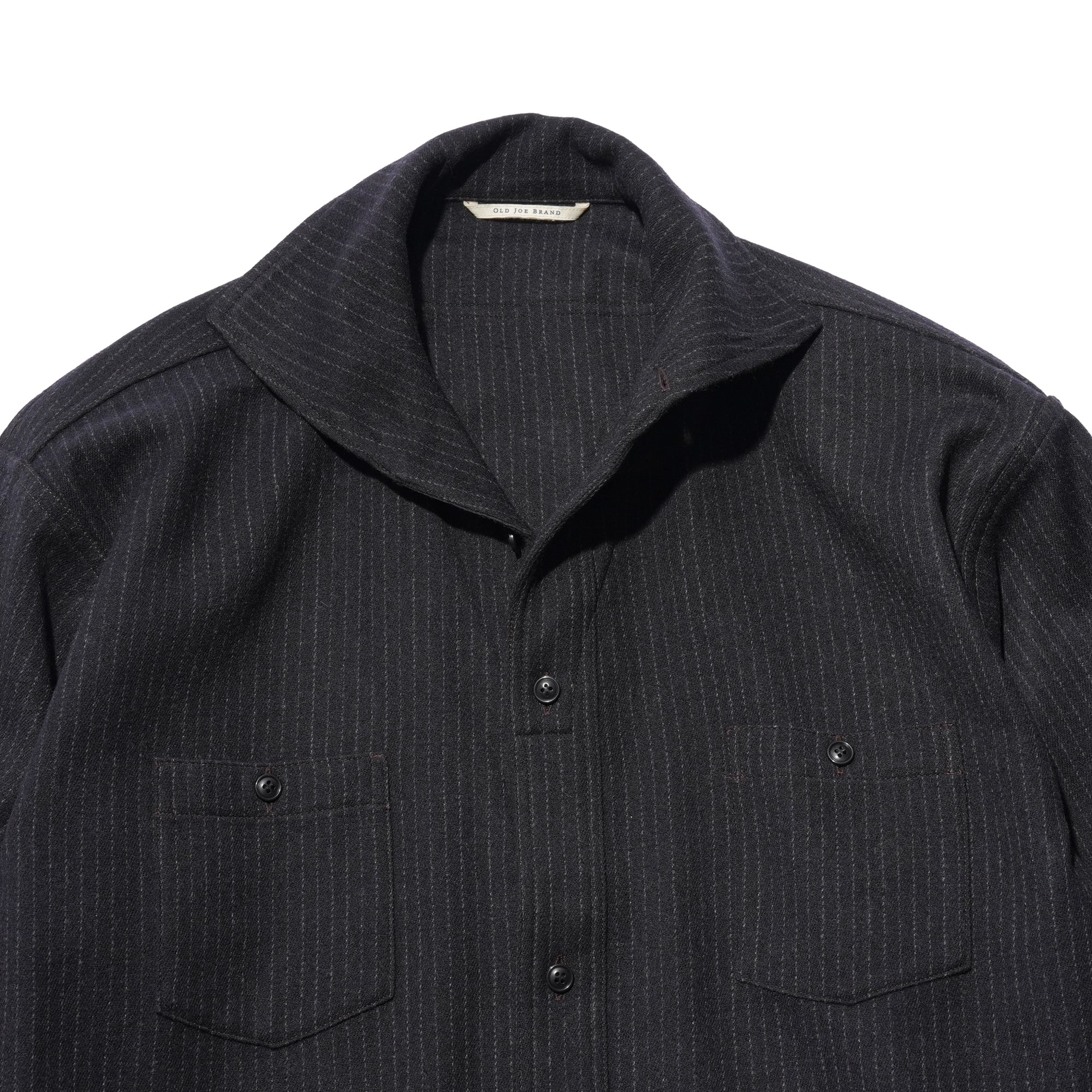 - Popular in the 1920s–30s, the camp collar defines this piece with a design now rarely seen. Its one-piece construction with a front placket gives the shirt a unique character, while pentagonal double pockets in wool flannel reference classic workwear and add a refined, tailored feel. Crafted from 100% Tasmanian wool, the fabric is prized for its exceptional softness, often compared to cashmere. Woven in a 2/1 twill, it offers a balanced weight and structure. A two-stage pressing finish enhances its natural luster and delivers a rich, polished texture.