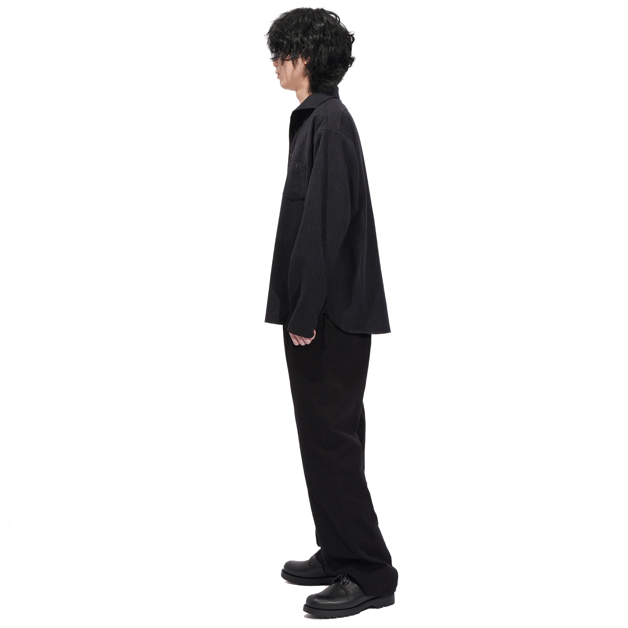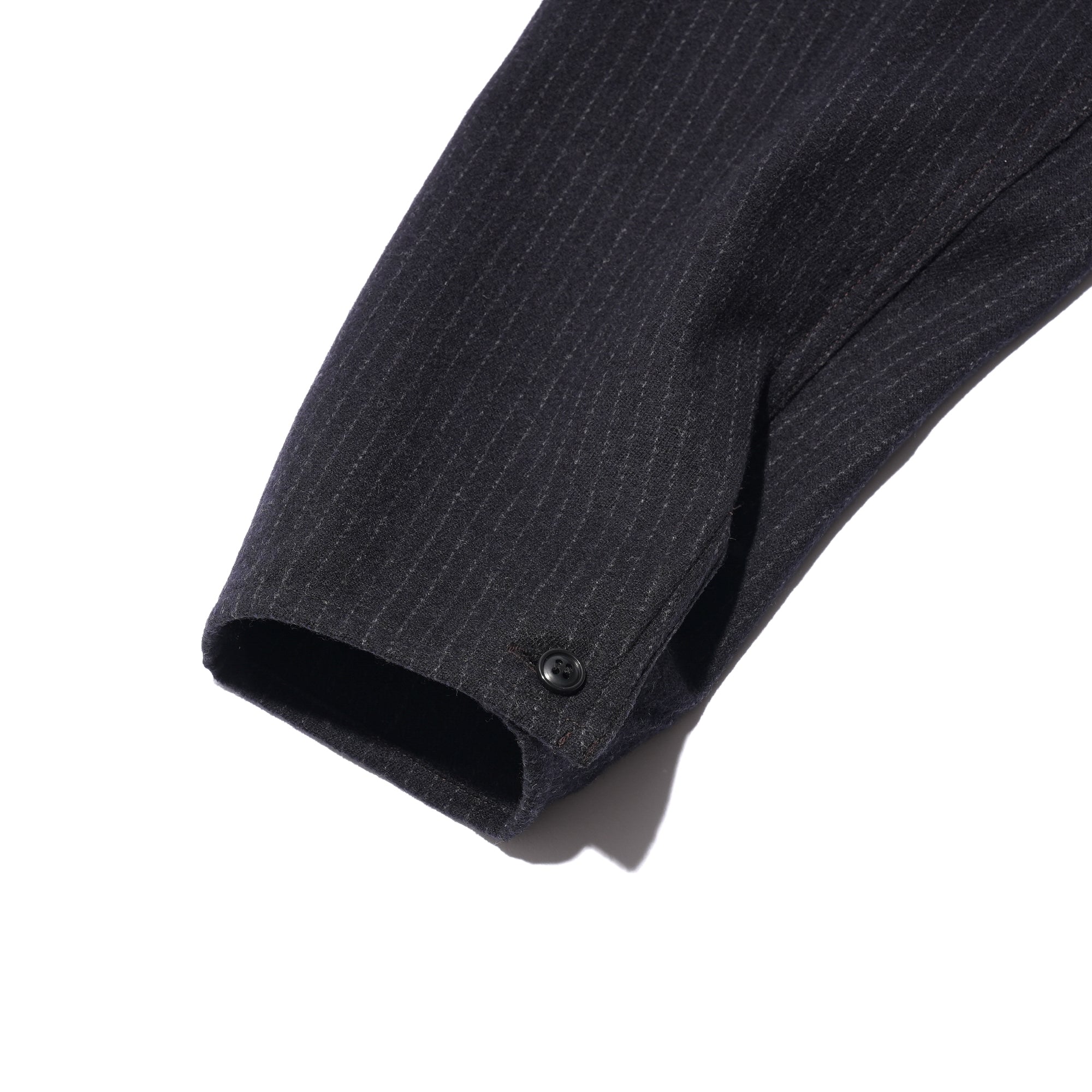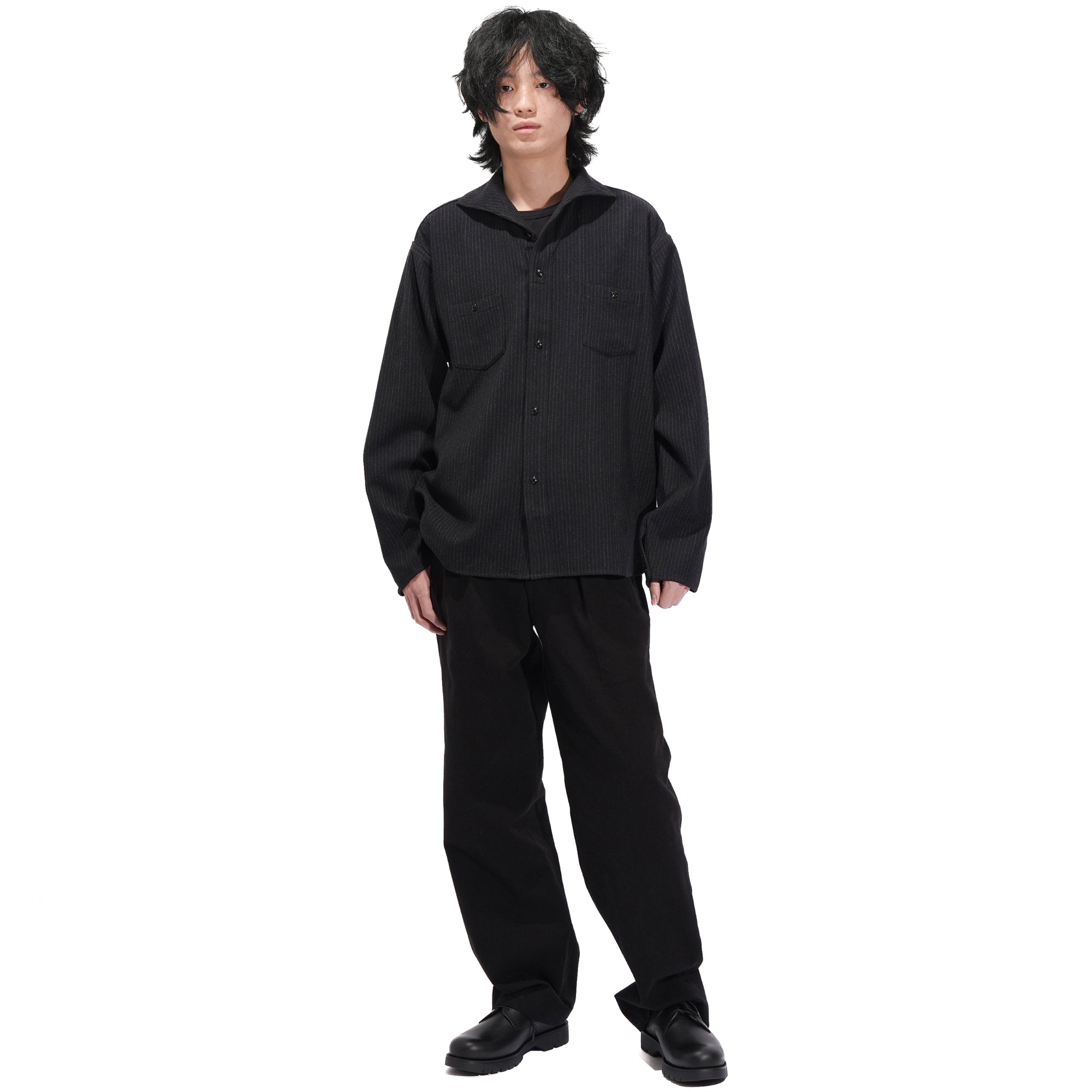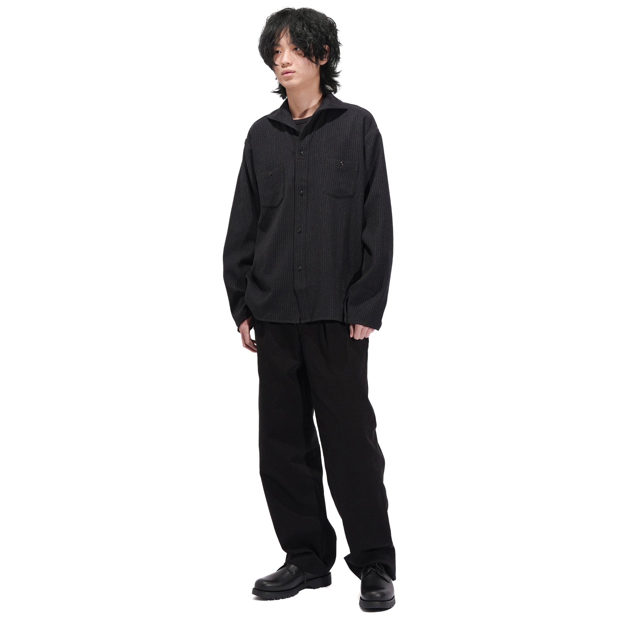 - Popular in the 1920s–30s, the camp collar defines this piece with a design now rarely seen. Its one-piece construction with a front placket gives the shirt a unique character, while pentagonal double pockets in wool flannel reference classic workwear and add a refined, tailored feel. Crafted from 100% Tasmanian wool, the fabric is prized for its exceptional softness, often compared to cashmere. Woven in a 2/1 twill, it offers a balanced weight and structure. A two-stage pressing finish enhances its natural luster and delivers a rich, polished texture.