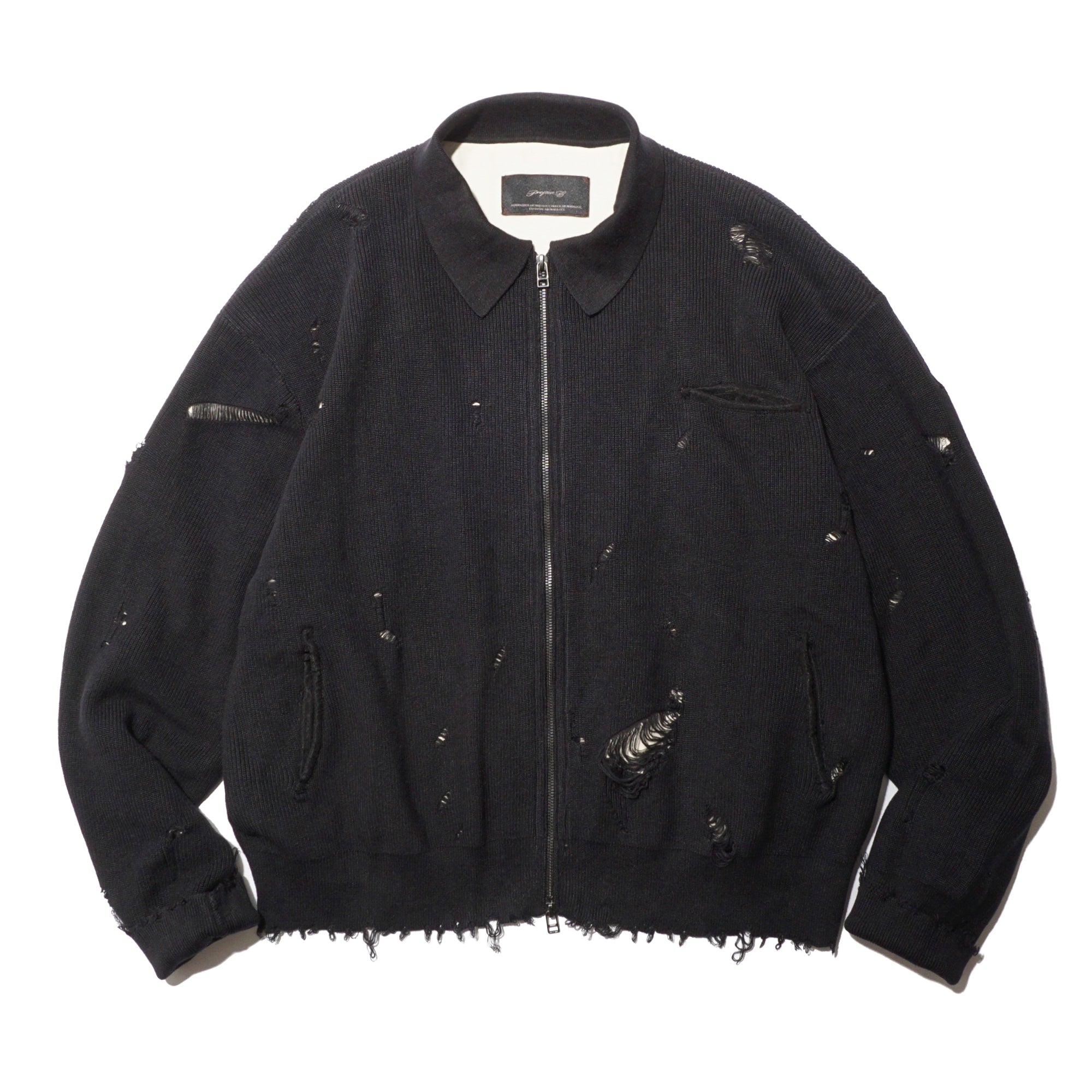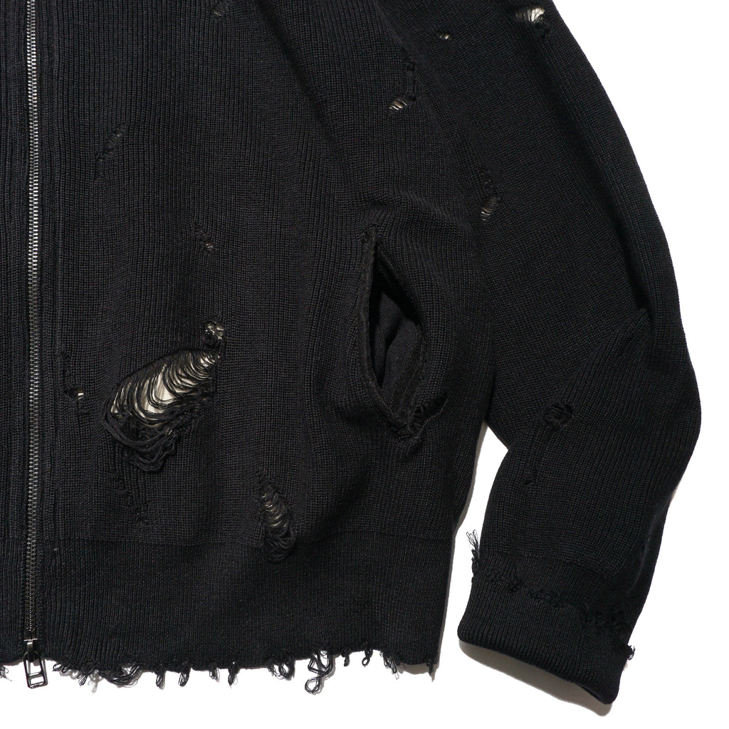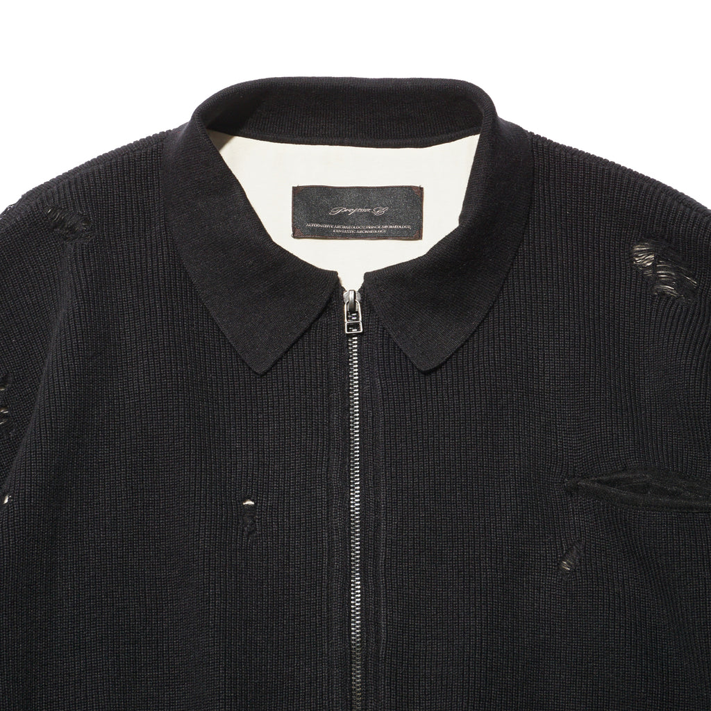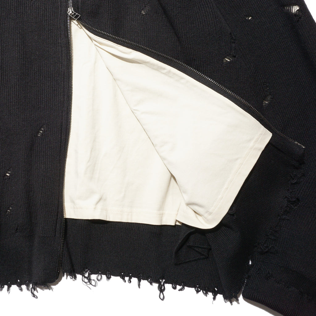 A ramie-cotton blend knit jacket with overall distressed detailing. Features a two-way zipper, two side pockets, and a cream-colored stretchy lining. The ramie-cotton blend combines durability, structure, and breathability—ramie adds strength and a refined texture, while cotton softens the hand feel for comfort. Together, they create a balanced knit that ages beautifully over time.