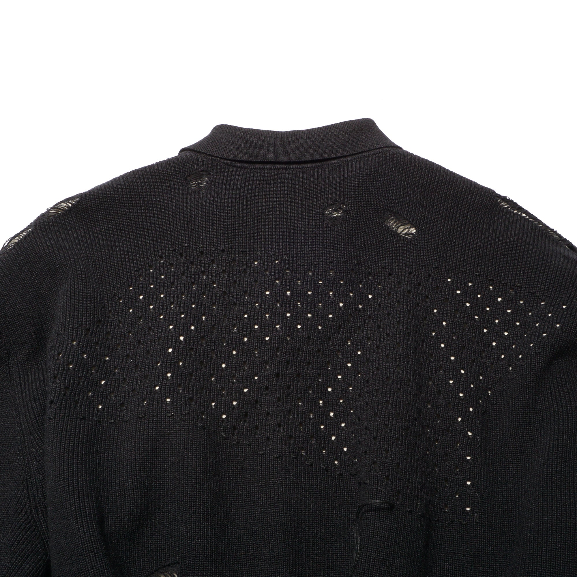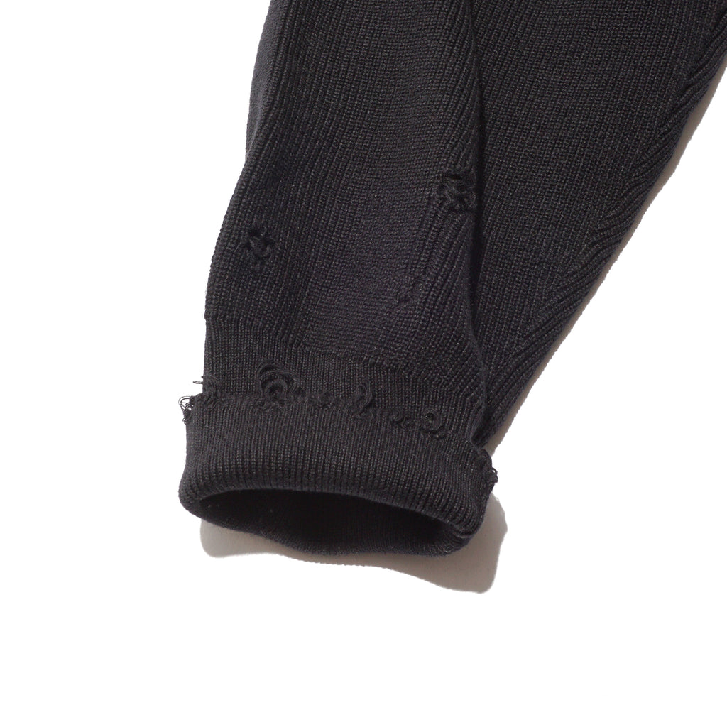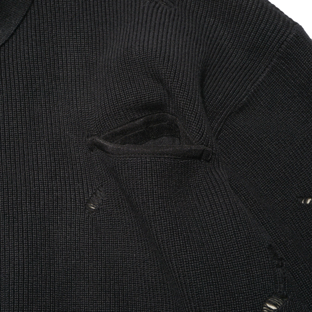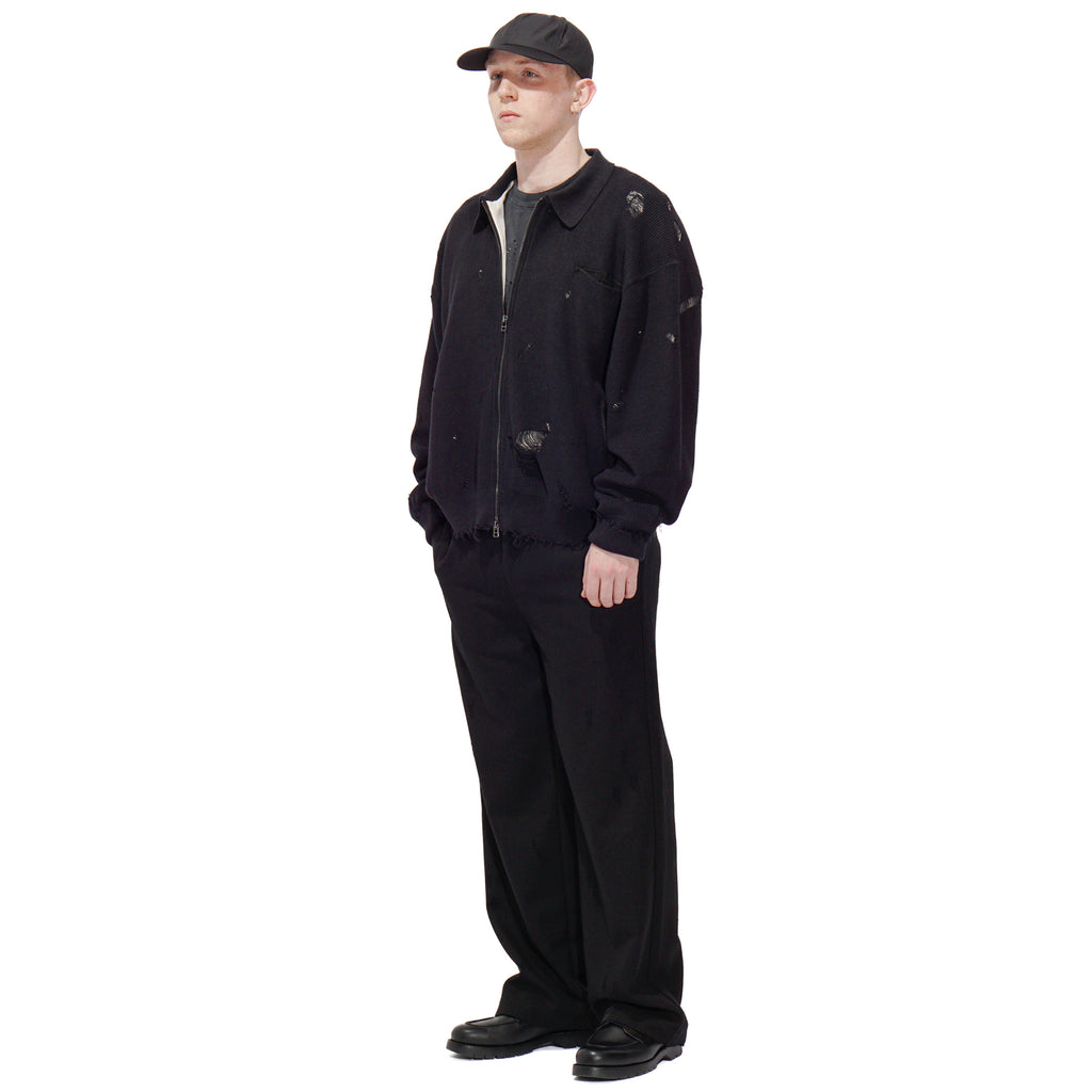 A ramie-cotton blend knit jacket with overall distressed detailing. Features a two-way zipper, two side pockets, and a cream-colored stretchy lining. The ramie-cotton blend combines durability, structure, and breathability—ramie adds strength and a refined texture, while cotton softens the hand feel for comfort. Together, they create a balanced knit that ages beautifully over time.