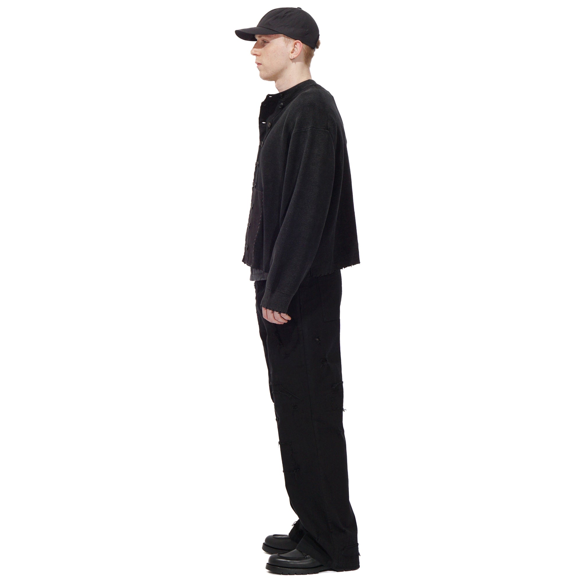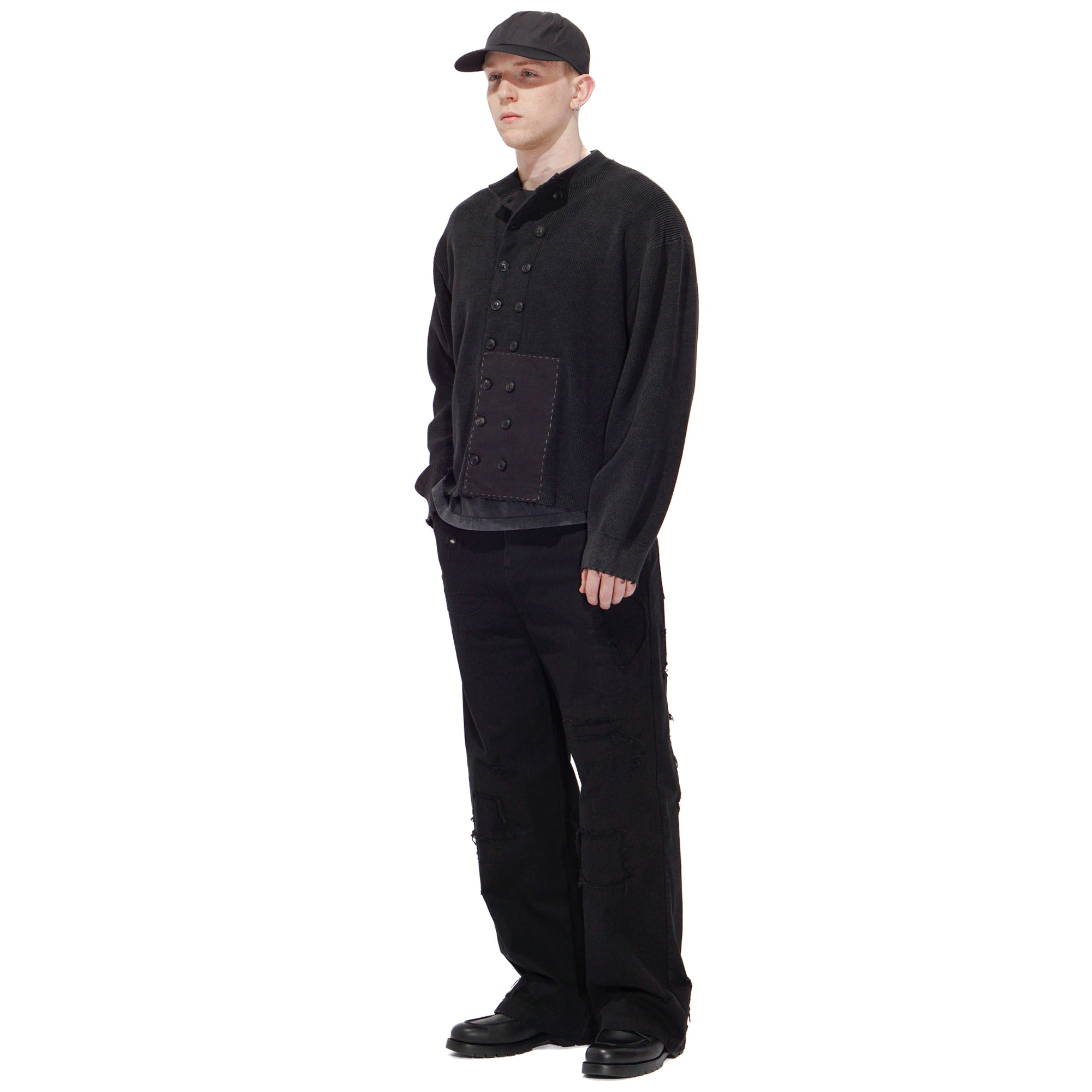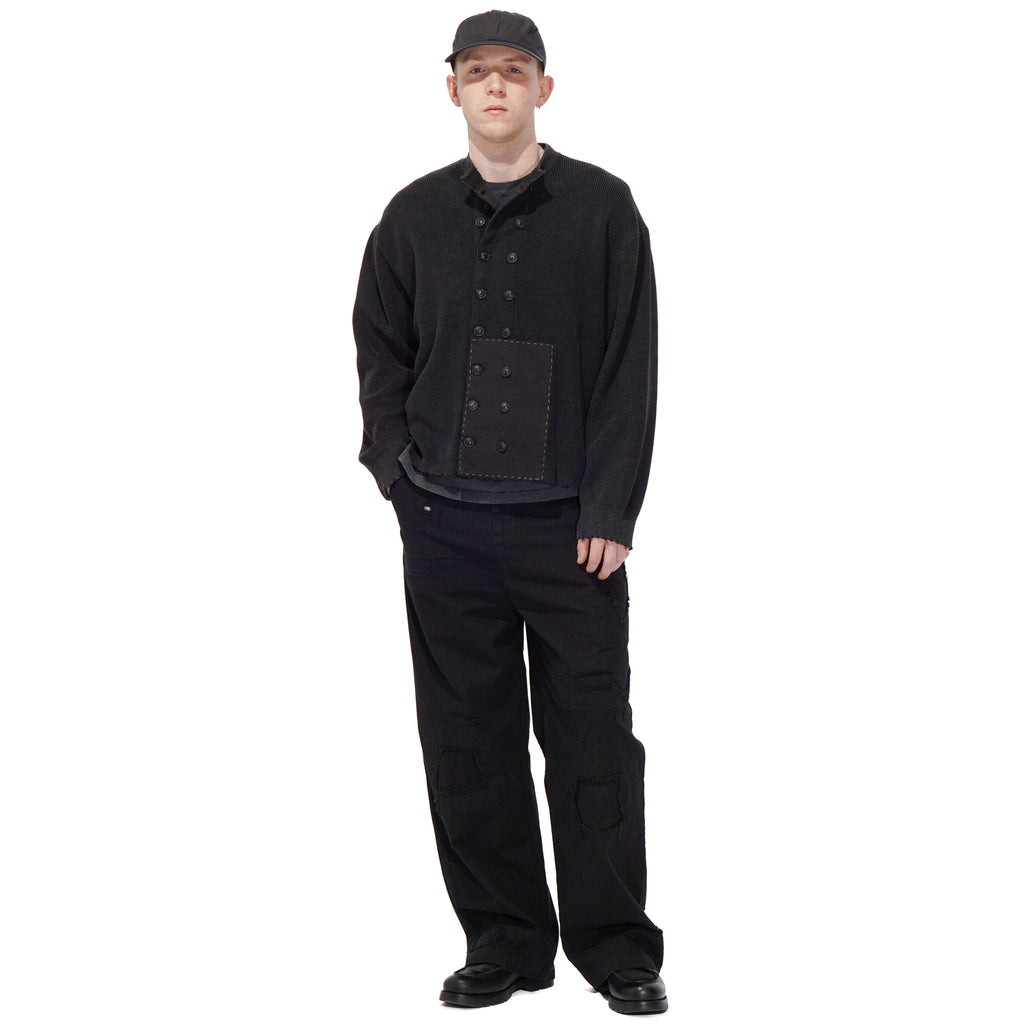 Crafted from a ramie-cotton blend knit, featuring a double-breasted button closure and distressed patchwork details. The ramie-cotton blend offers a balance of structure and softness—ramie adds durability, shape retention, and a subtle sheen, while cotton provides comfort and breathability. Together, they create a textured knit that ages beautifully over time.