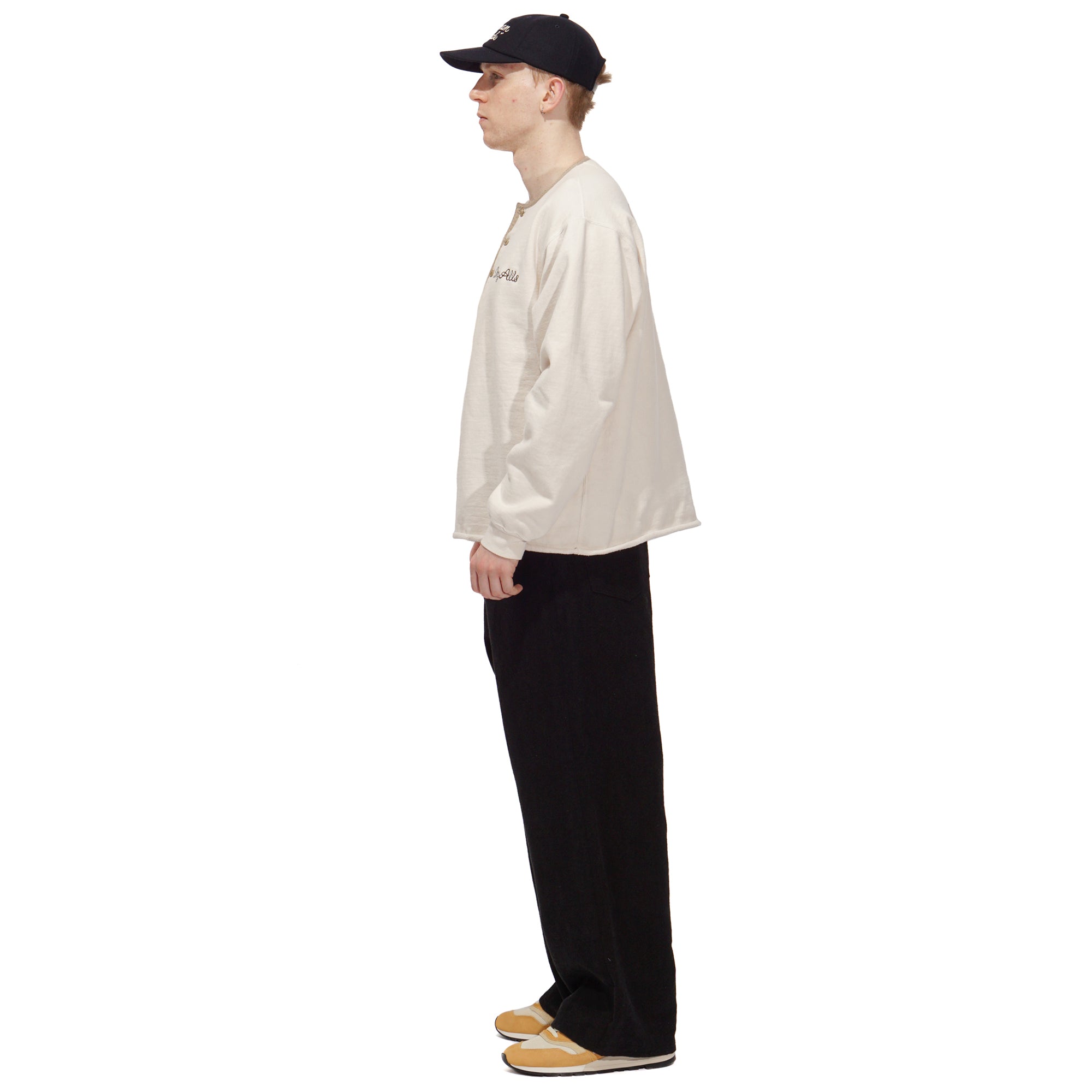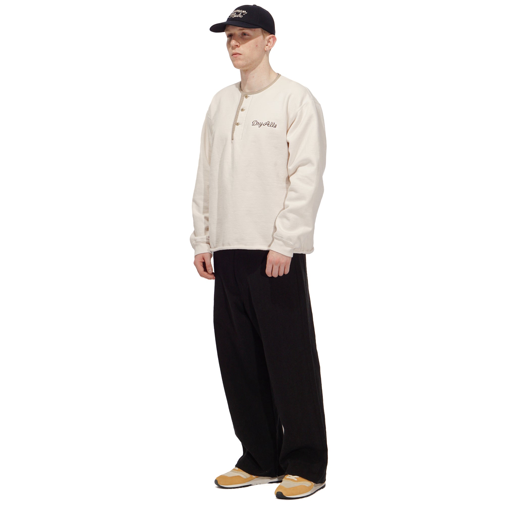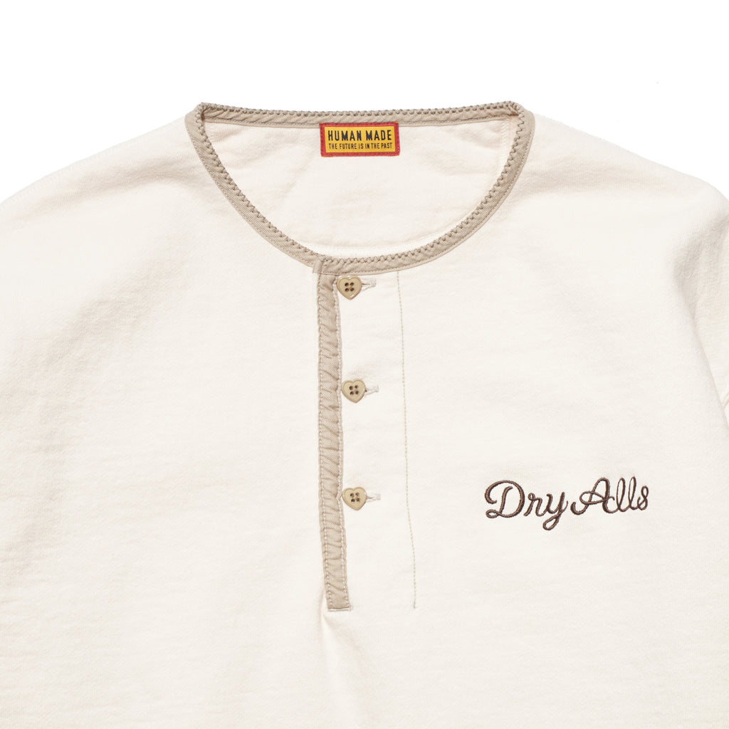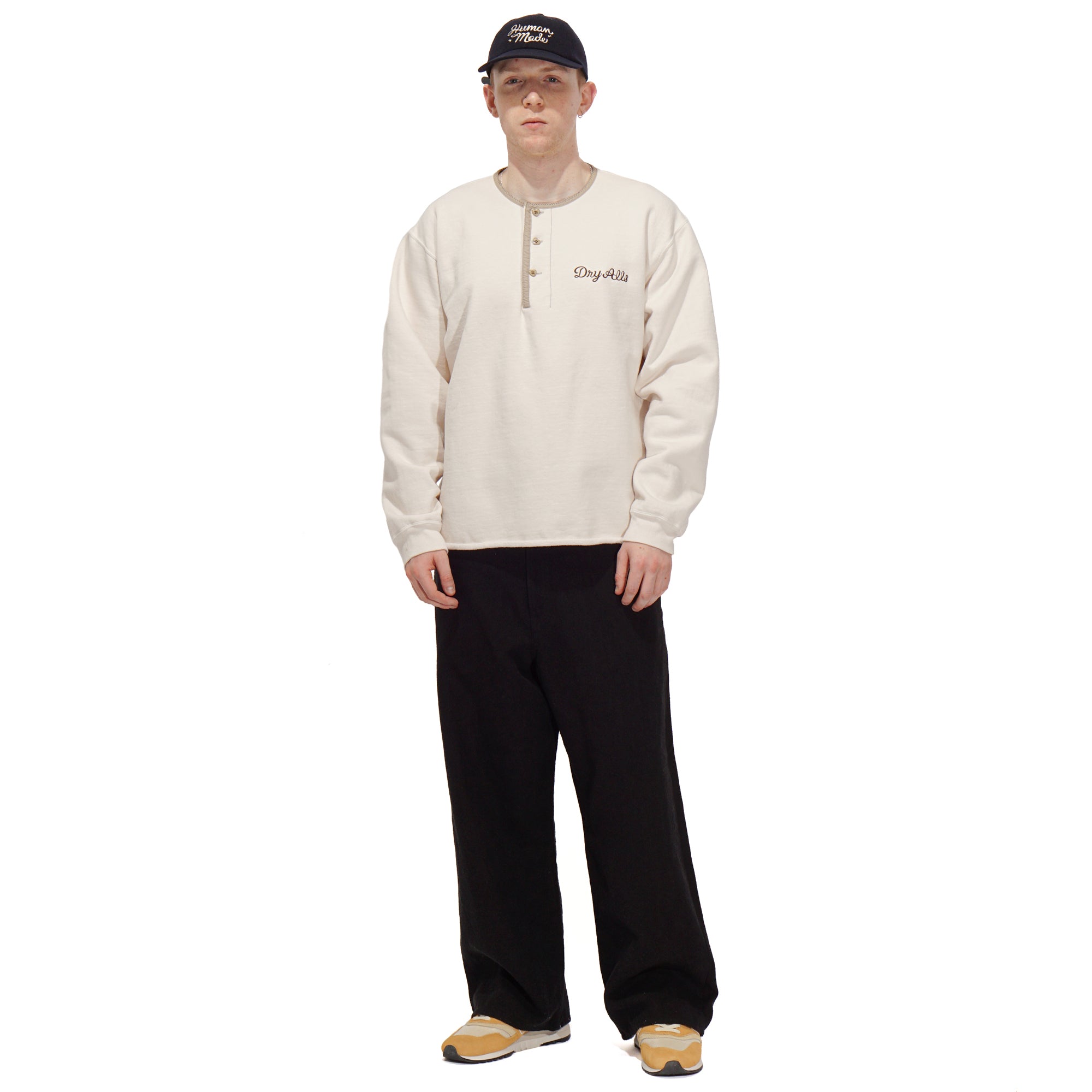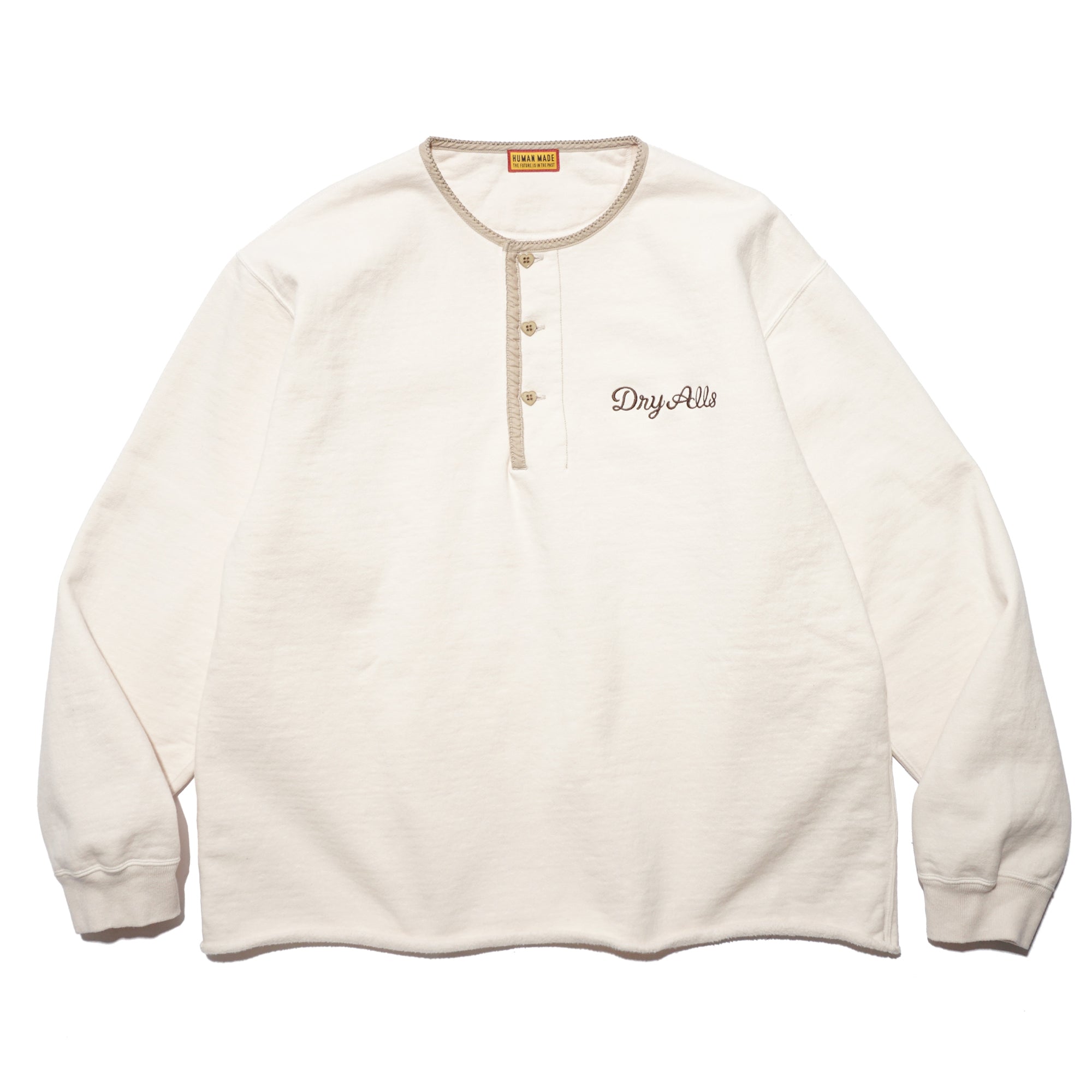- This sweatshirt features a Henley neckline with a three-heart button closure and zig-zag stitching along the collar, crafted from warm, soft fleece-lined cotton for extra comfort. Its textured colors are created through detailed dyeing techniques, while the back is finished with a brand logo and “DRY ALLS” embroidery accents the left chest.