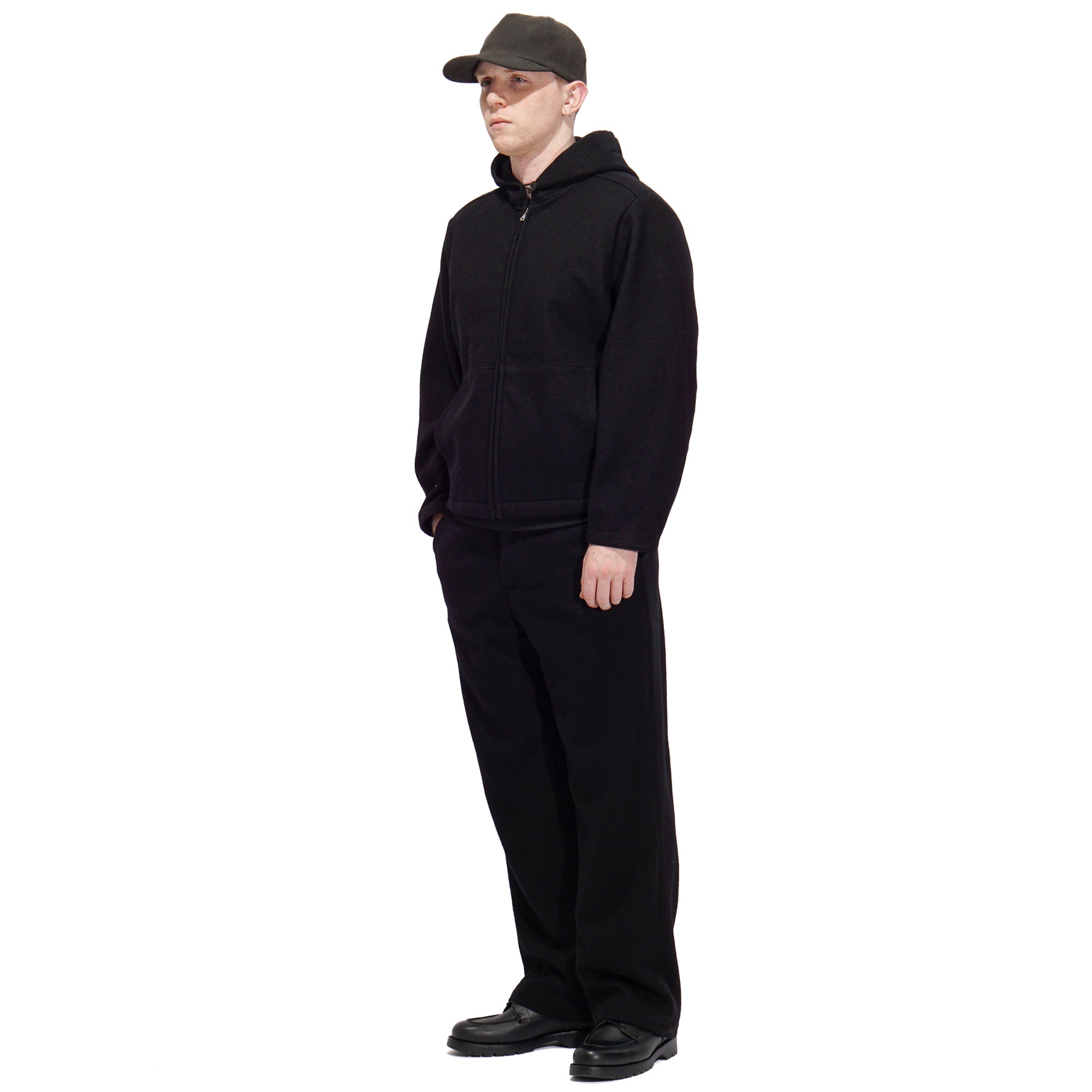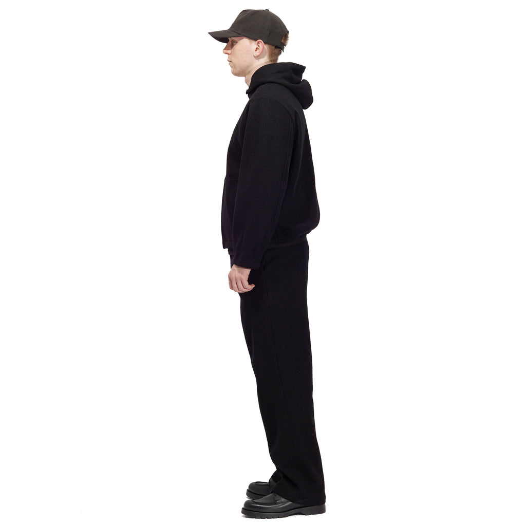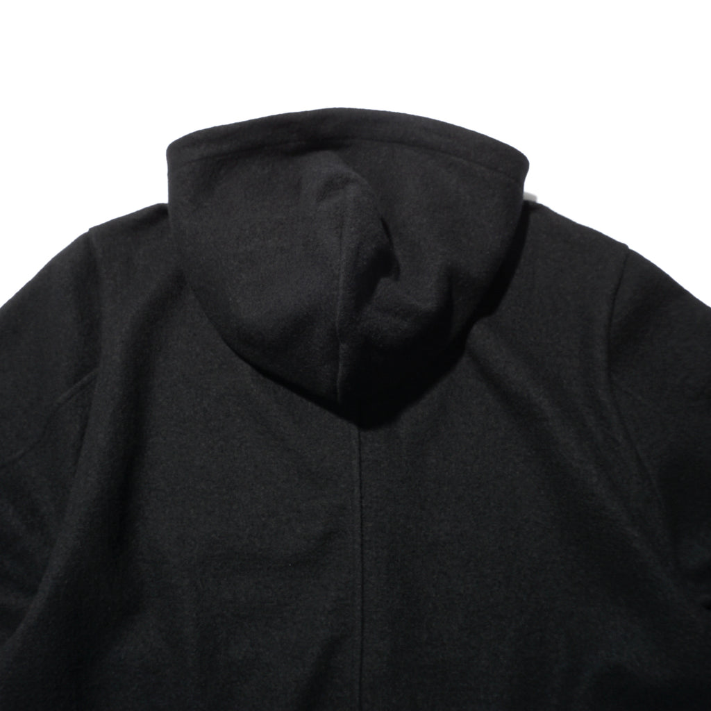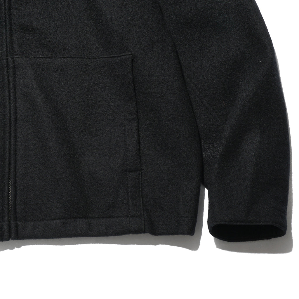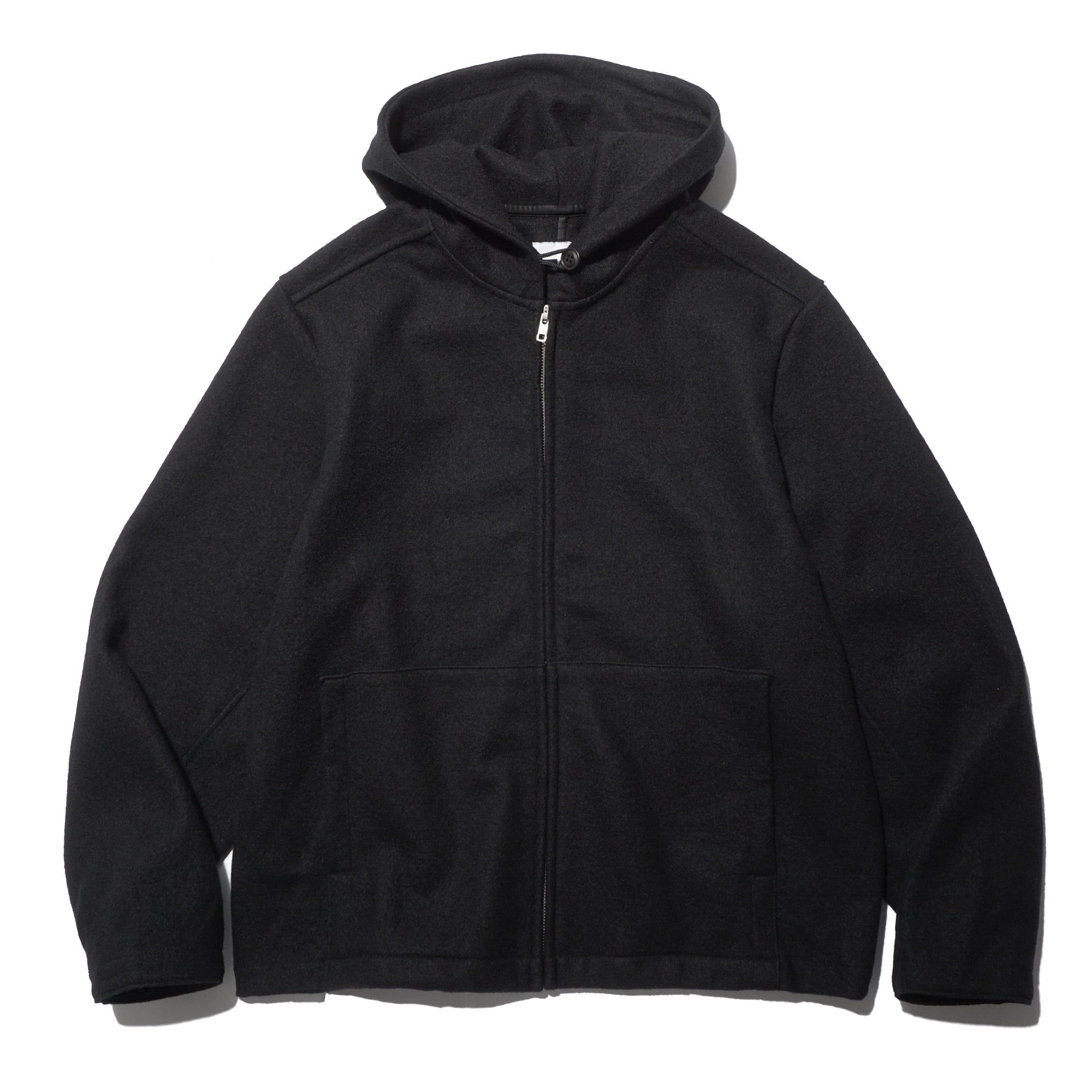 - A wide, boxy-fitting hooded jacket with a slightly cropped body. Crafted from 100% wool knit in Japan, the heavyweight fabric drapes lightly and straight. Offering a light yet inviting texture that balances warmth with ease of movement. High-heat finishing gives the fabric an organic, almost worsted-like texture. Its 2-piece sleeves are shaped to follow the natural posture of the arm.