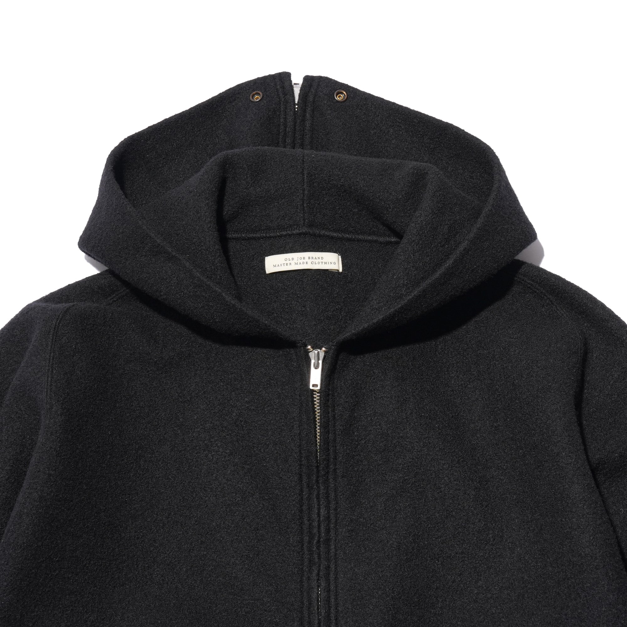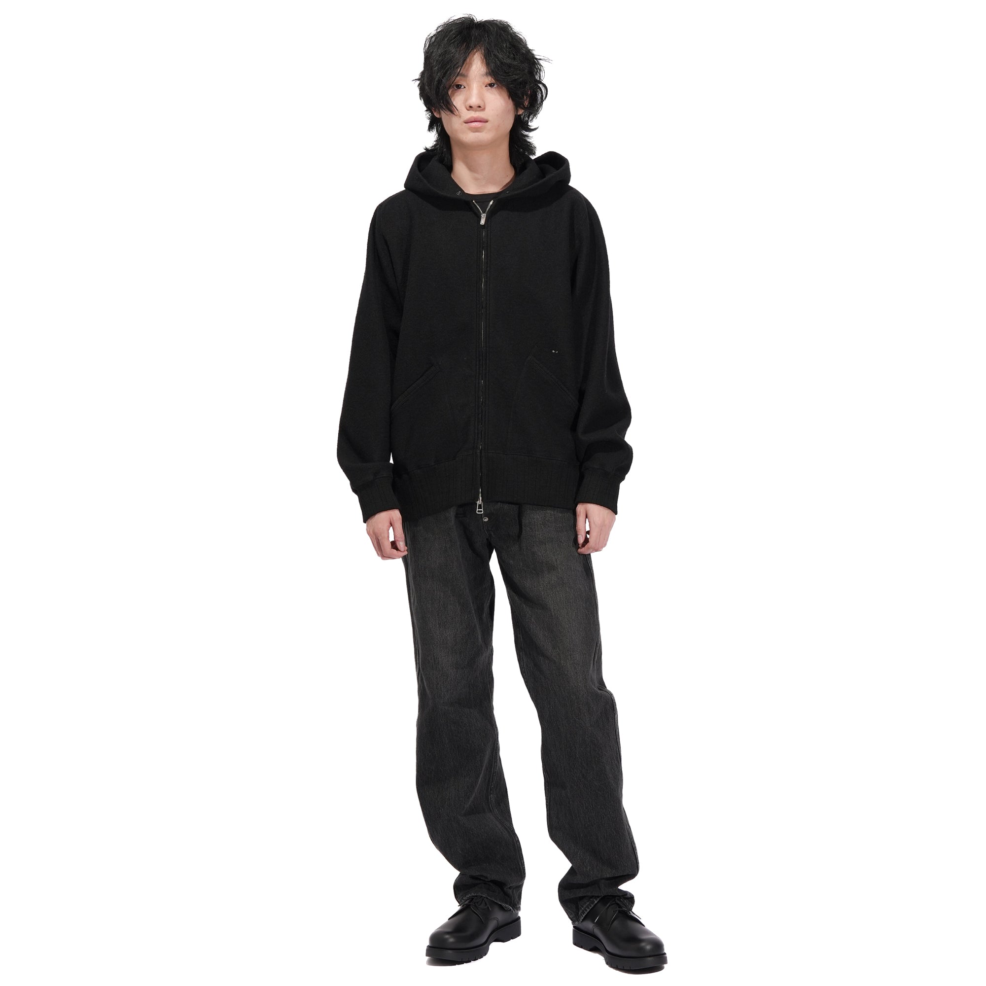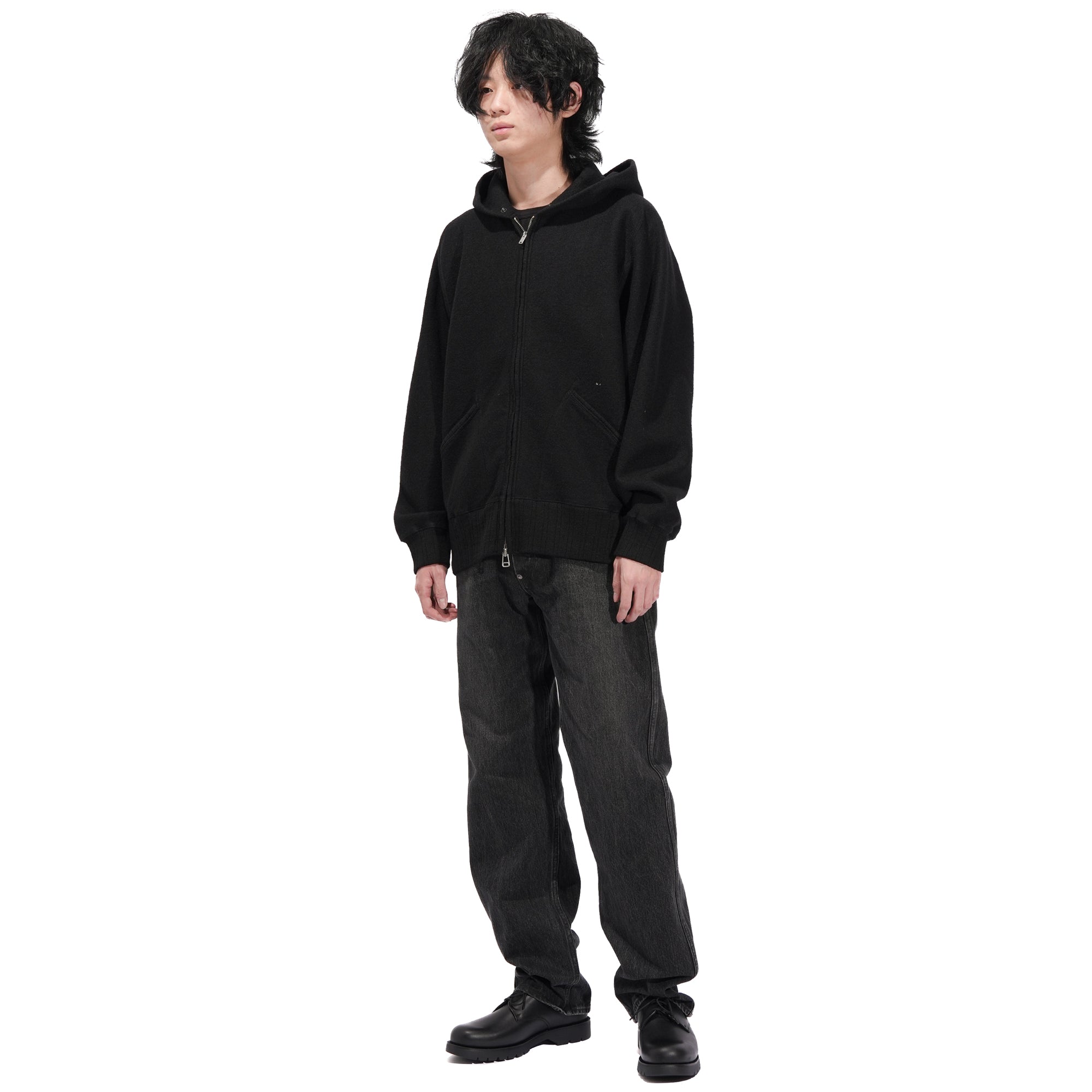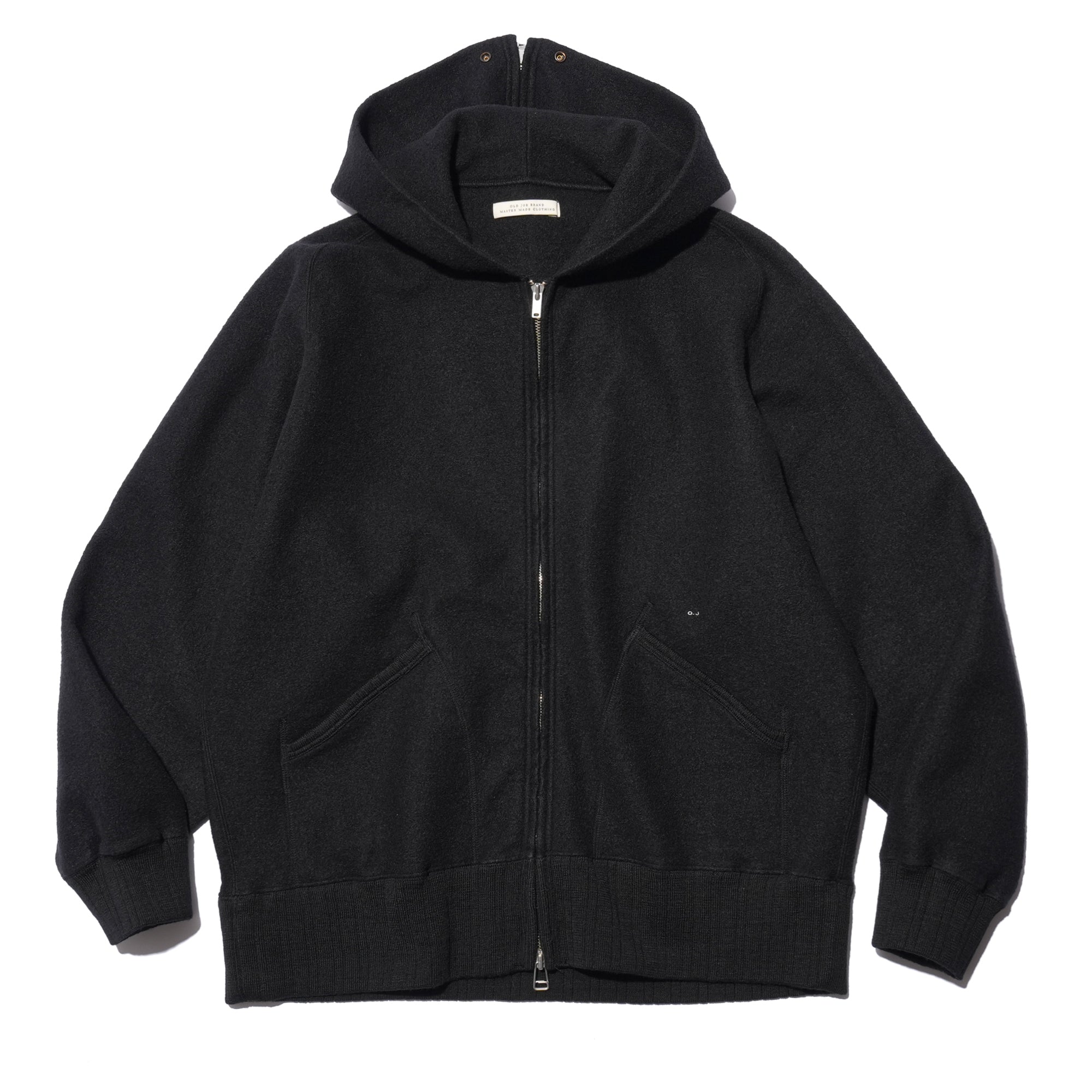 - This zip-front hoodie features a hood design that can be fully unzipped and folded back to form a collar-like silhouette. Made from a refined wool–cotton blend, it delivers a soft, luxurious hand feel, while subtly faded stencil prints lend a vintage-inspired edge. The brushed fleece fabric blends shrink-resistant fine New Zealand wool with Australian merino, making it suitable for home washing. The reverse side is brushed cotton for added warmth and insulation. Knit on vintage machines, the fleece has longer back loops than standard constructions, creating a light, airy, felt-like texture that enhances comfort and dimensionality.