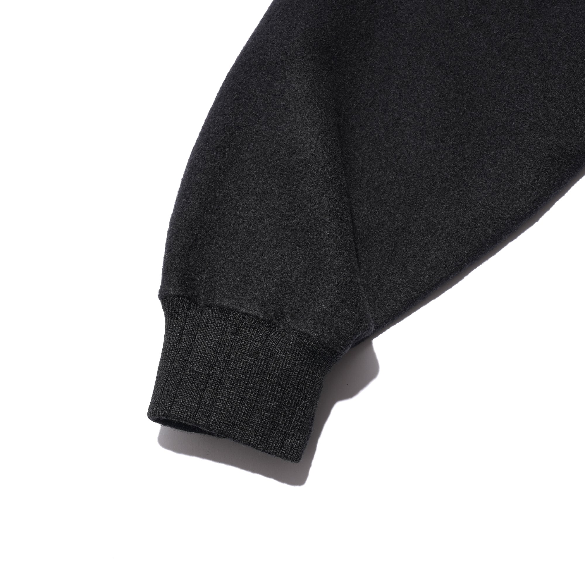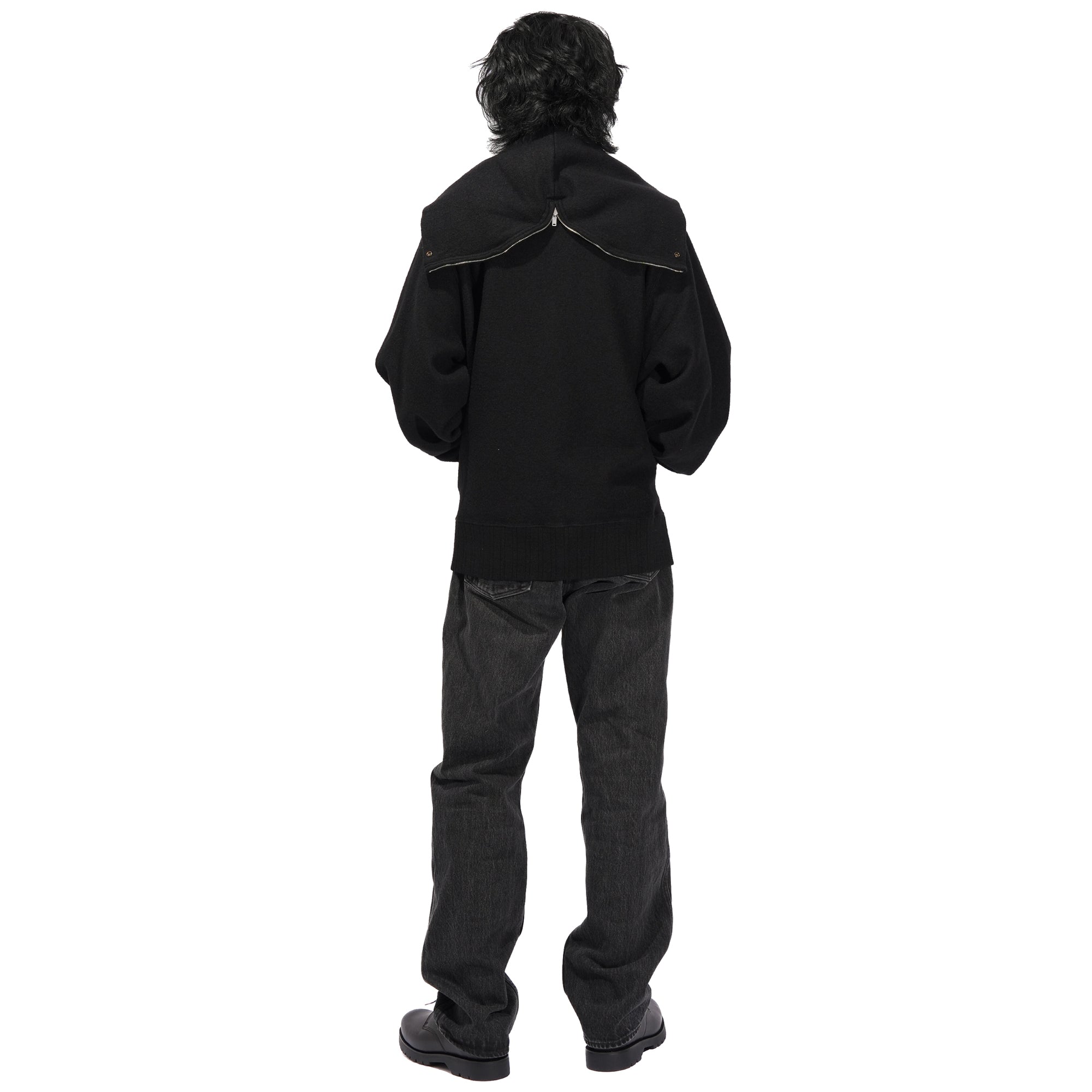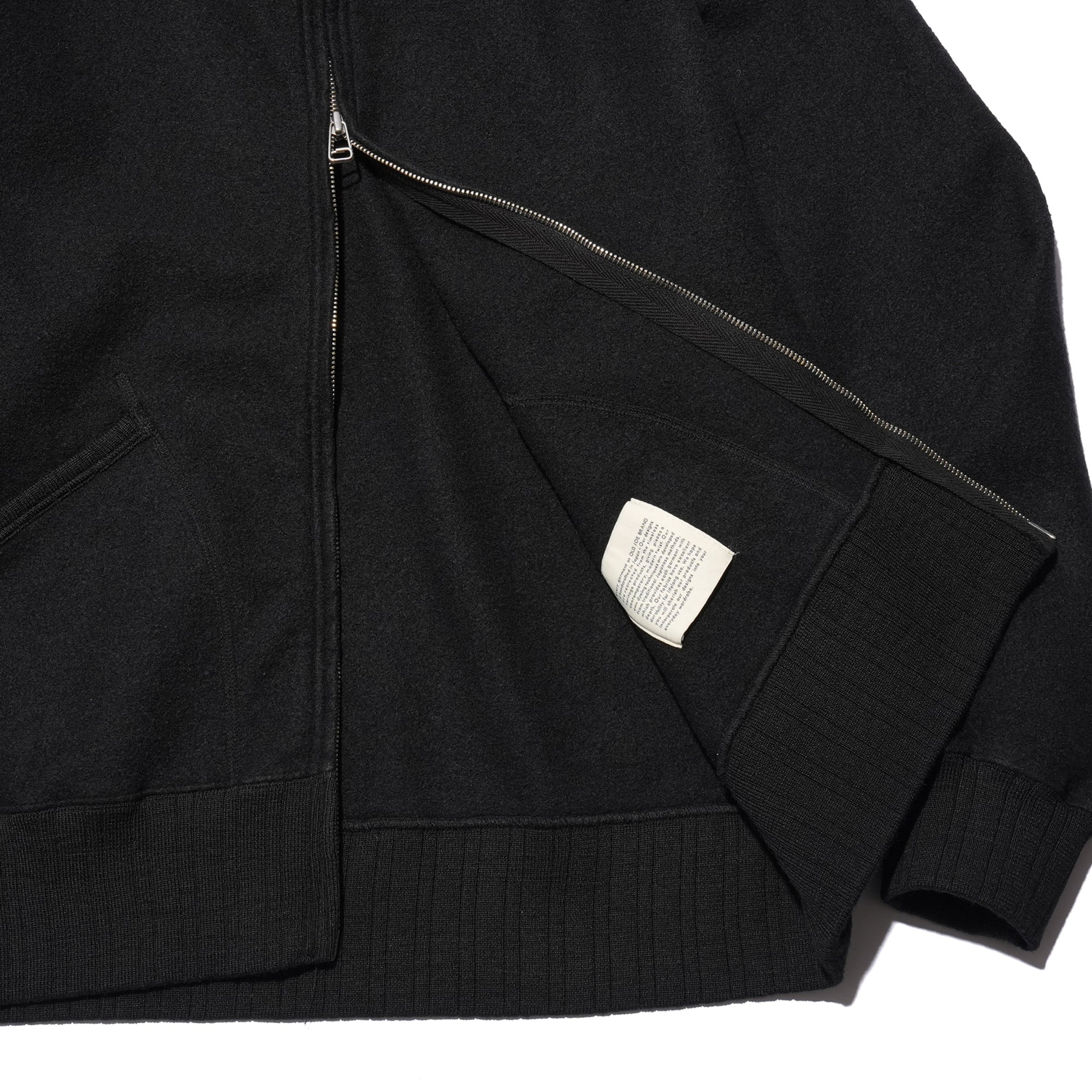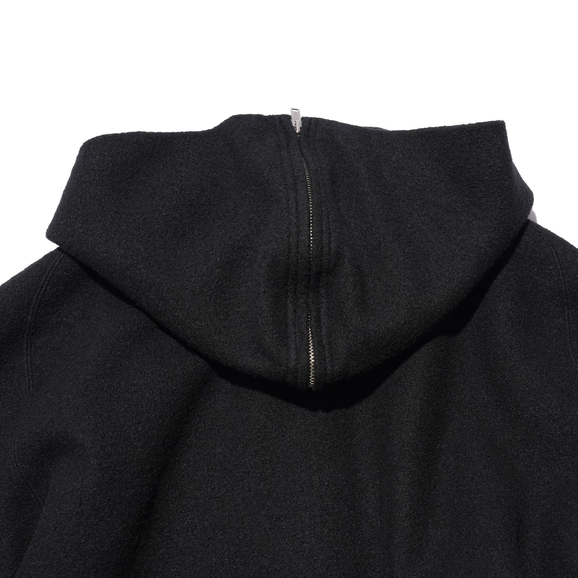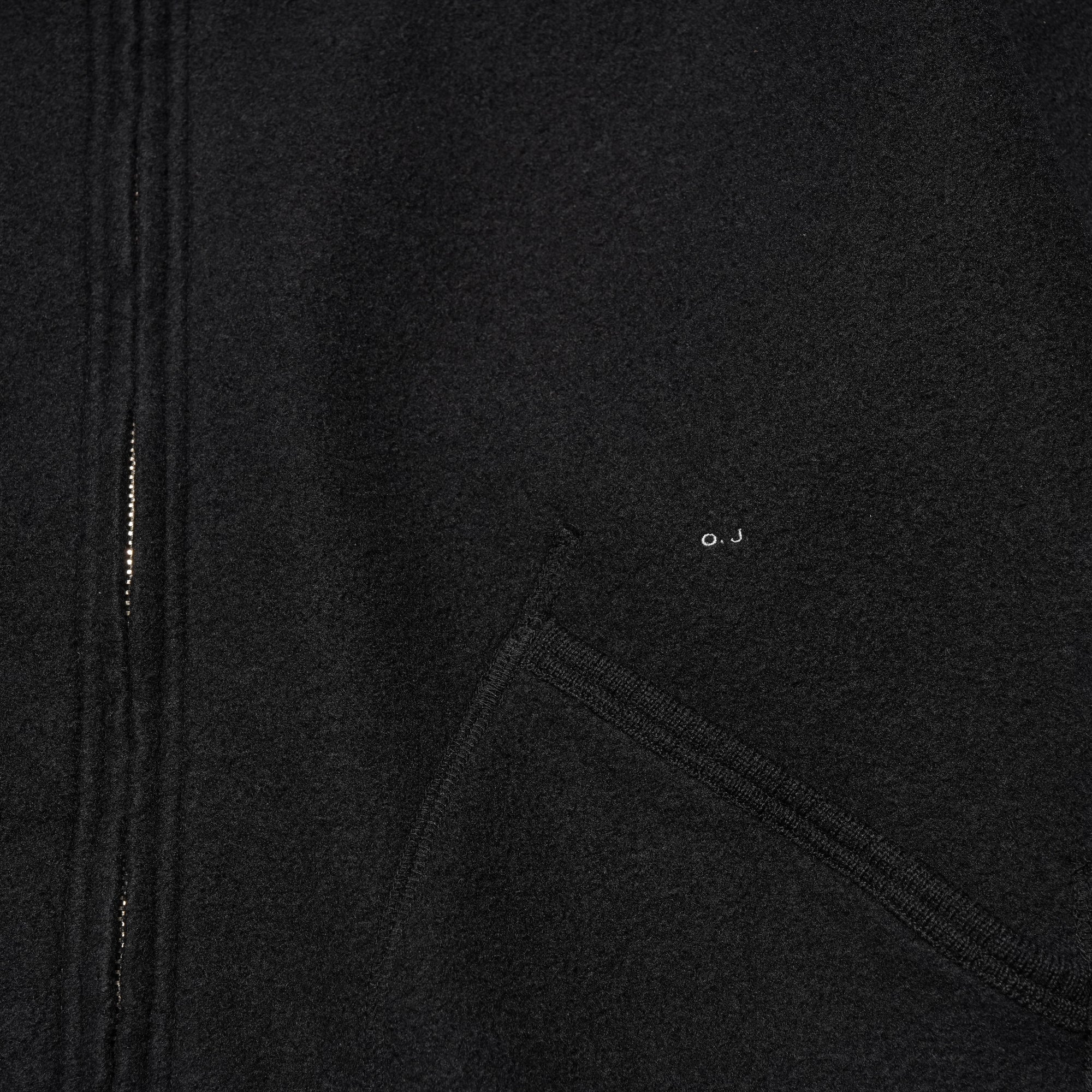 - This zip-front hoodie features a hood design that can be fully unzipped and folded back to form a collar-like silhouette. Made from a refined wool–cotton blend, it delivers a soft, luxurious hand feel, while subtly faded stencil prints lend a vintage-inspired edge. The brushed fleece fabric blends shrink-resistant fine New Zealand wool with Australian merino, making it suitable for home washing. The reverse side is brushed cotton for added warmth and insulation. Knit on vintage machines, the fleece has longer back loops than standard constructions, creating a light, airy, felt-like texture that enhances comfort and dimensionality.
