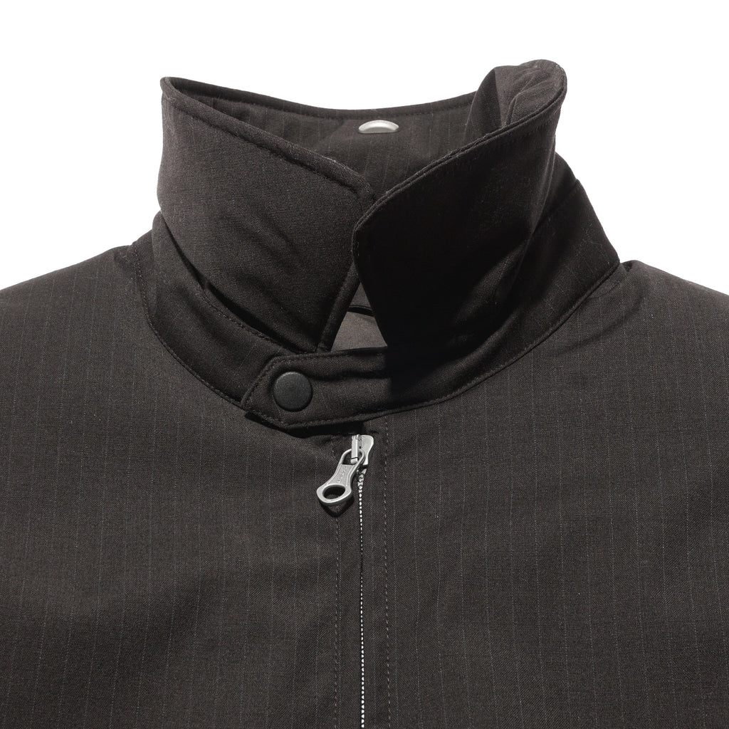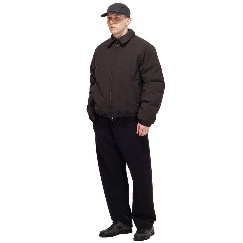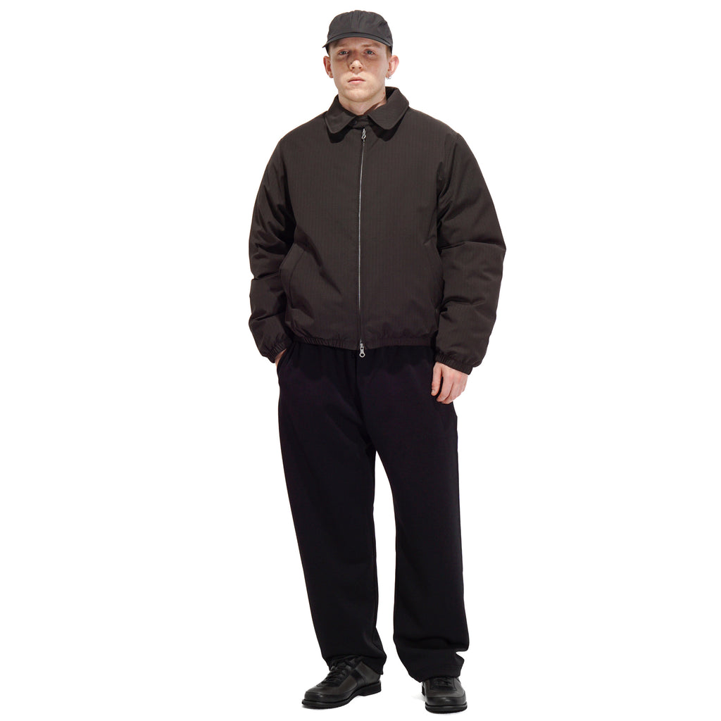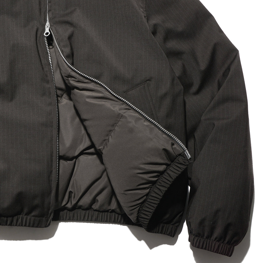 - This innovative garment twists traditional fabric expectations by using a tailoring wool blend with a water repellent membrane on the backside. Produced in Portuguese fabric with a wool blend featuring a water repellent membrane, the jacket has a boxy, wide fit inspired by the Harrington jacket and features duck down and recycled polyester filling, a contrast stripe design, collar tab with snap fastening, two-way zip, elasticated hem and cuffs, two welt pockets with hidden snap closure, and full lining with an inside welt pocket with zip closure.
