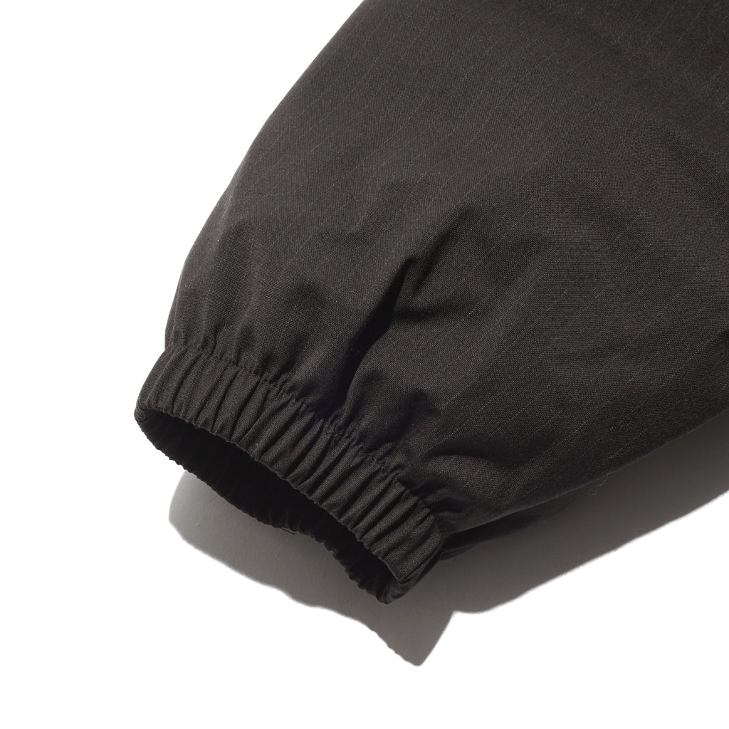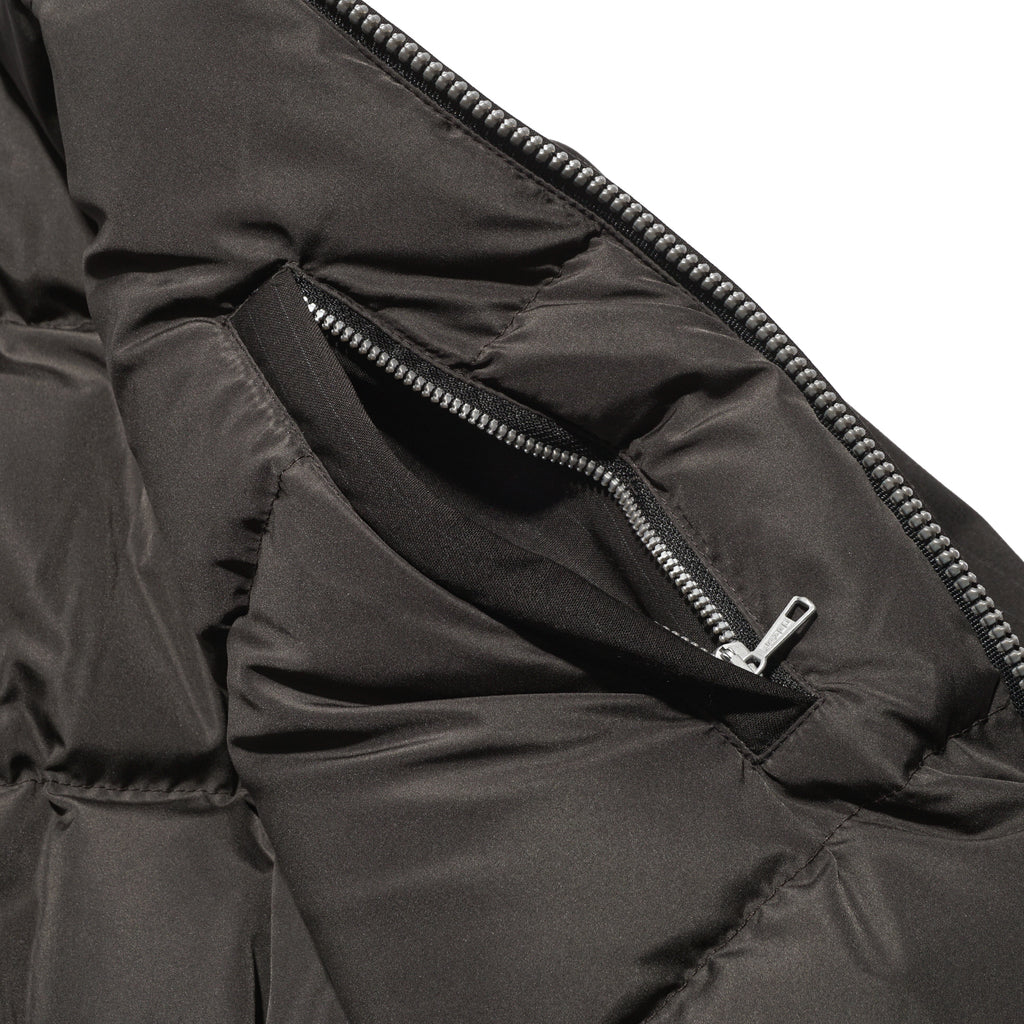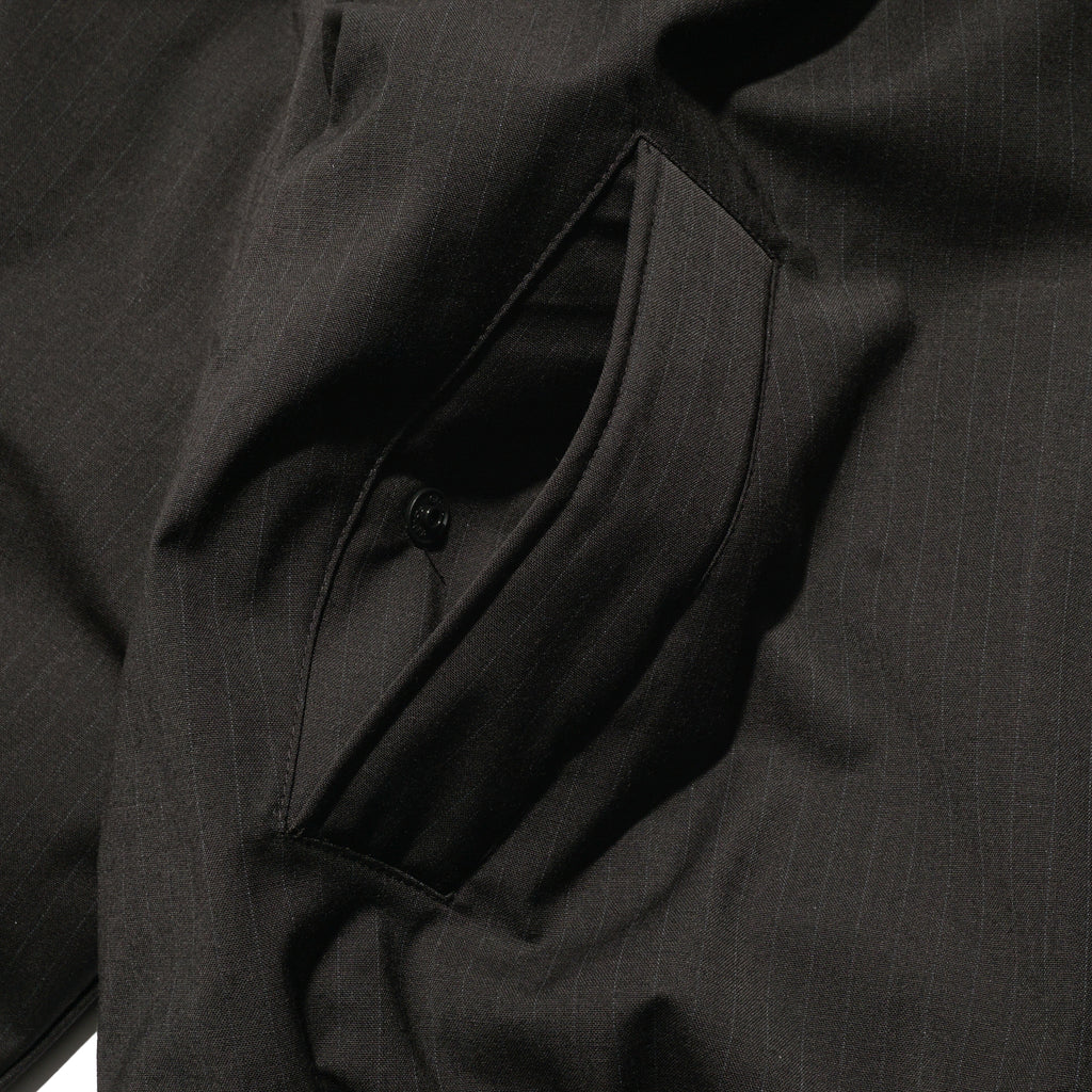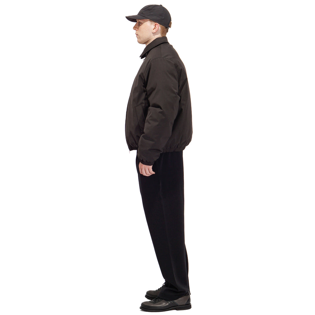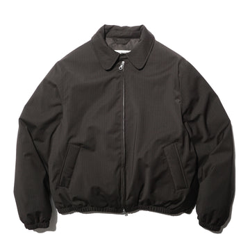 - This innovative garment twists traditional fabric expectations by using a tailoring wool blend with a water repellent membrane on the backside. Produced in Portuguese fabric with a wool blend featuring a water repellent membrane, the jacket has a boxy, wide fit inspired by the Harrington jacket and features duck down and recycled polyester filling, a contrast stripe design, collar tab with snap fastening, two-way zip, elasticated hem and cuffs, two welt pockets with hidden snap closure, and full lining with an inside welt pocket with zip closure.