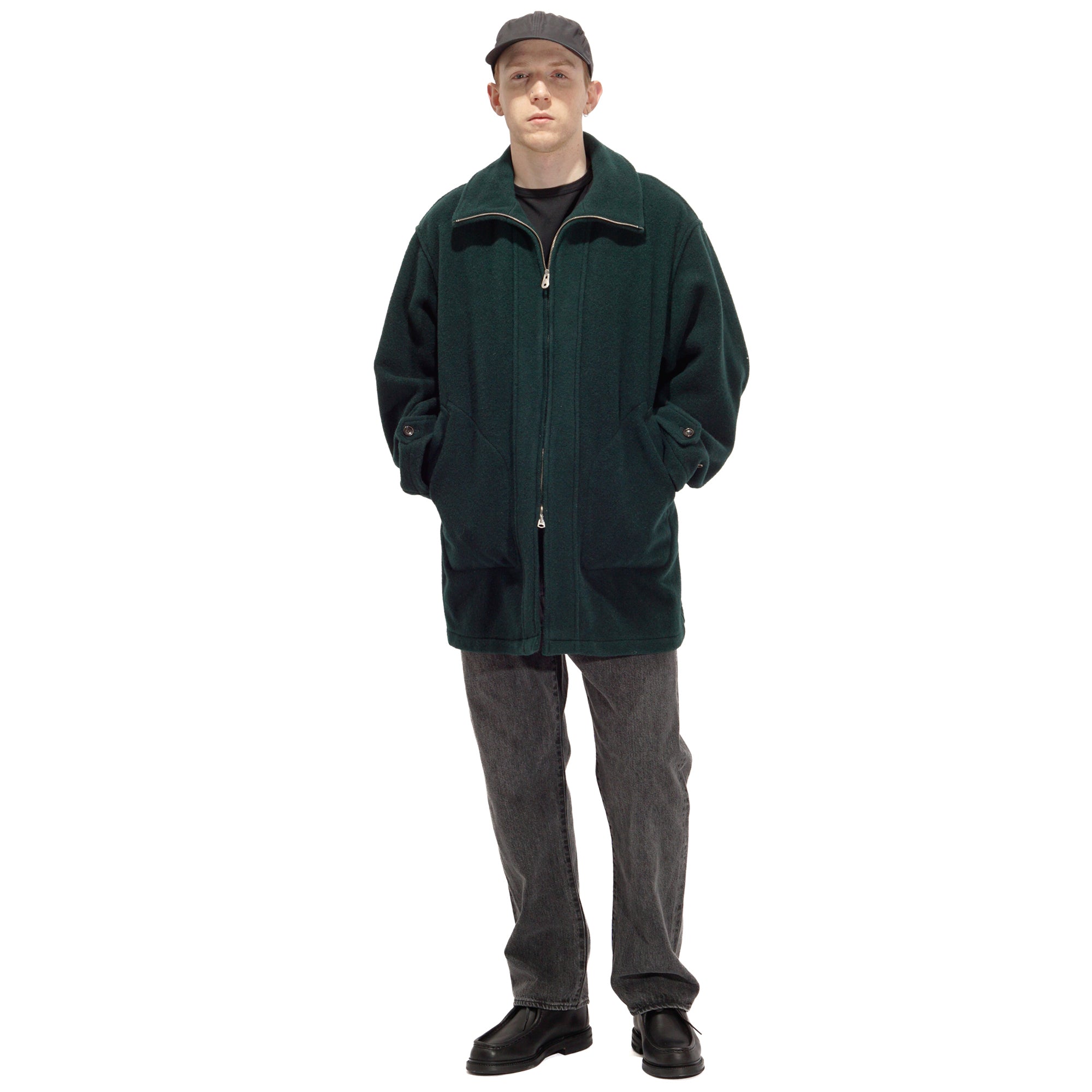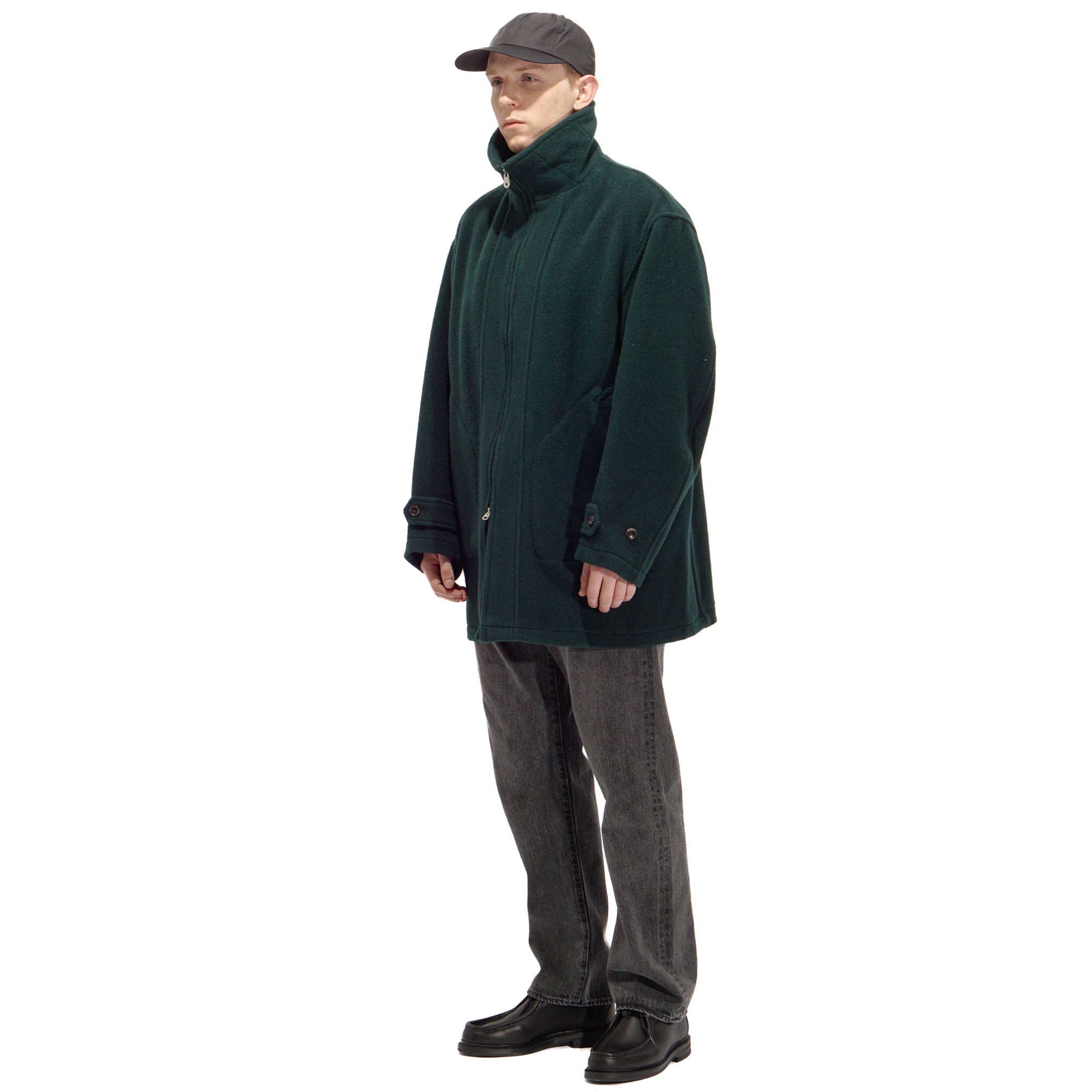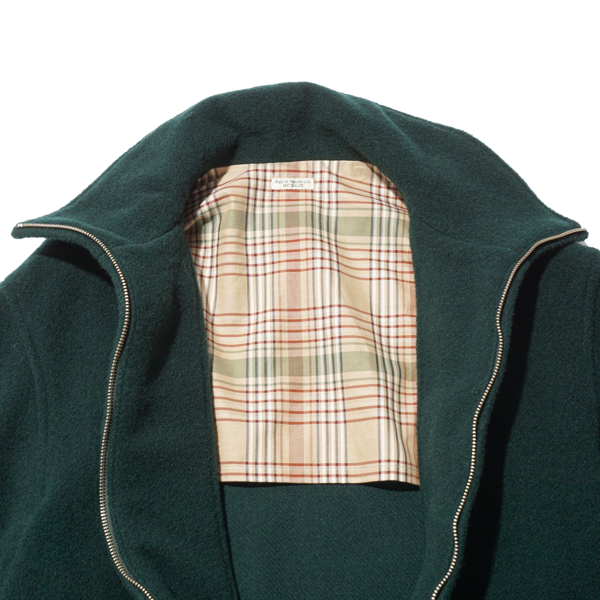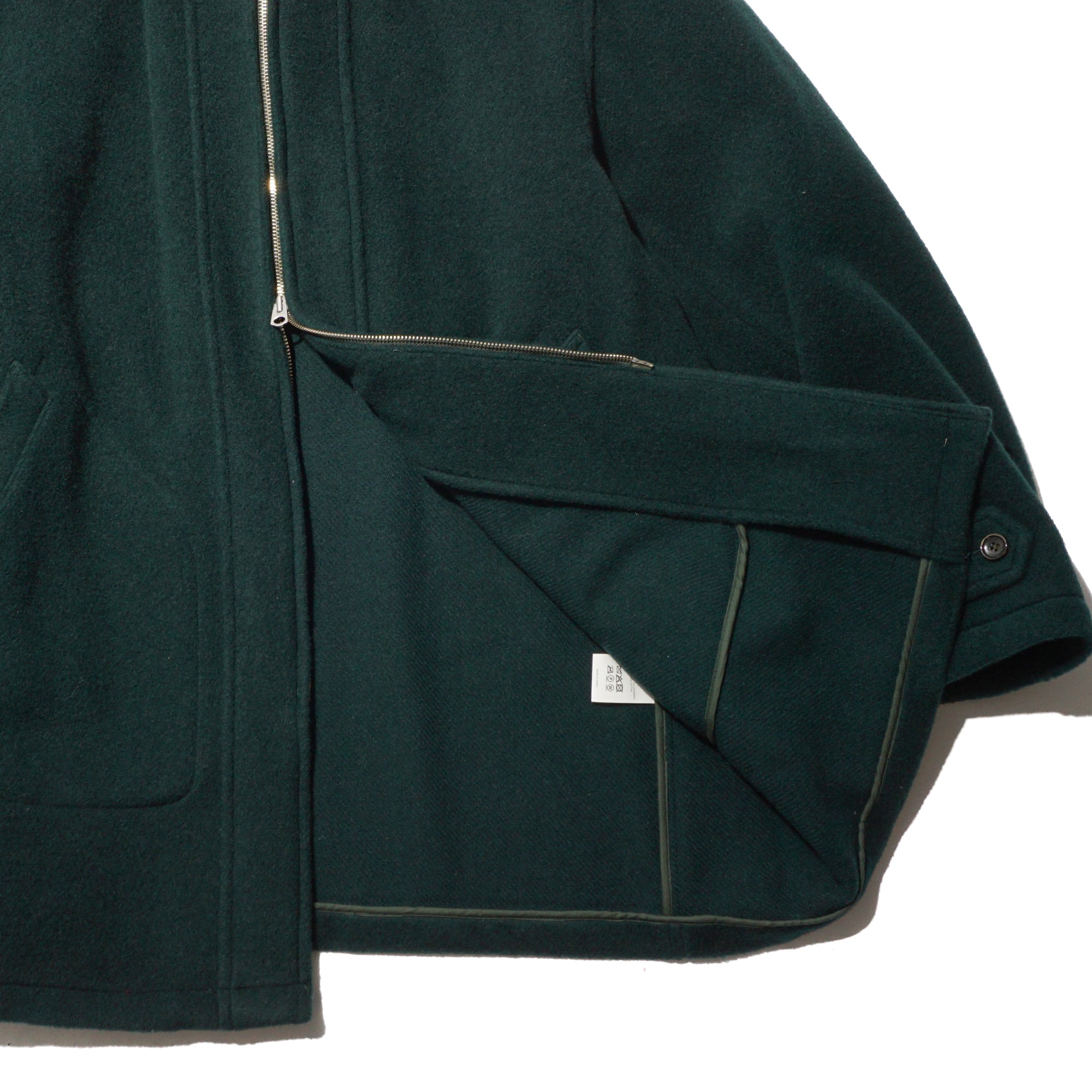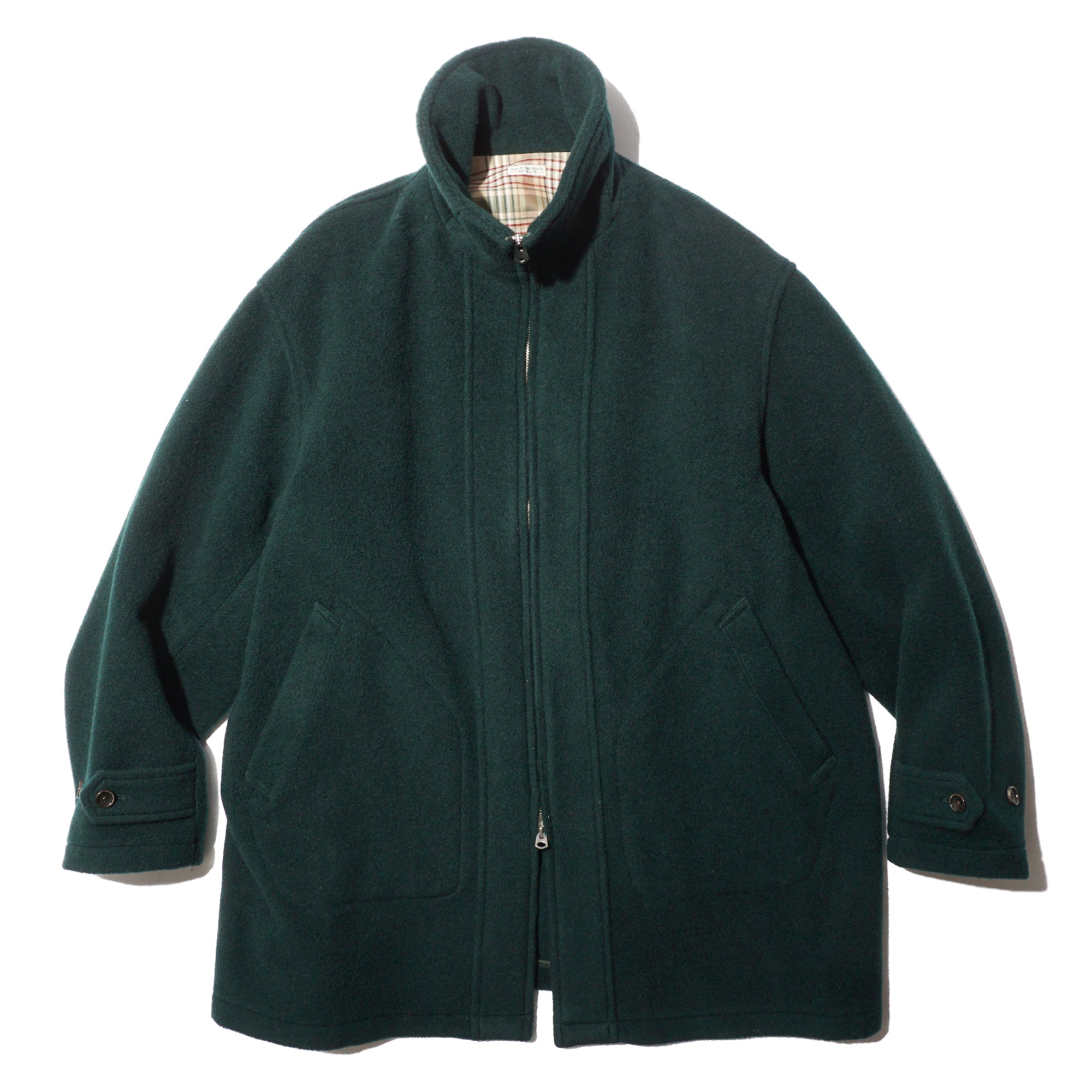 - This is a mid-weight, really comfortable coat that doesn’t feel heavy on your shoulders—the weight drapes nicely toward the bottom. Crafted wool fabric woven from a mix of wool-cashmere and British wool. The Viridian color is great: a green that catches your eye, but still blends with outfits very well. The clean cuts and thoughtful details are also great, like the patch pockets, buttons, cuffs, waist button, and the plaid lining at the shoulders. The Waldes zippers add a subtle vintage touch, and the collar is fantastic—looks sharp both down and up, creating a V-shape around the cheek when fully zipped.