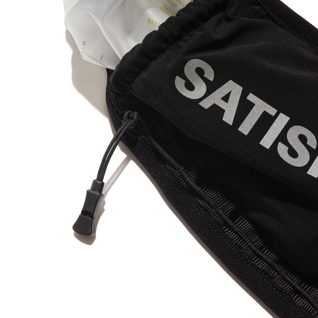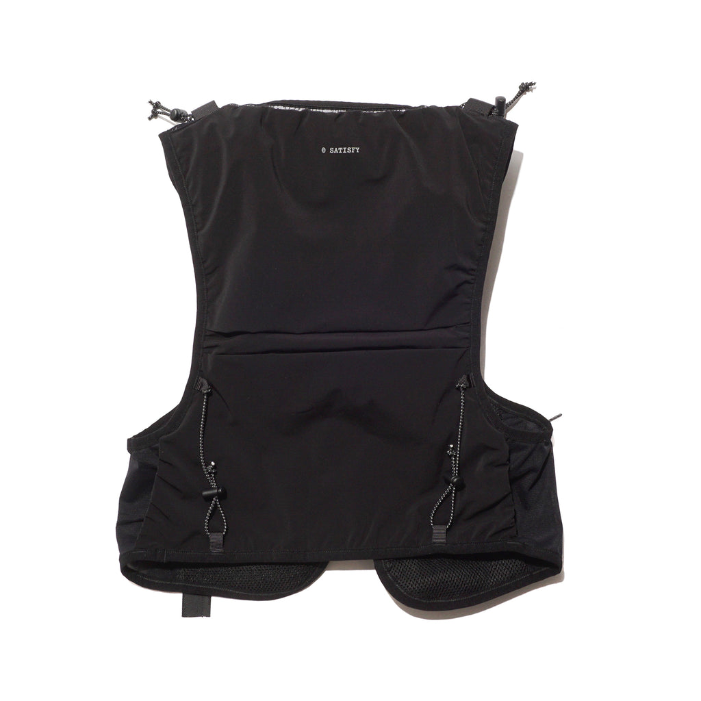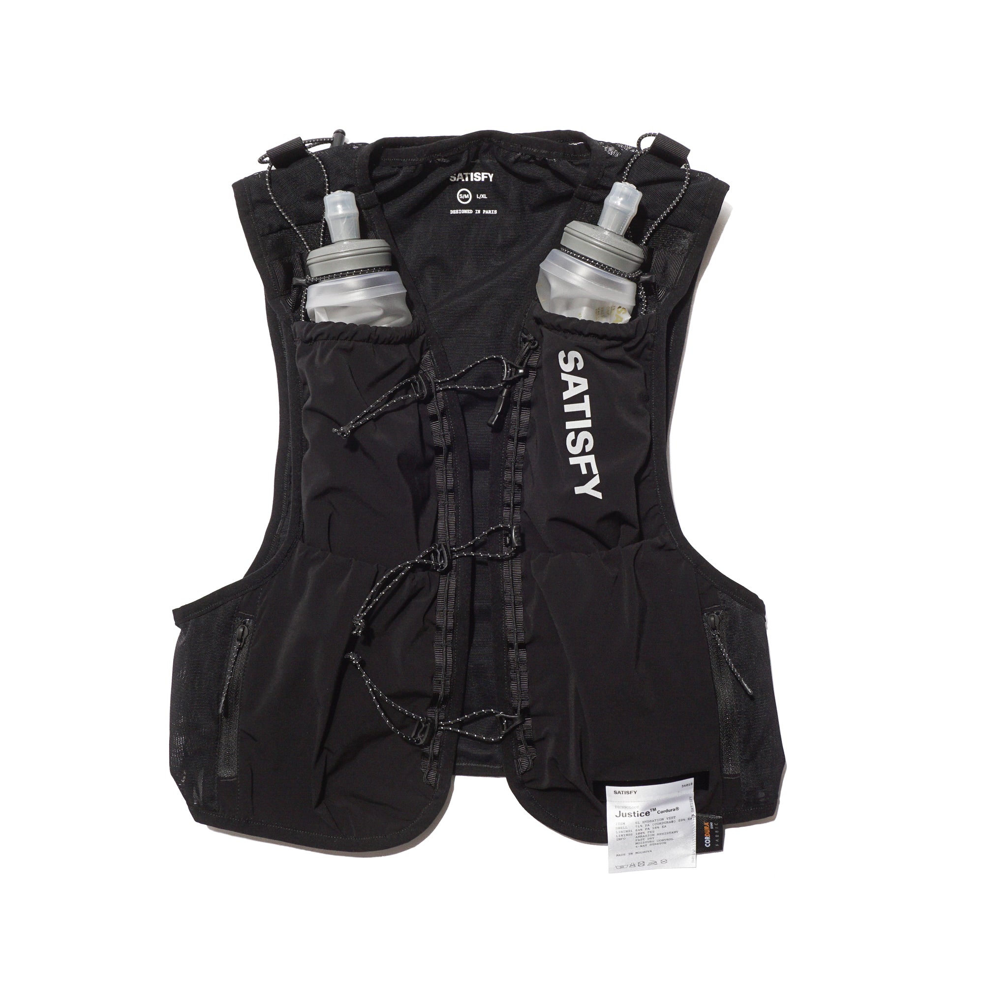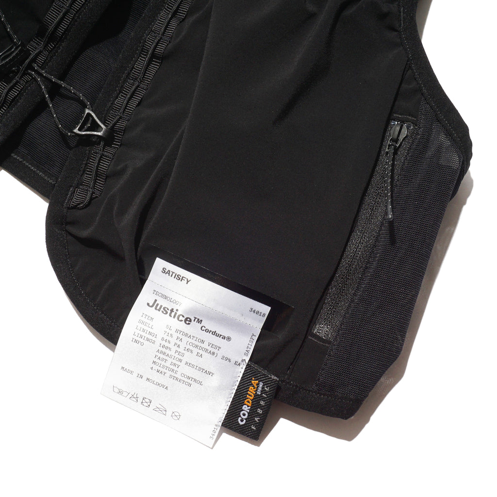 - A 5L hydration vest designed for long-distance missions, engineered for maximum personalization in both function and fit. Constructed from proprietary Justice™ fabric and reinforced with Cordura® for superior comfort, durability, and abrasion resistance. Features an 8-pocket system, including two zippered side pockets, two front pockets for essentials, and dedicated compartments for soft flasks. Includes two SATISFY® 500ml soft flasks co-designed with HydraPak®, secured by a bungee cord system for stability. Additional rear compartments provide extra cargo space, with adjustable cords for fit optimization, pole-carry bungees, and an integrated emergency whistle for safety on the move.