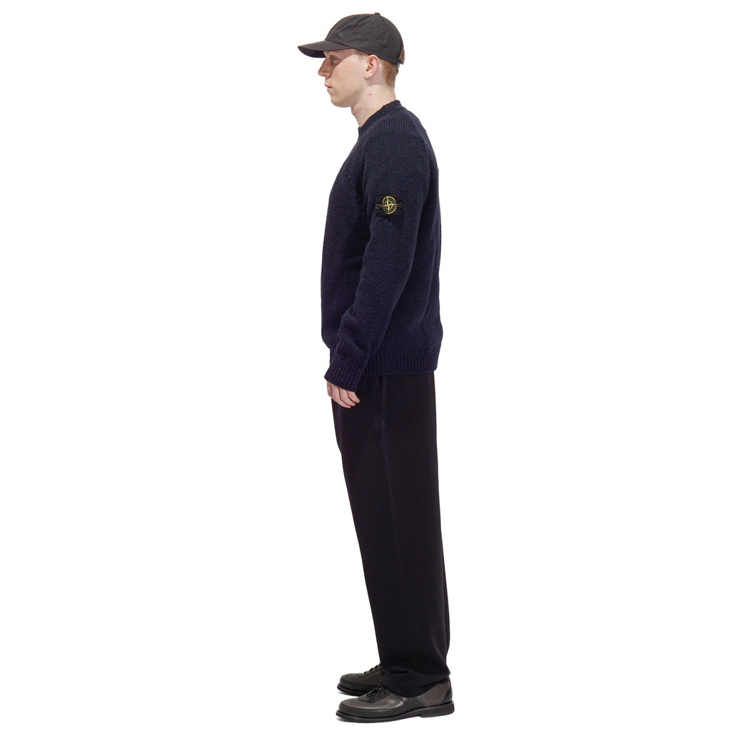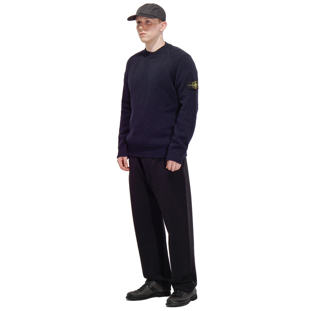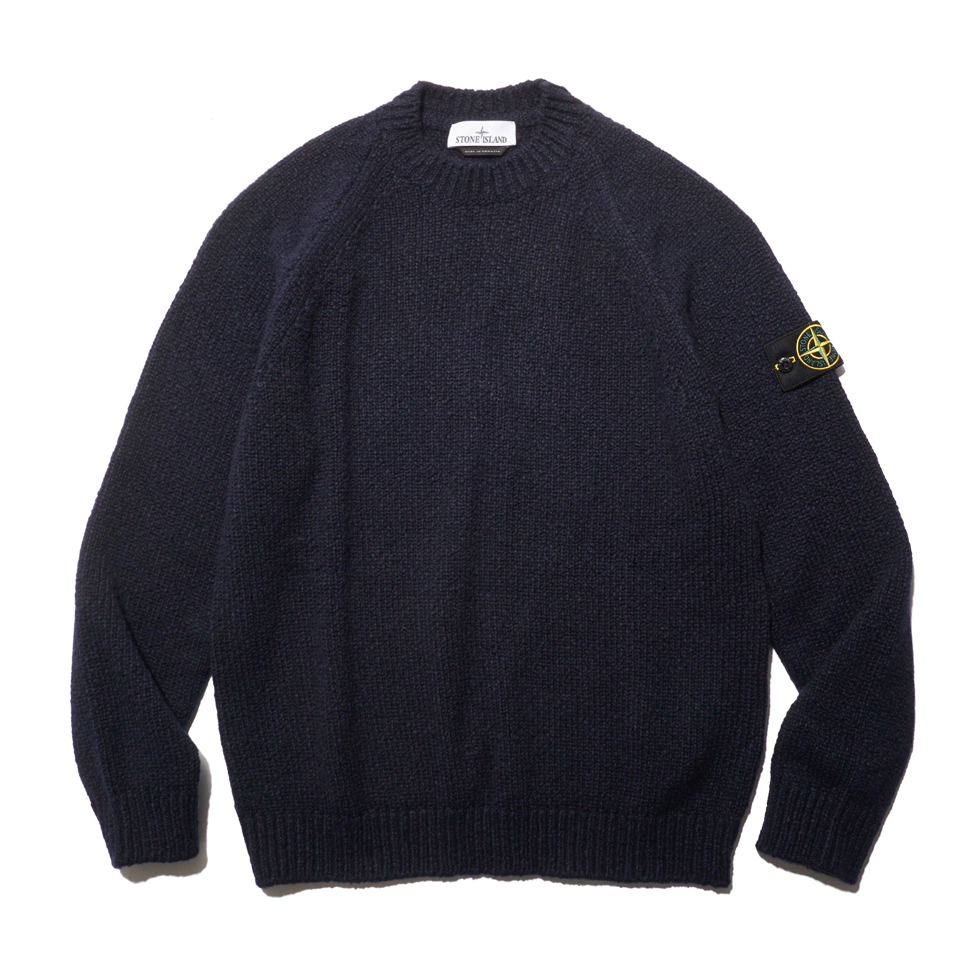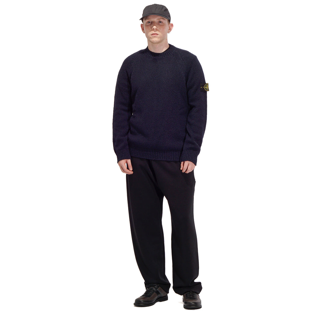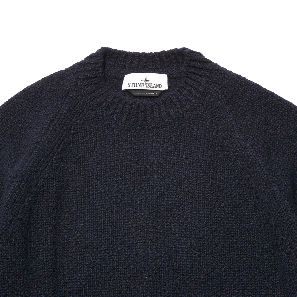- This crewneck sweater is knit in a mouliné blend of wool and nylon, giving it a textured look and soft hand. Crafted in a 3-gauge stockinette stitch, it features a ribbed neckline, raglan sleeves, and ribbed cuffs and hem for a structured finish. The Stone Island badge sits on the left sleeve, adding a signature detail.