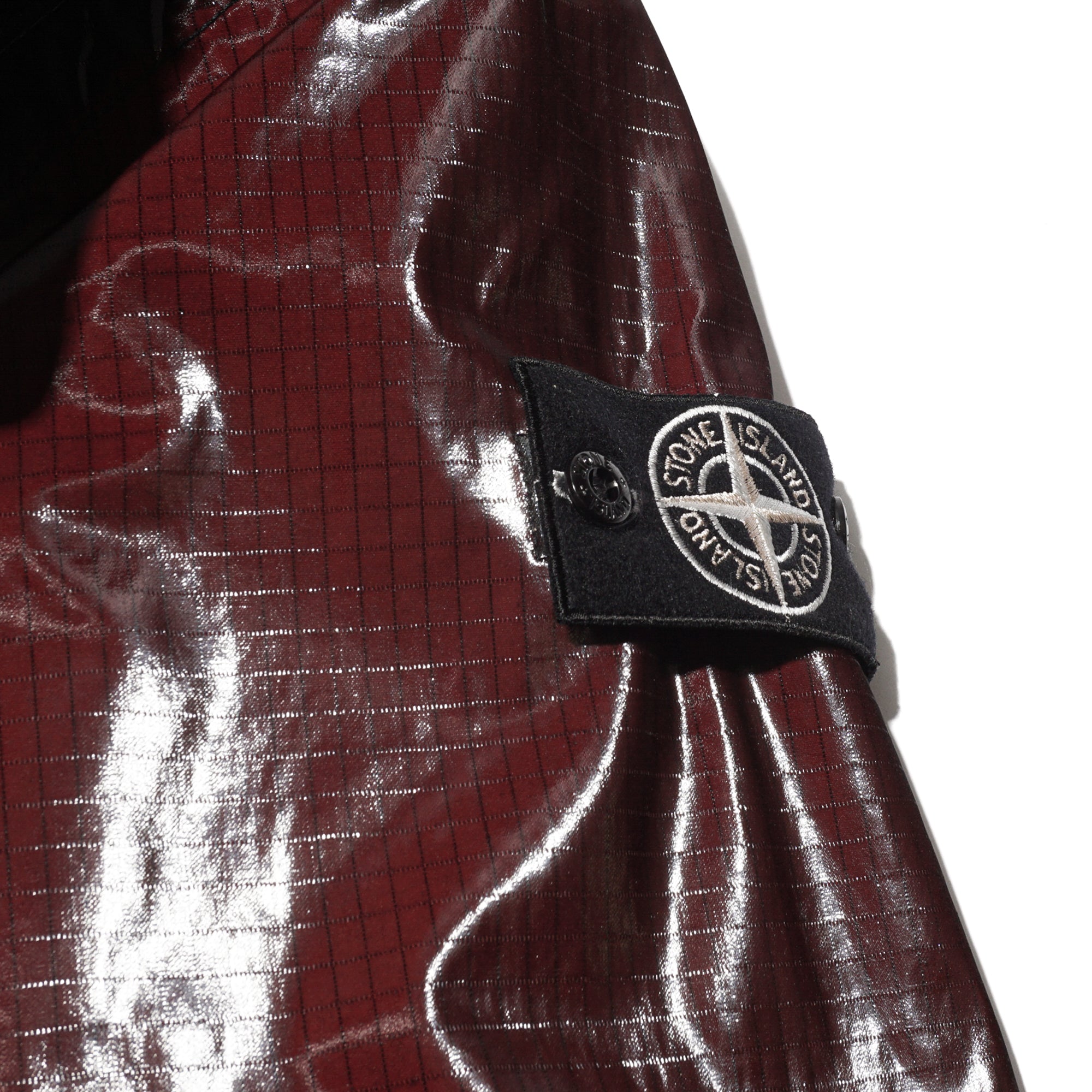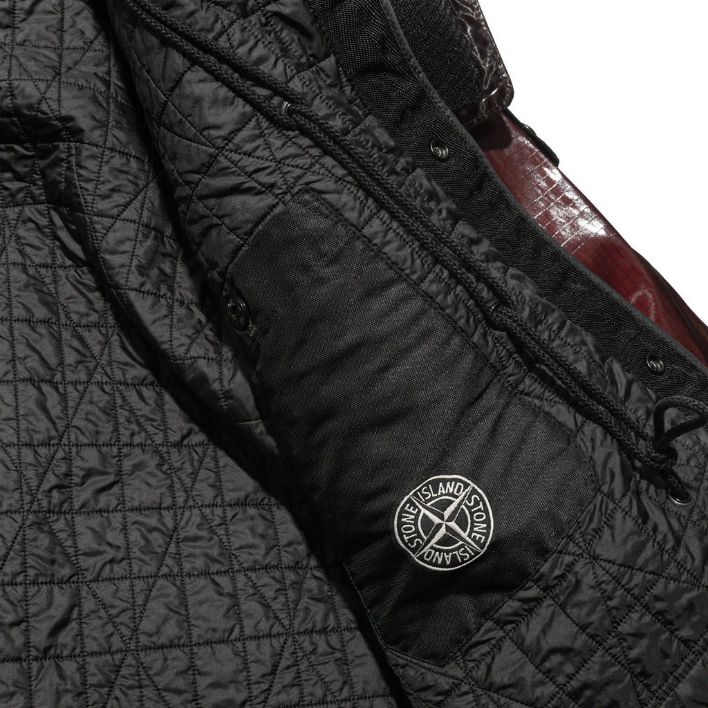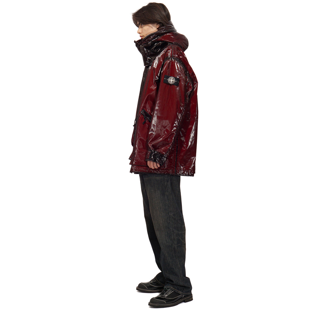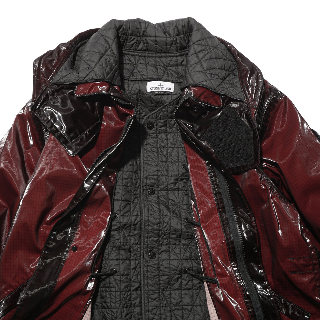 - This hooded parka is crafted from ripstop cotton that has been piece-dyed and laminated with a shiny, fine-grained polyurethane film, creating a prismatic effect. After construction, the garment undergoes a fading process, with the prismatic sections overdyed, while certain areas resist fading to reveal contrasting darker shades. It features a quilted padded lining and a detachable padded hood secured with buttons and a large geometric Velcro chin strap. Functional details include large slanted hand pockets with concealed zippers, additional slanted snap-closure pockets, and a drawstring at the waist that remains visible from the outside. The cuffs are finished with tightening straps and button fastenings, while a two-way zipper lies beneath a concealed snap placket. The iconic Stone Island badge accents the left sleeve. Inside, the quilted lining is designed with a V-neckline, an internal buttoned pocket with Compass embroidery, and snap fastening; it can be attached to the outer garment using a tie system inspired by sailing equipment.