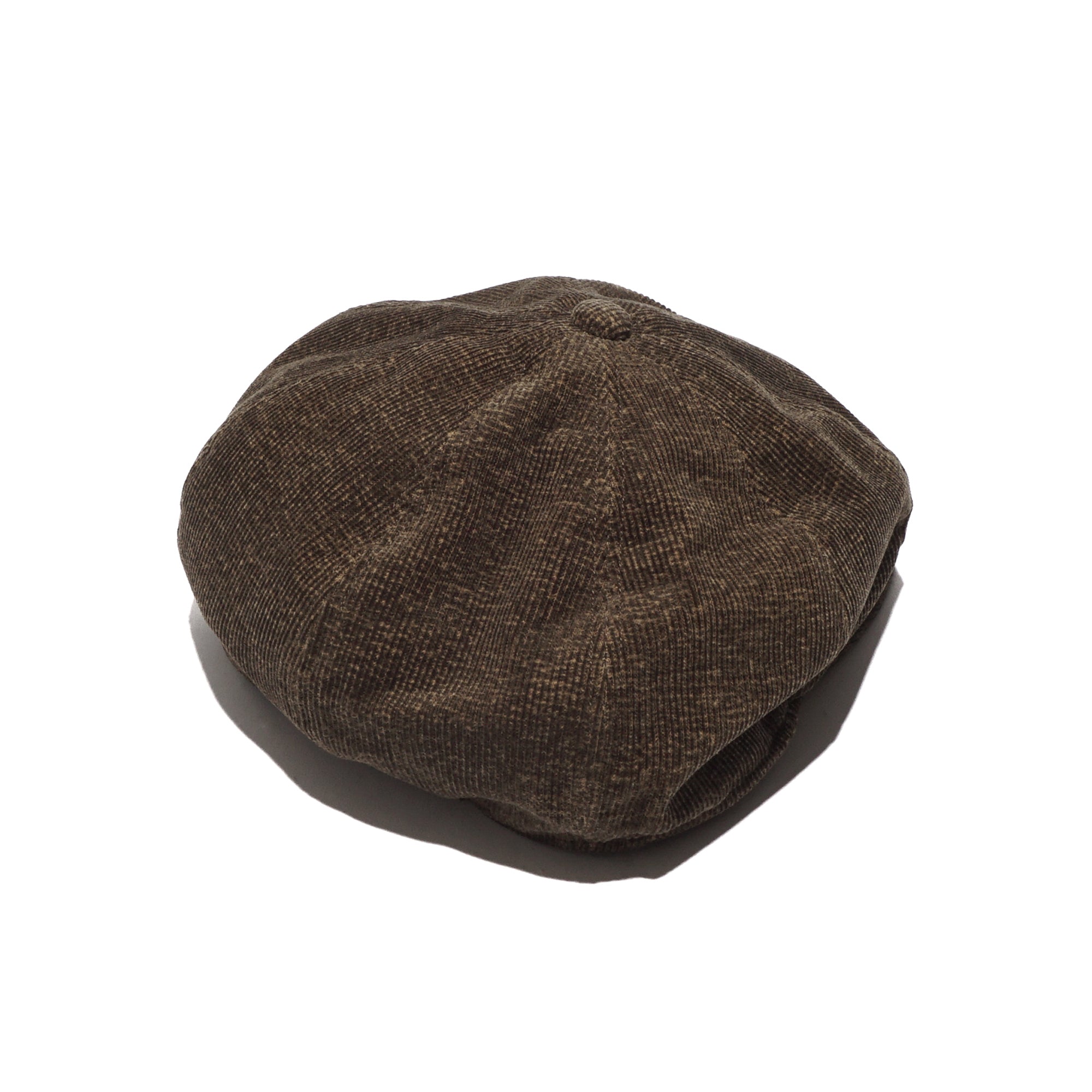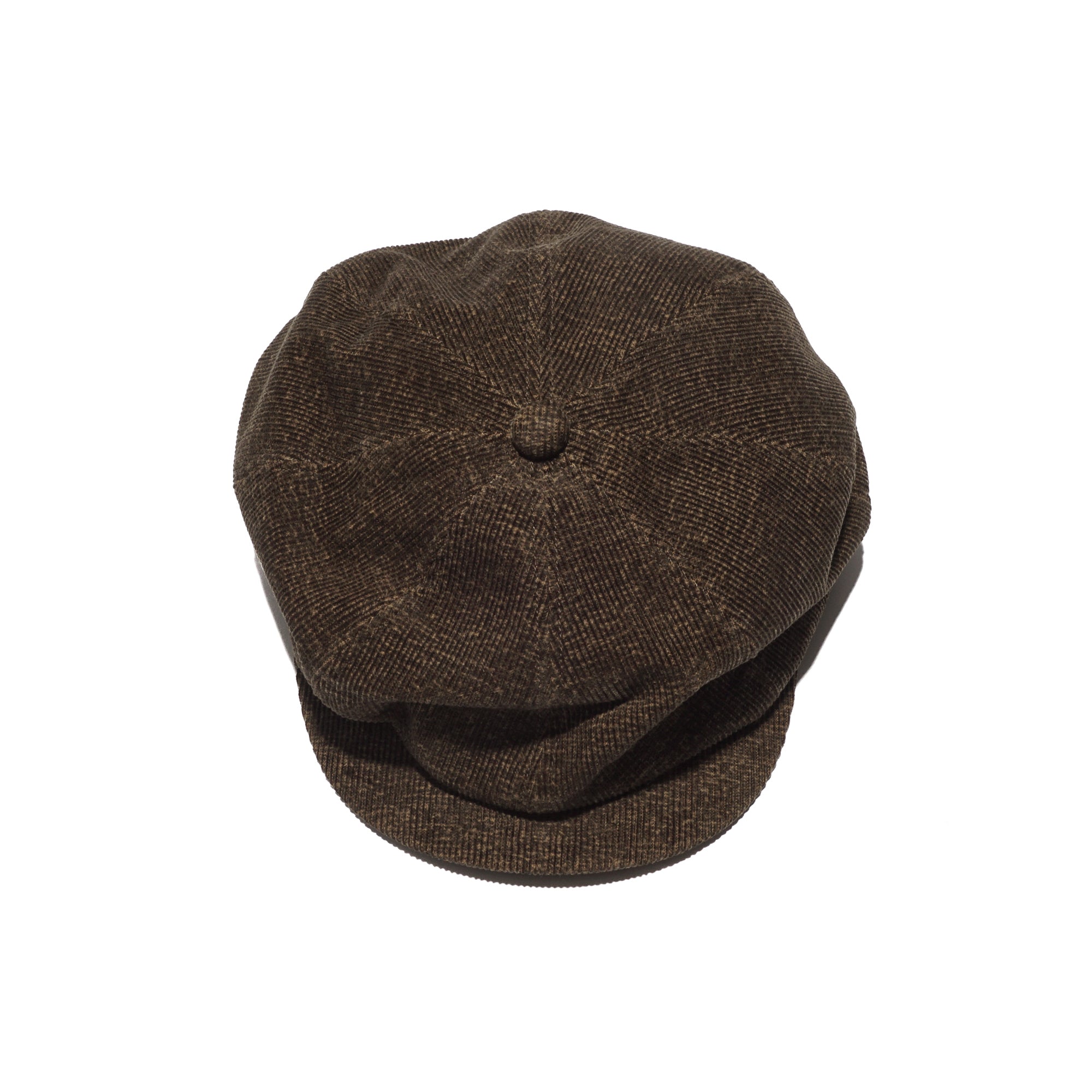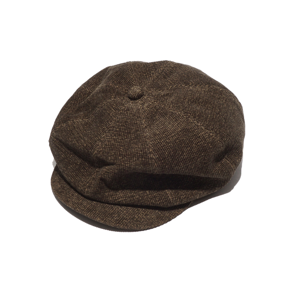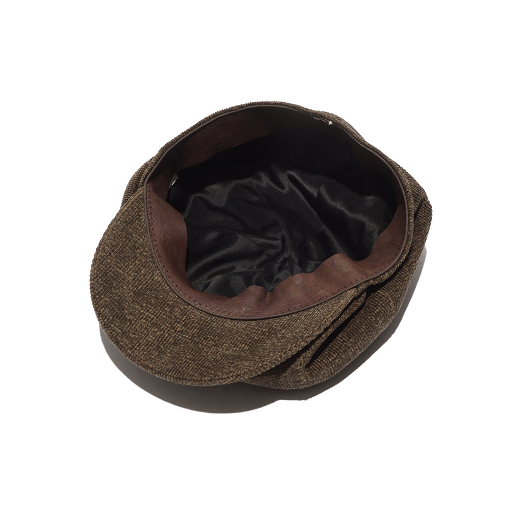 - This cap recreates an early 1900s newsboy cap found in a New Jersey antique dealer’s warehouse, with a refined silhouette inspired by the original. While often linked to newspaper boys, the “flat cap with a visor” was worn widely across the working class. It’s made from “TWEEDUROY,” a corduroy printed with a tweed pattern, revived from a 1930s sports jacket in Takahashi’s collection. Developed by the Hockmeyer Company in Massachusetts, the fabric was prized for its wool-like look and superior durability.