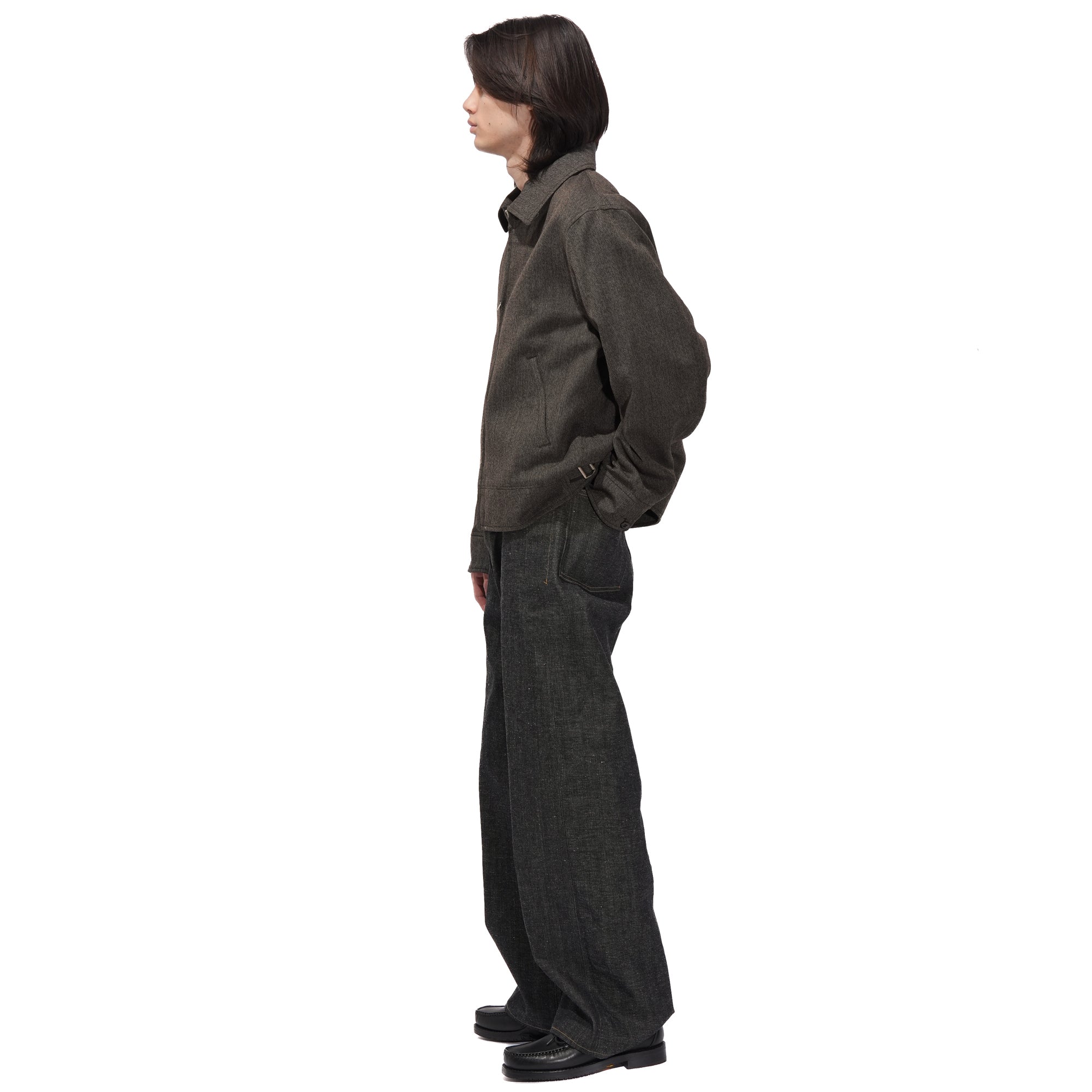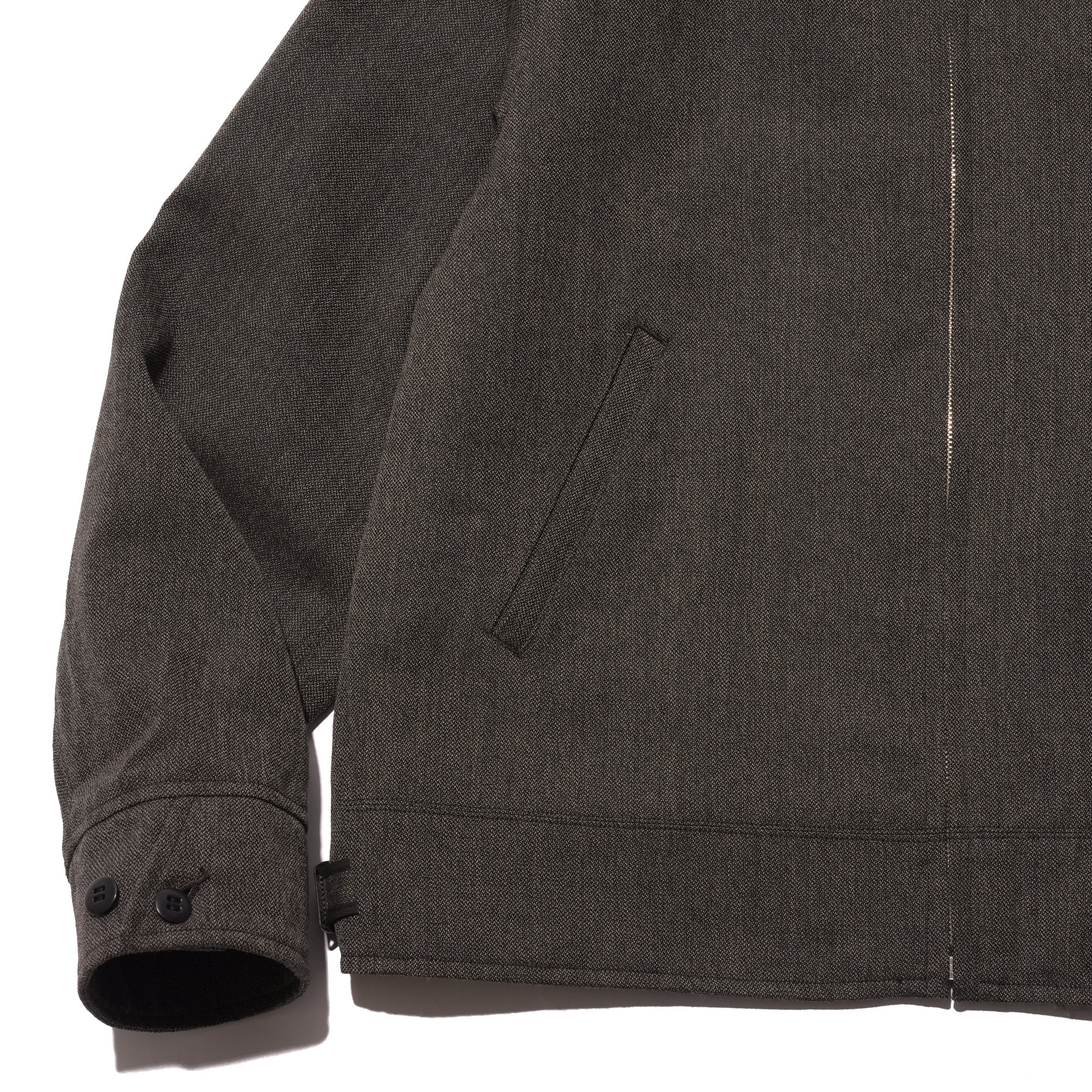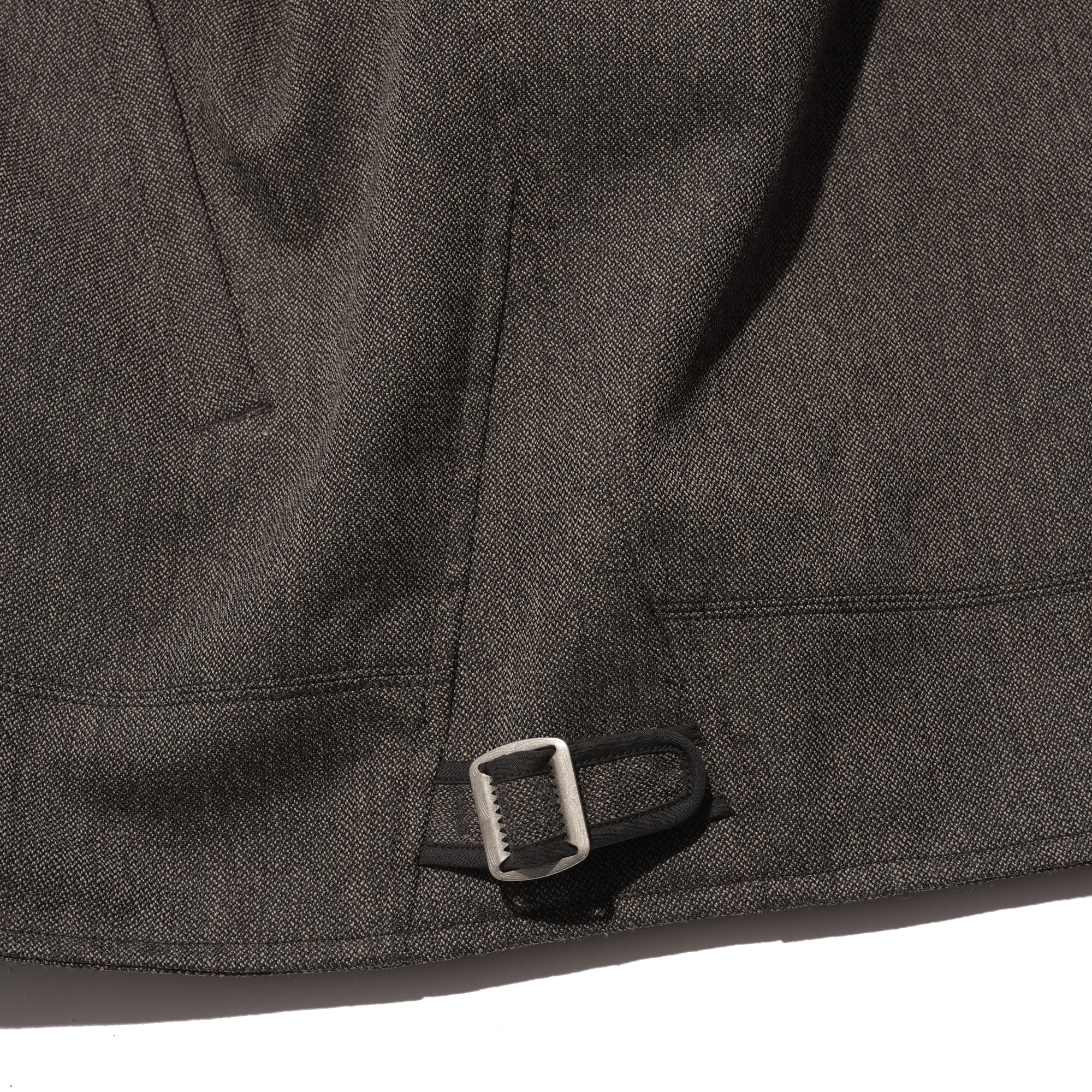 - This design is based on a wool Cossack jacket from the 1930s, featuring forward-set armholes, sculpted sleeves rotated to the front, and a straight collar, all carefully restructured for a modern fit. The fabric is a tweed spun from long-staple wool with natural elasticity, sourced from sheep raised in arid, demanding climates, resulting in a classic, soft hand with a refined surface texture that combines visual depth with comfortable, durable wear. The jacket is finished with a rayon–cotton jacquard lining and a buckle with subtle engraved detailing.