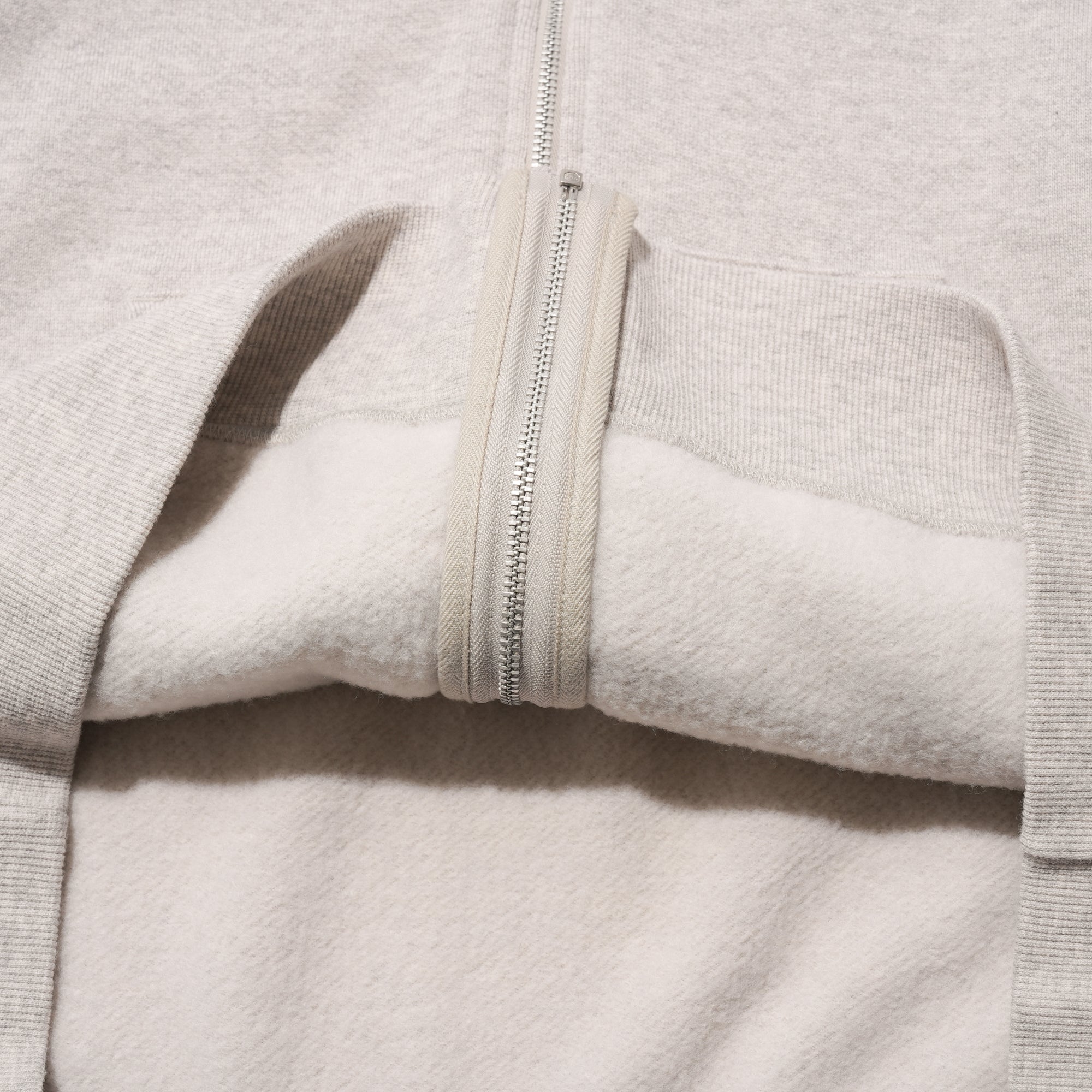 - Crafted from a wool–cotton blend, providing natural warmth, breathability, and all-season comfort. The fabric is airy with a slight cushioning, creating a cozy yet lightweight feel that retains its shape for long-lasting wear. Featuring a jumbo short-body silhouette, zipper closure, and a one-wash finish, this sweatshirt is washable and low-maintenance.