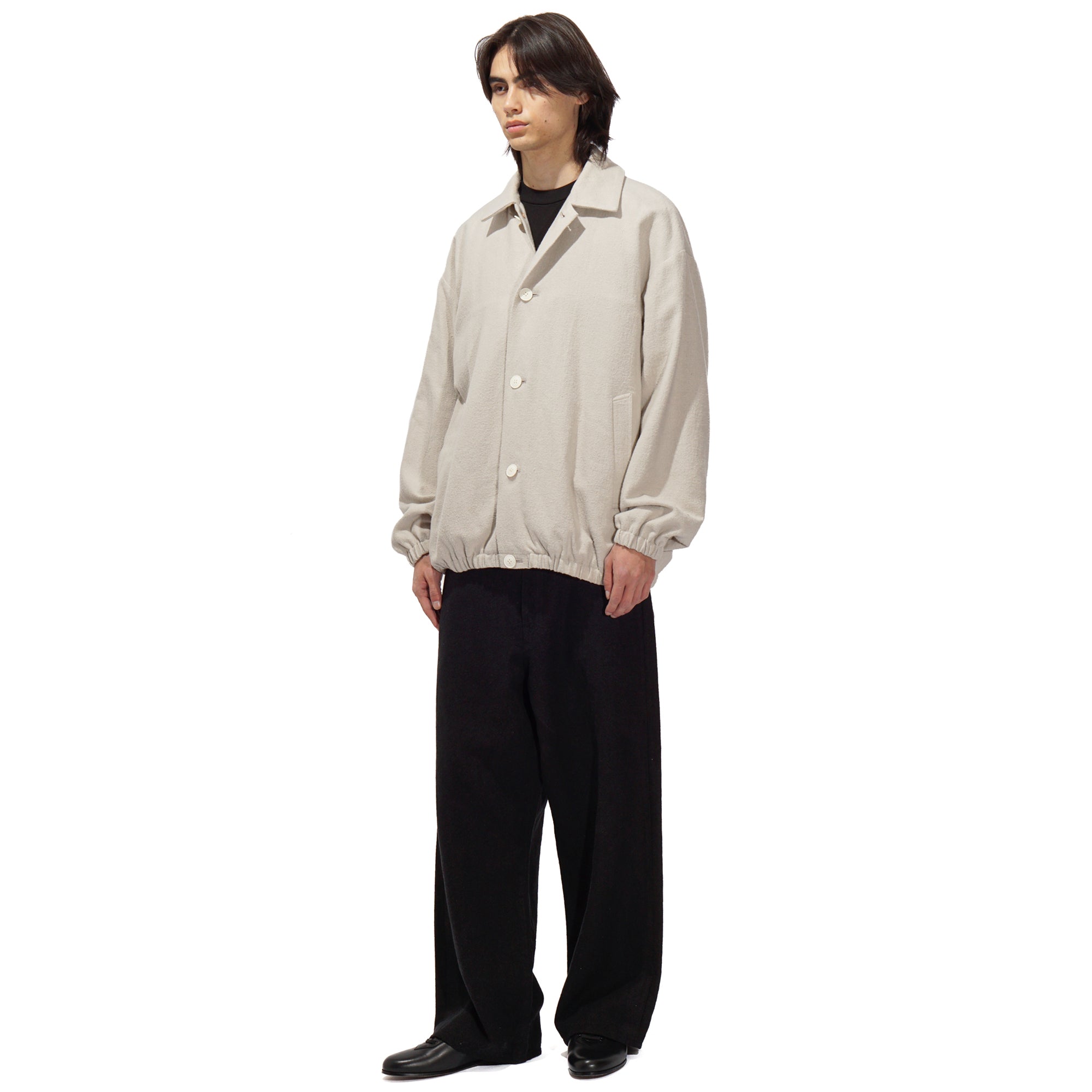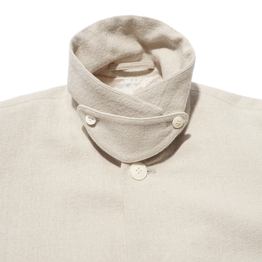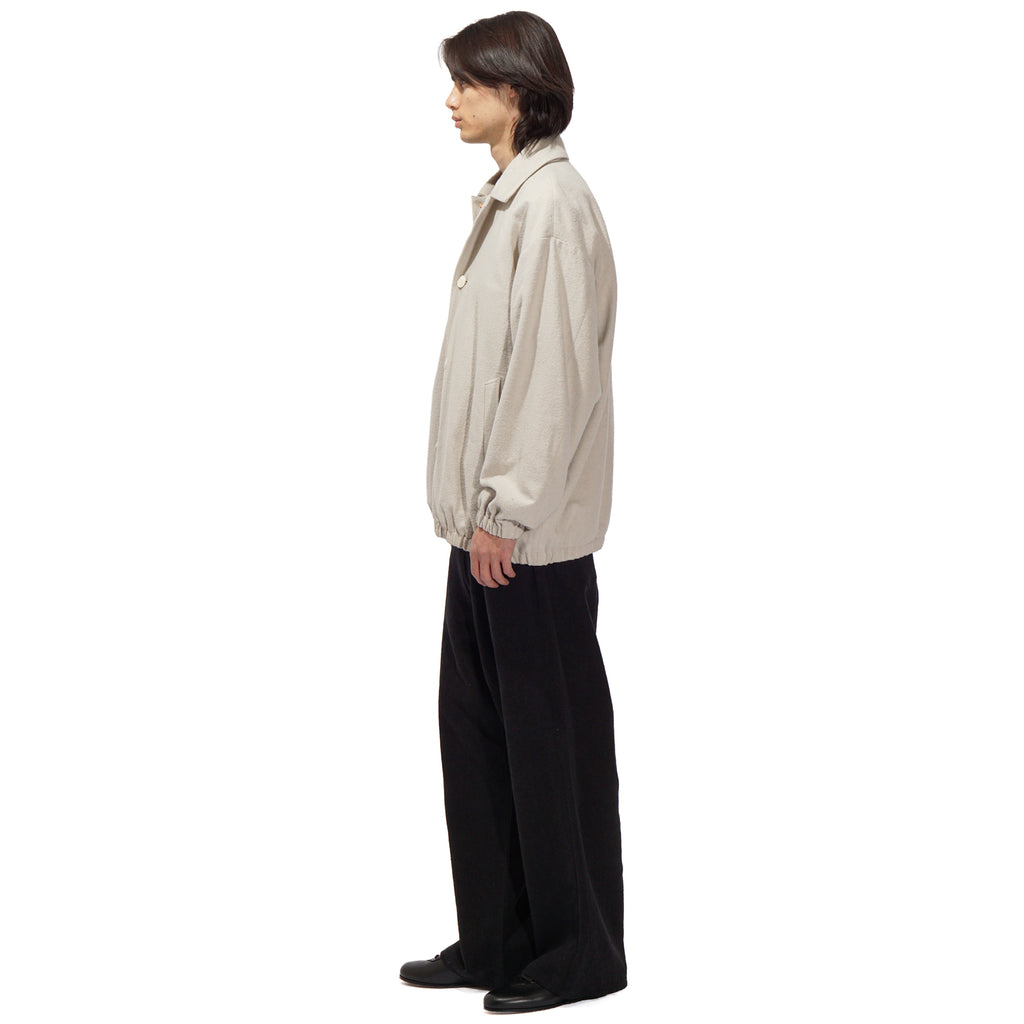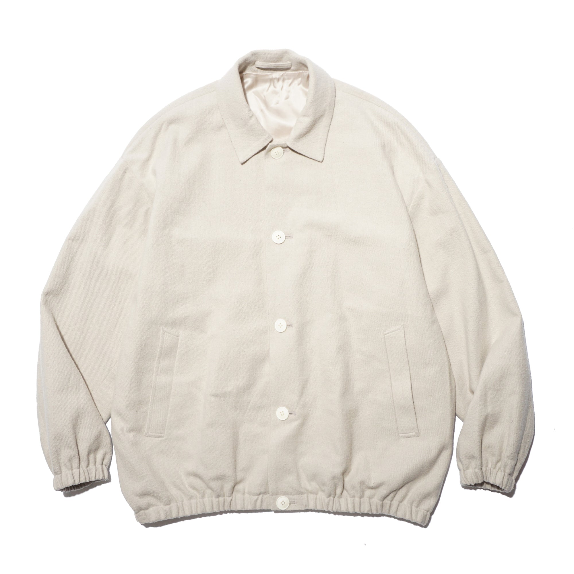 - A front-button blouson jacket inspired by classic military wear. While it carries the rugged aesthetic of military garments, it features a lightweight, soft feel that can be worn as easily as a cardigan. The collar can also be worn standing for added style. Made of made of 52% cotton and 48% silk, combines the best qualities of both fibers, offering a balance of comfort, elegance, and performance. The cotton provides breathability, softness, and durability, while the silk adds a smooth hand, subtle natural sheen, and graceful drape. This blend creates a lightweight, refined fabric that is comfortable against the skin, moves beautifully, and works well across seasons.