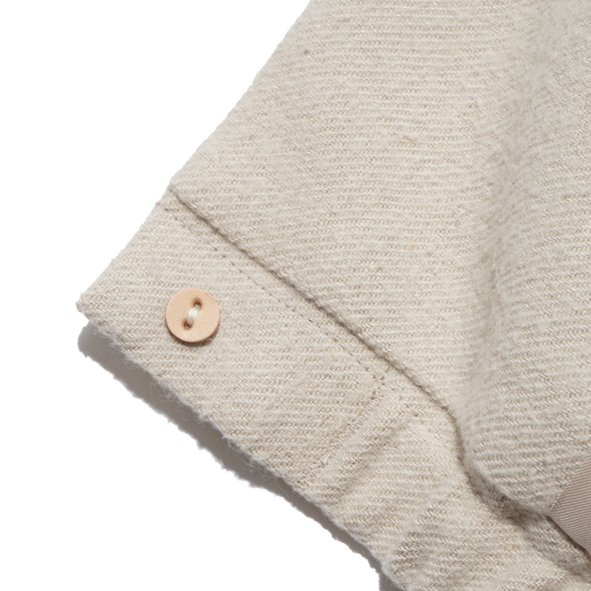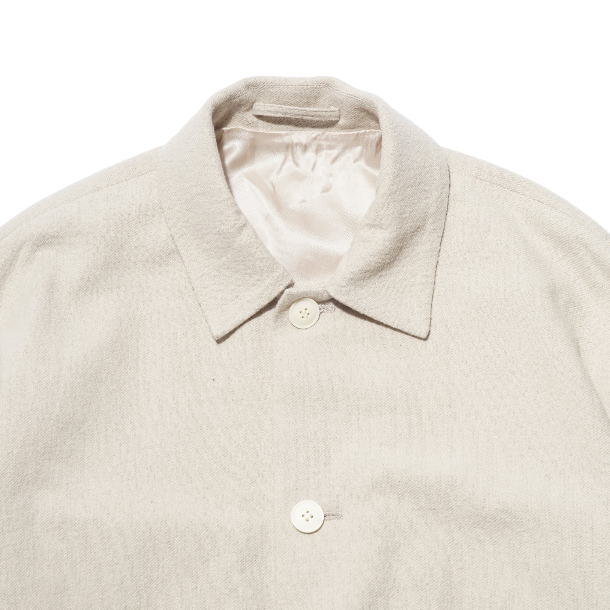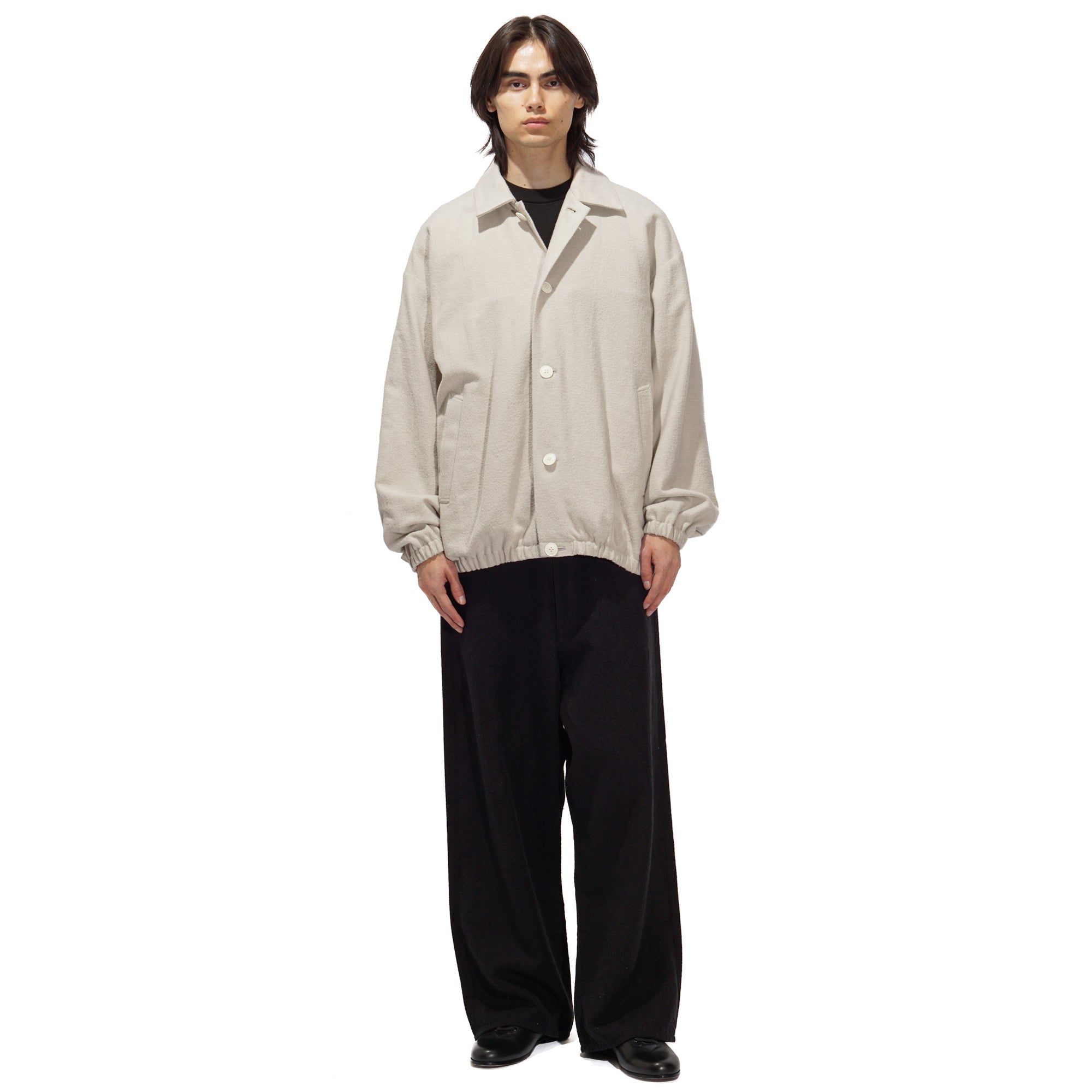 - A front-button blouson jacket inspired by classic military wear. While it carries the rugged aesthetic of military garments, it features a lightweight, soft feel that can be worn as easily as a cardigan. The collar can also be worn standing for added style. Made of made of 52% cotton and 48% silk, combines the best qualities of both fibers, offering a balance of comfort, elegance, and performance. The cotton provides breathability, softness, and durability, while the silk adds a smooth hand, subtle natural sheen, and graceful drape. This blend creates a lightweight, refined fabric that is comfortable against the skin, moves beautifully, and works well across seasons.