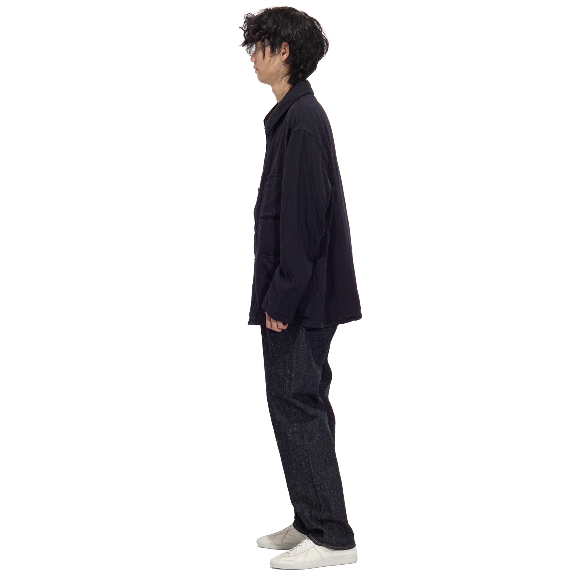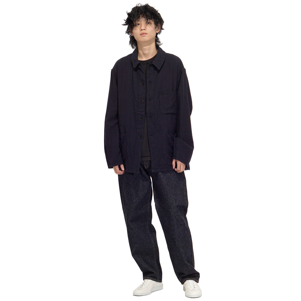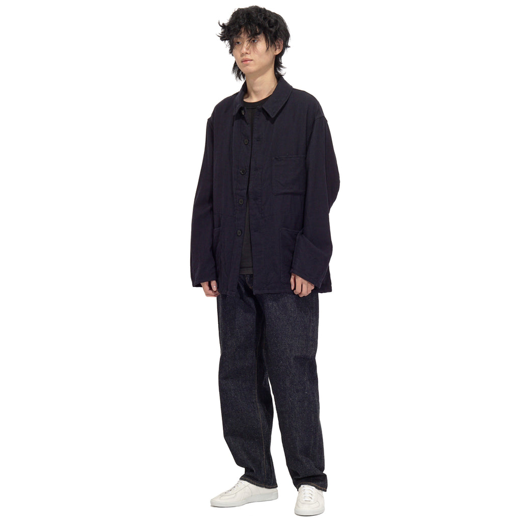 - Crafted from high-quality Sanforaquin cotton, this fabric is nep and dyed with pure indigo, intricately woven on an old-fashioned loom to achieve an uneven texture. The design includes a relaxed fit, an inverted leather patch, a zipper fly, five pockets, and a deep indigo hue, treated with a single wash to prevent further shrinkage while allowing for gradual fading over time.