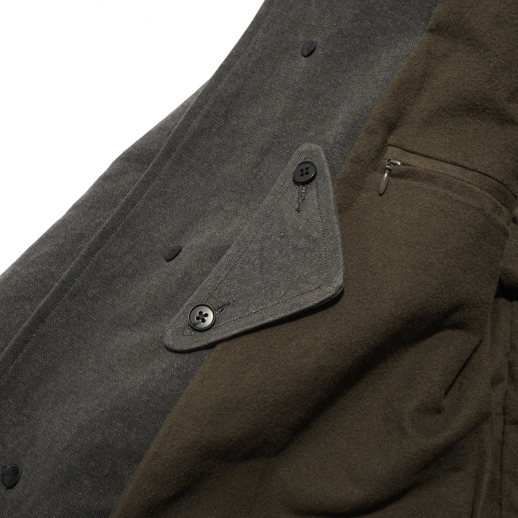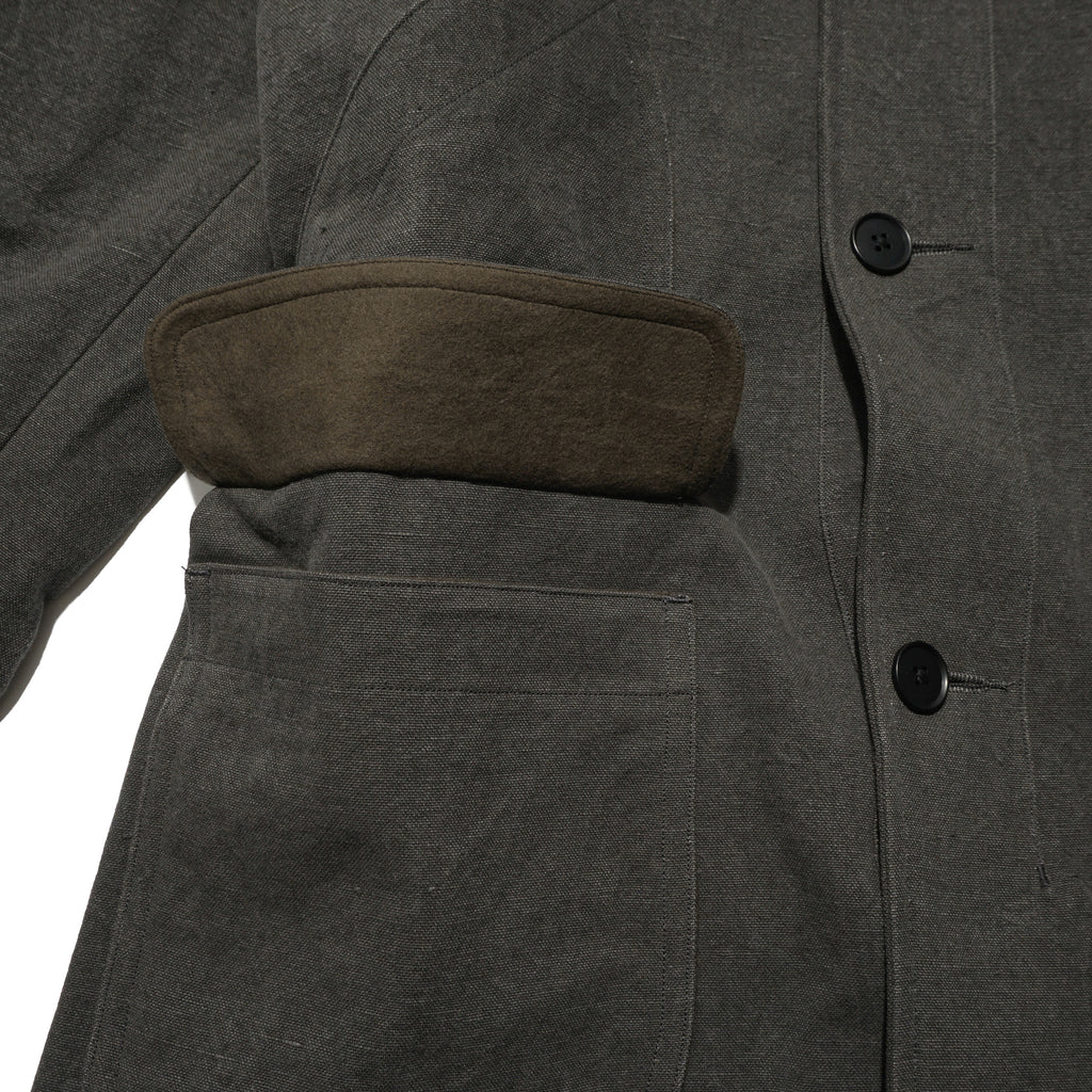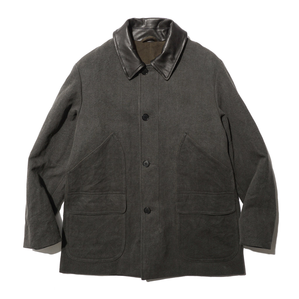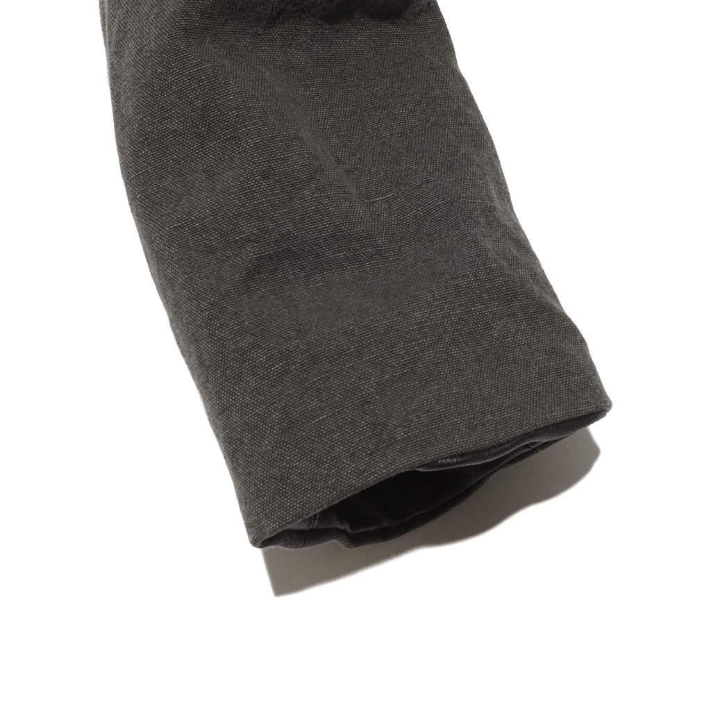- Woven in a heavy Oxford using cotton warp and thick hemp weft yarns for a dense, durable fabric. Dyed with traditional Japanese pigments—sumi ink and persimmon tannin—and repeatedly washed without tension to create natural softness and volume. Features a sheep leather collar and back cuffs, hunting-style patch pockets and brushed cotton fleece lining.