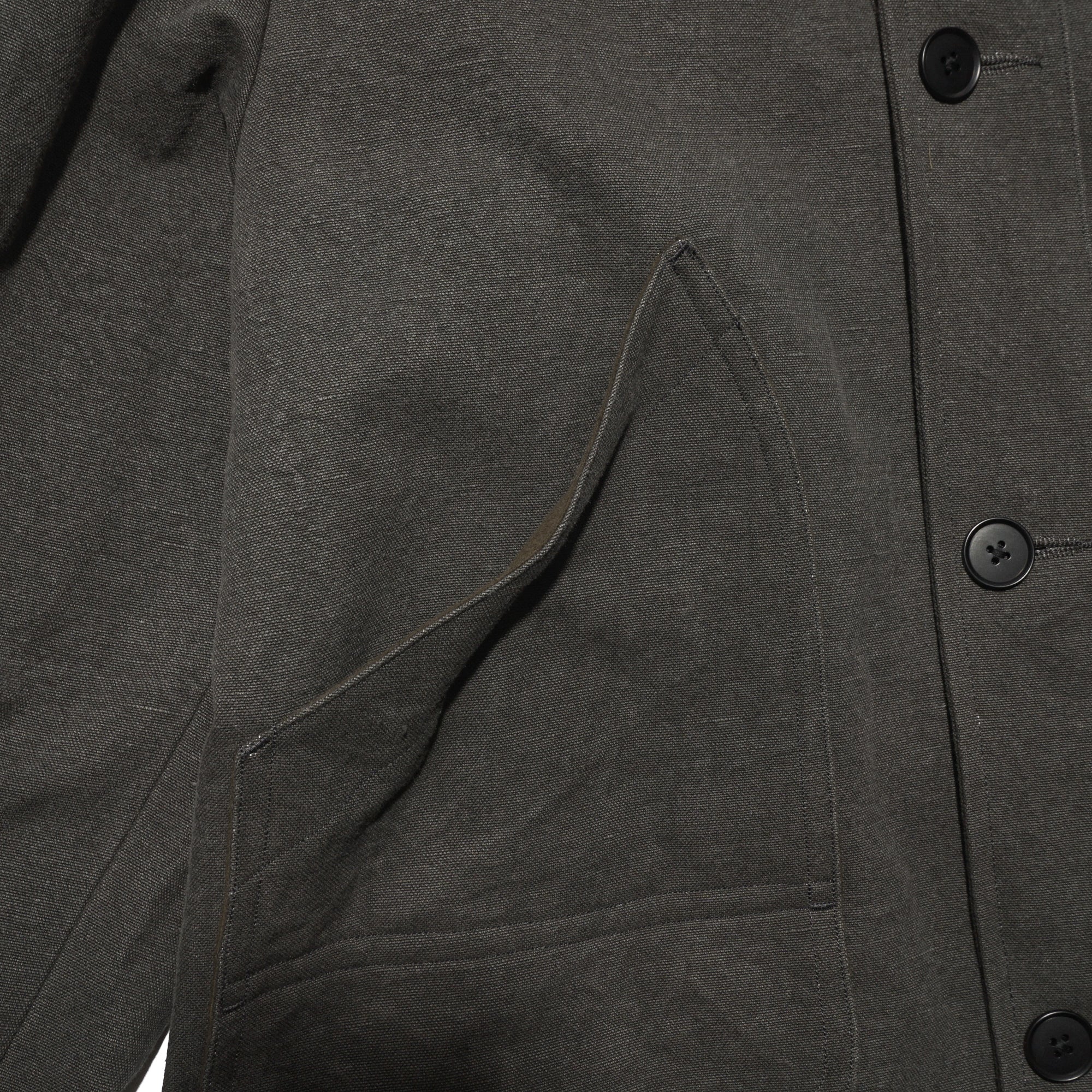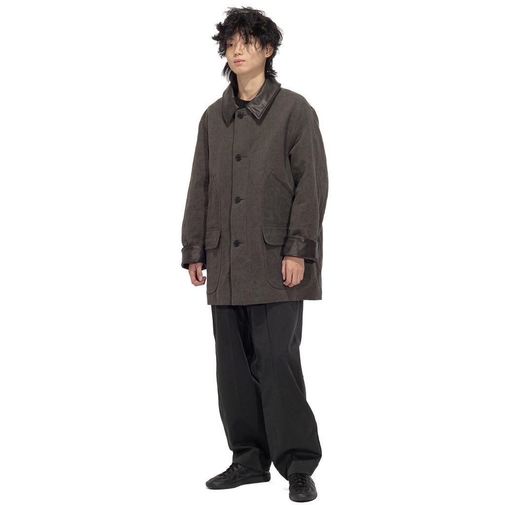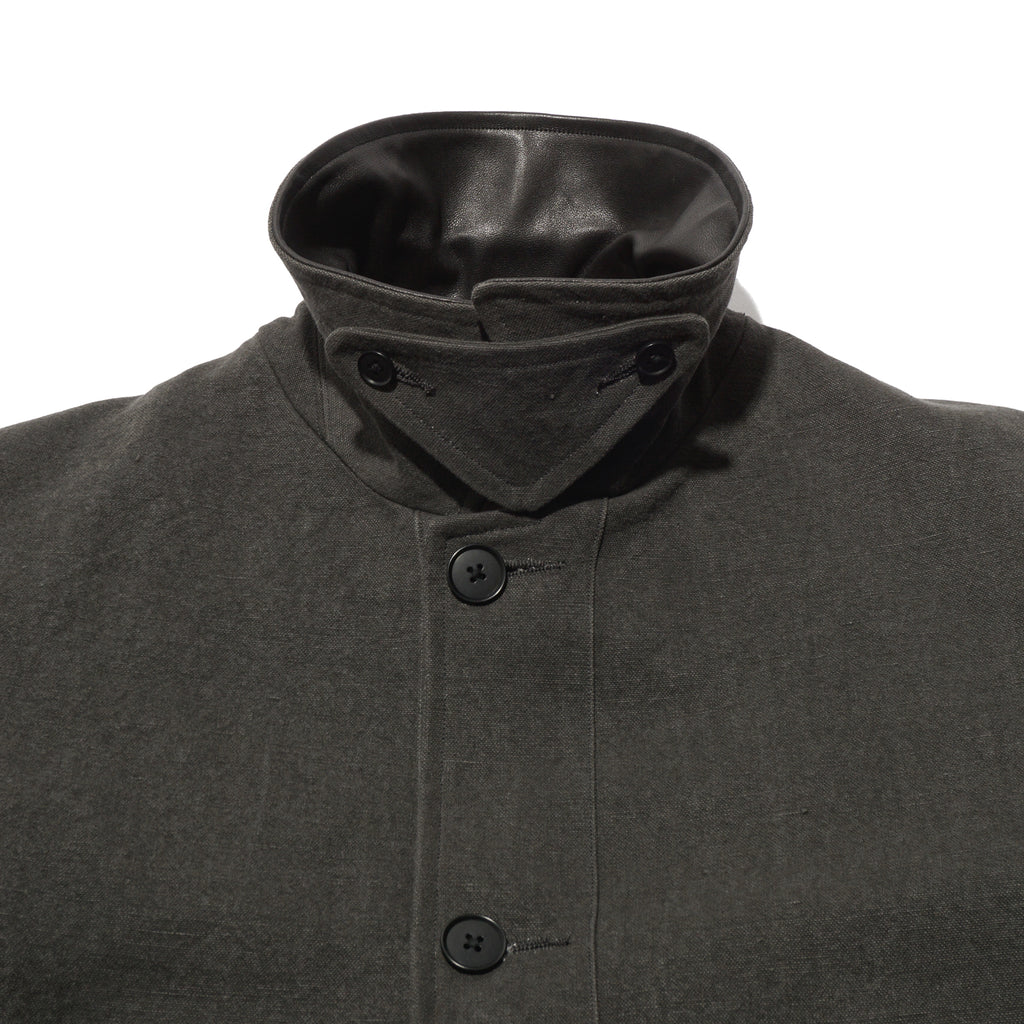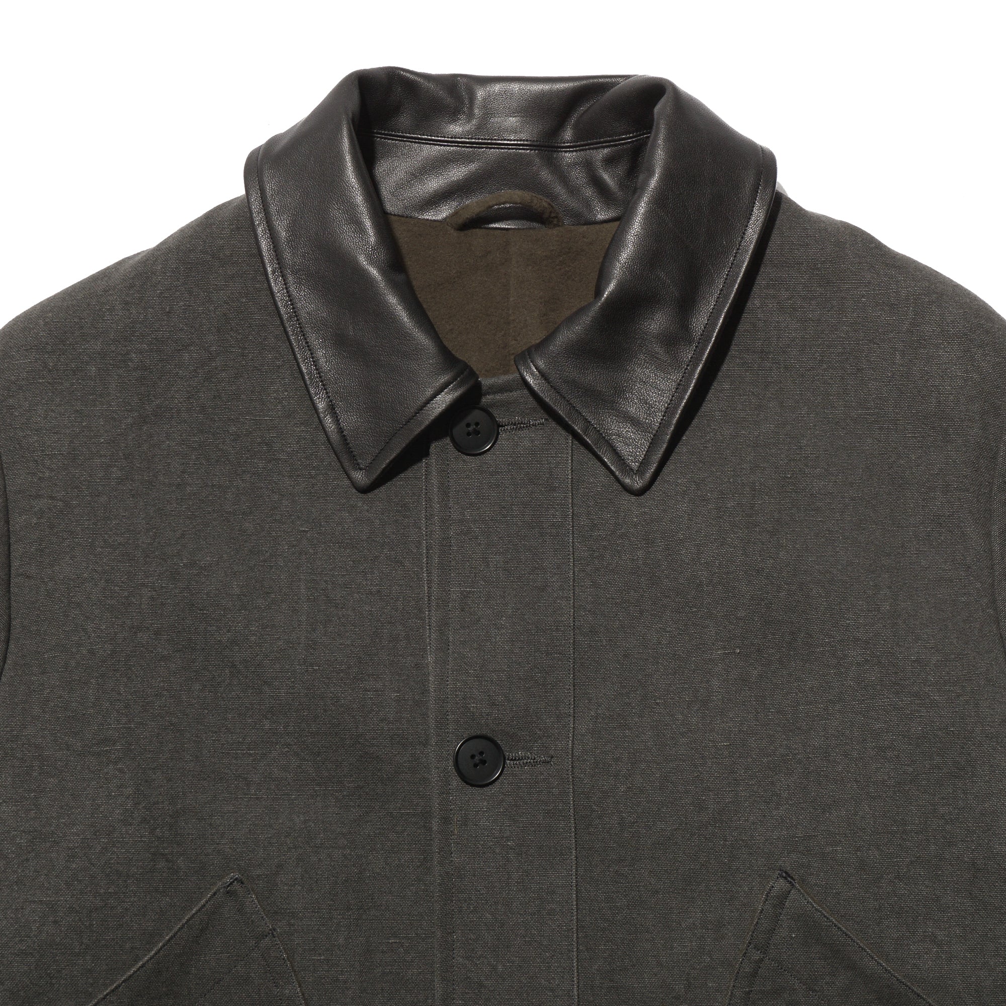 - Woven in a heavy Oxford using cotton warp and thick hemp weft yarns for a dense, durable fabric. Dyed with traditional Japanese pigments—sumi ink and persimmon tannin—and repeatedly washed without tension to create natural softness and volume. Features a sheep leather collar and back cuffs, hunting-style patch pockets and brushed cotton fleece lining.