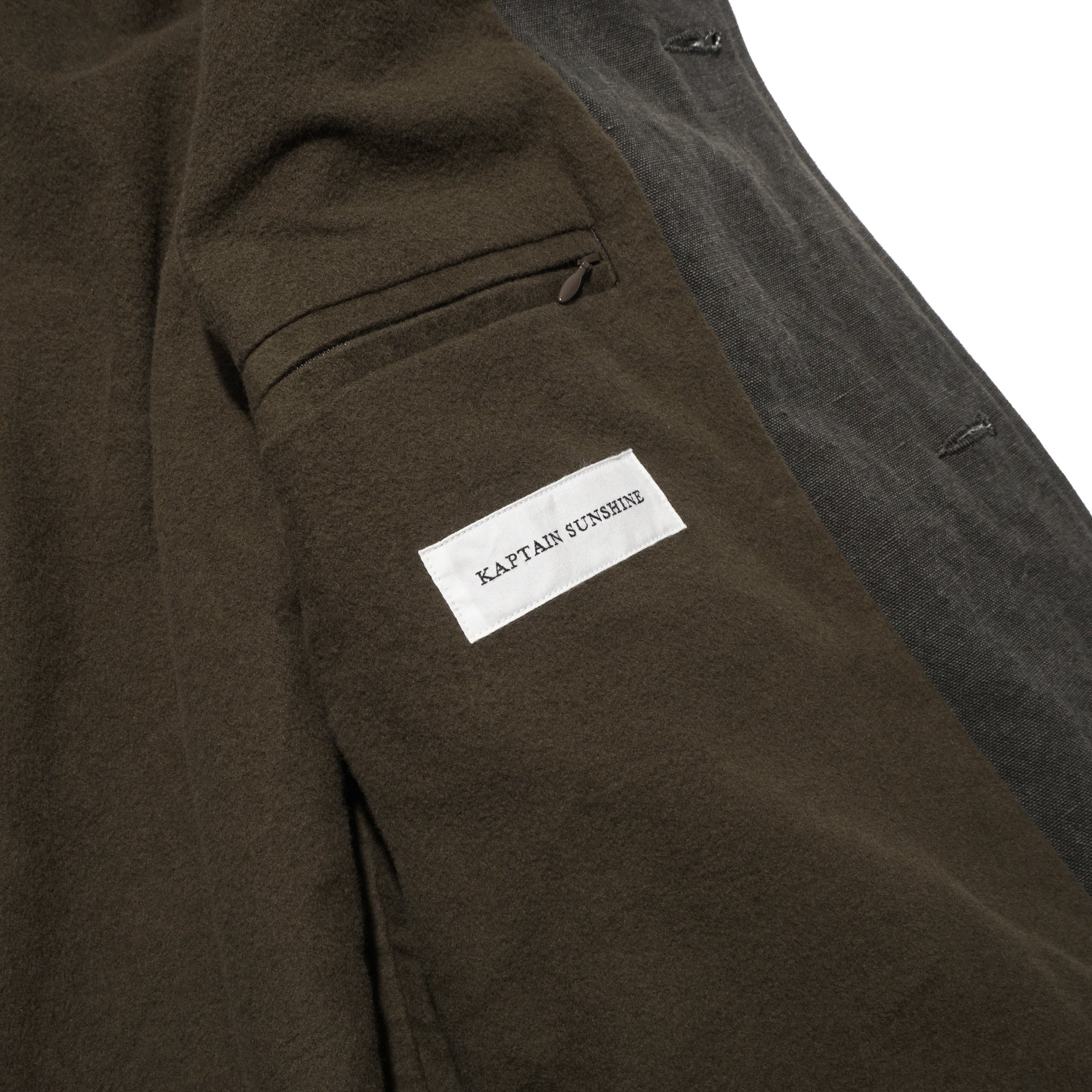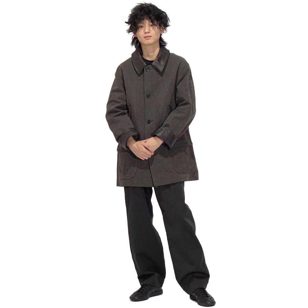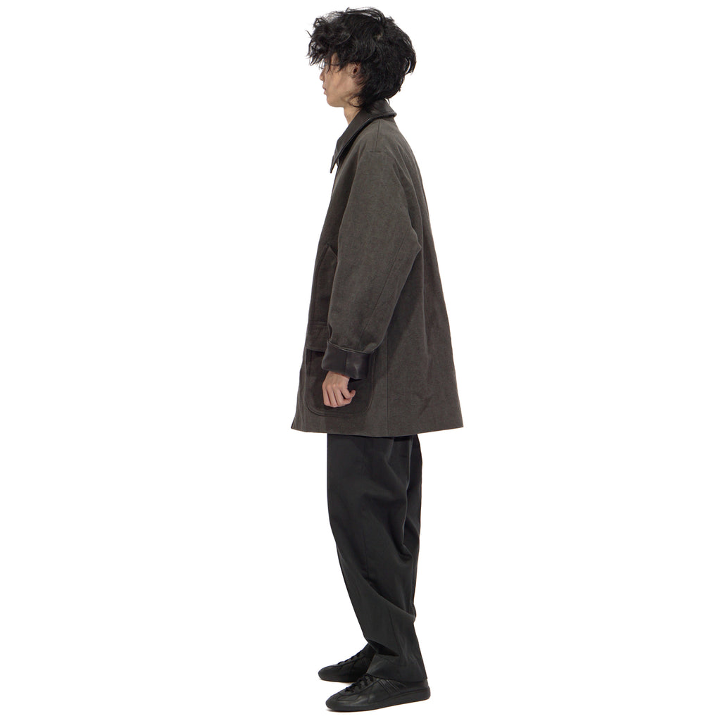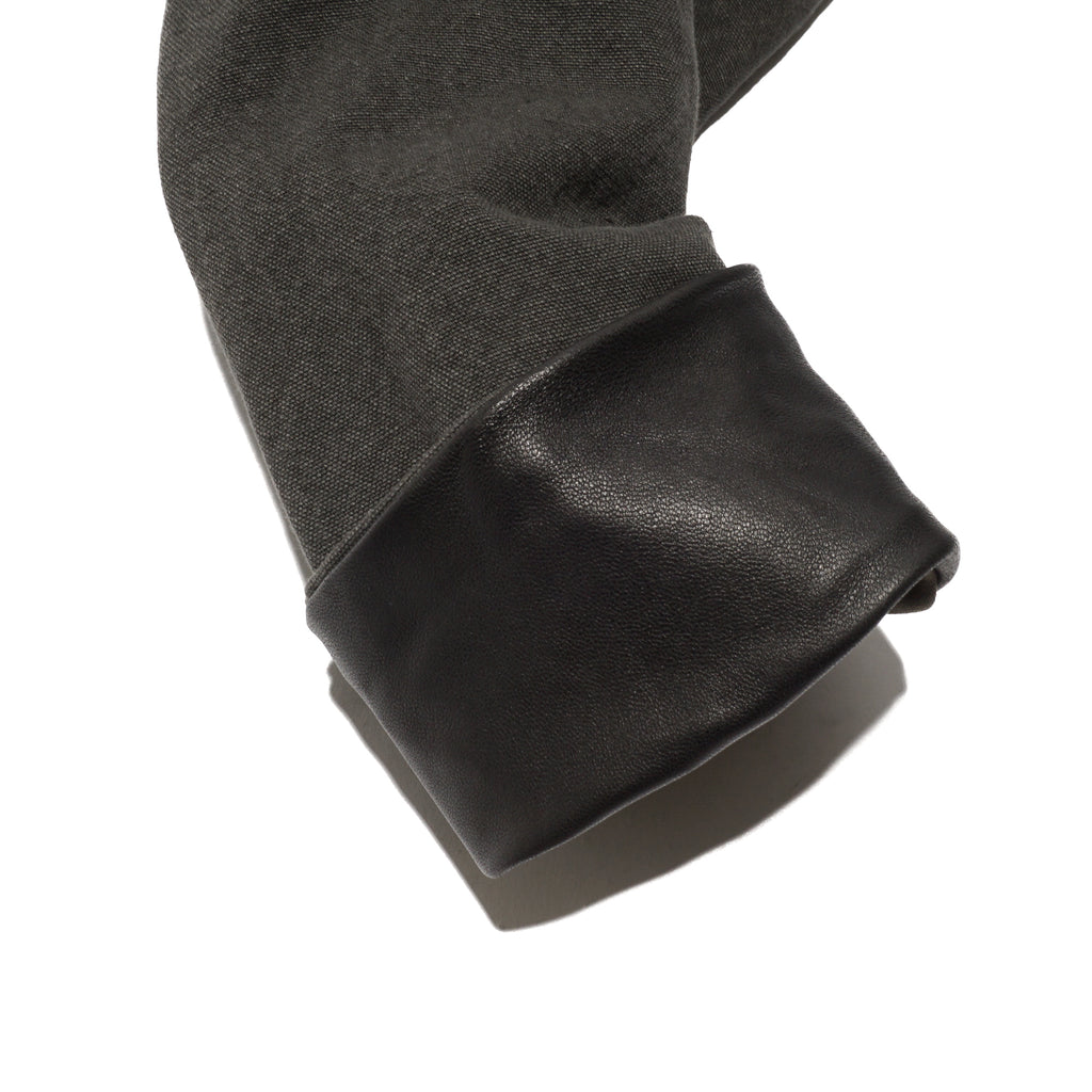 - Woven in a heavy Oxford using cotton warp and thick hemp weft yarns for a dense, durable fabric. Dyed with traditional Japanese pigments—sumi ink and persimmon tannin—and repeatedly washed without tension to create natural softness and volume. Features a sheep leather collar and back cuffs, hunting-style patch pockets and brushed cotton fleece lining.