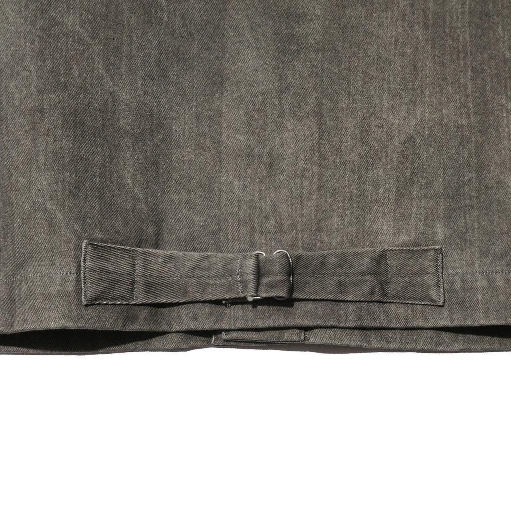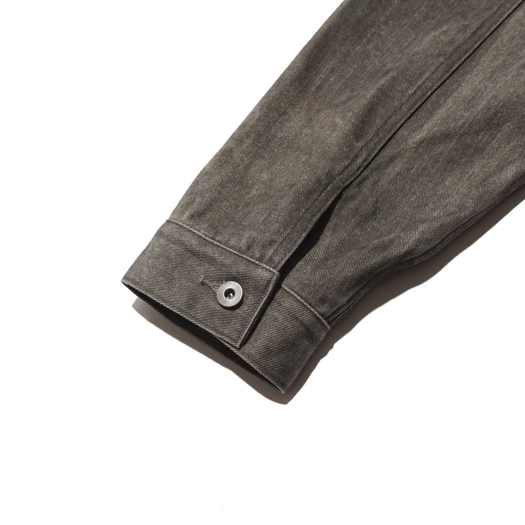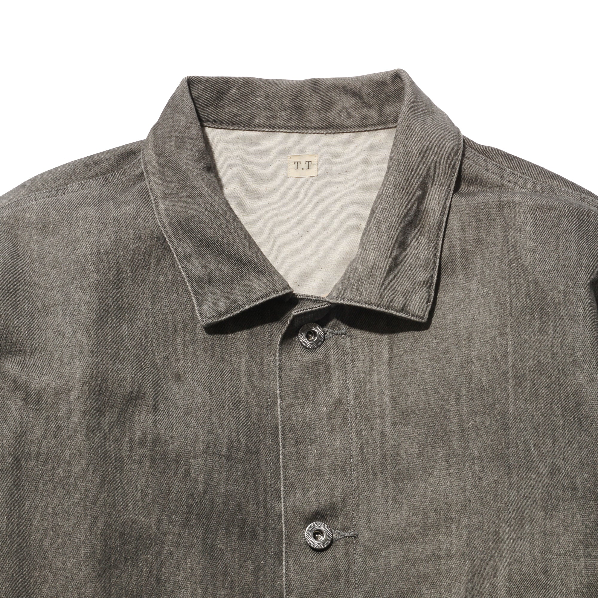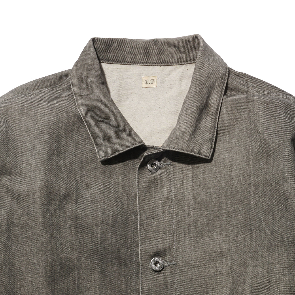 - This jacket takes its inspiration from an unbranded American coverall dating back to 1910, discovered in a coal mine and later added to Takahashi’s collection more than a century later. T.T’s reinterpretation, the Coverall Jacket hand drawn sumi, reflects a deep fascination with vintage workwear. The design draws from the marbling effects of sumi ink artworks created by Kamisoe, a Kyoto-based karakami workshop. Cotton fabric is hand-painted with sumi ink by a Yuzen dyeing artisan, capturing the subtle nuances of brushstrokes; no two pieces are the same, as each displays unique variations in shading and line. Completing the construction, the buttons and back parts are forged from iron, left uncoated to naturally develop a distinctive patina and aged beauty over time.
